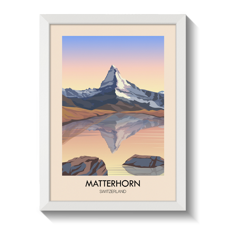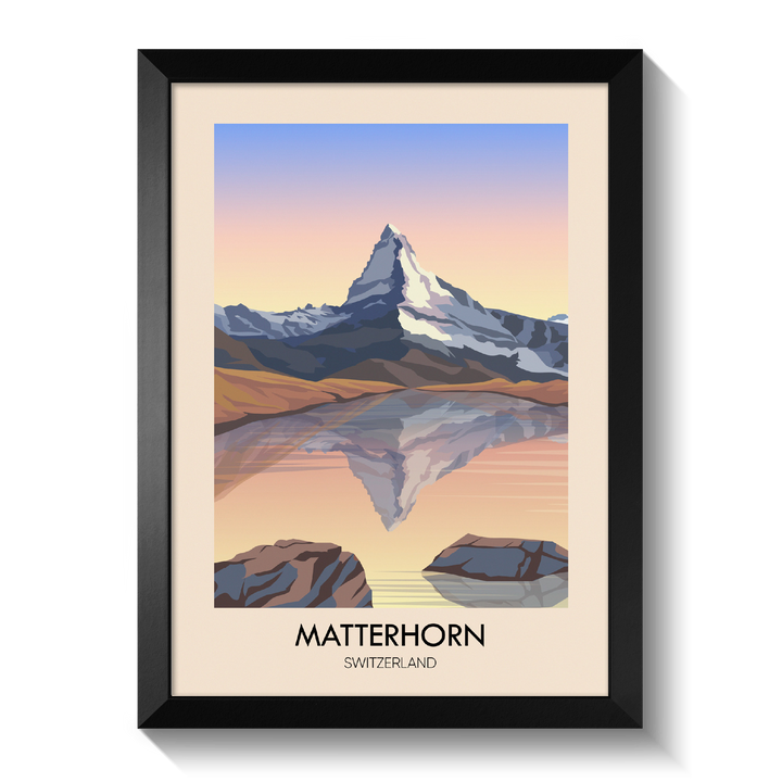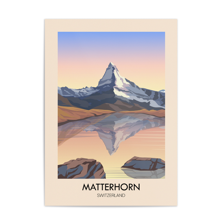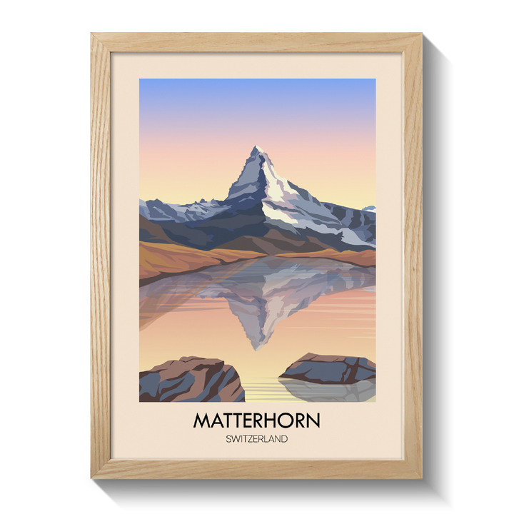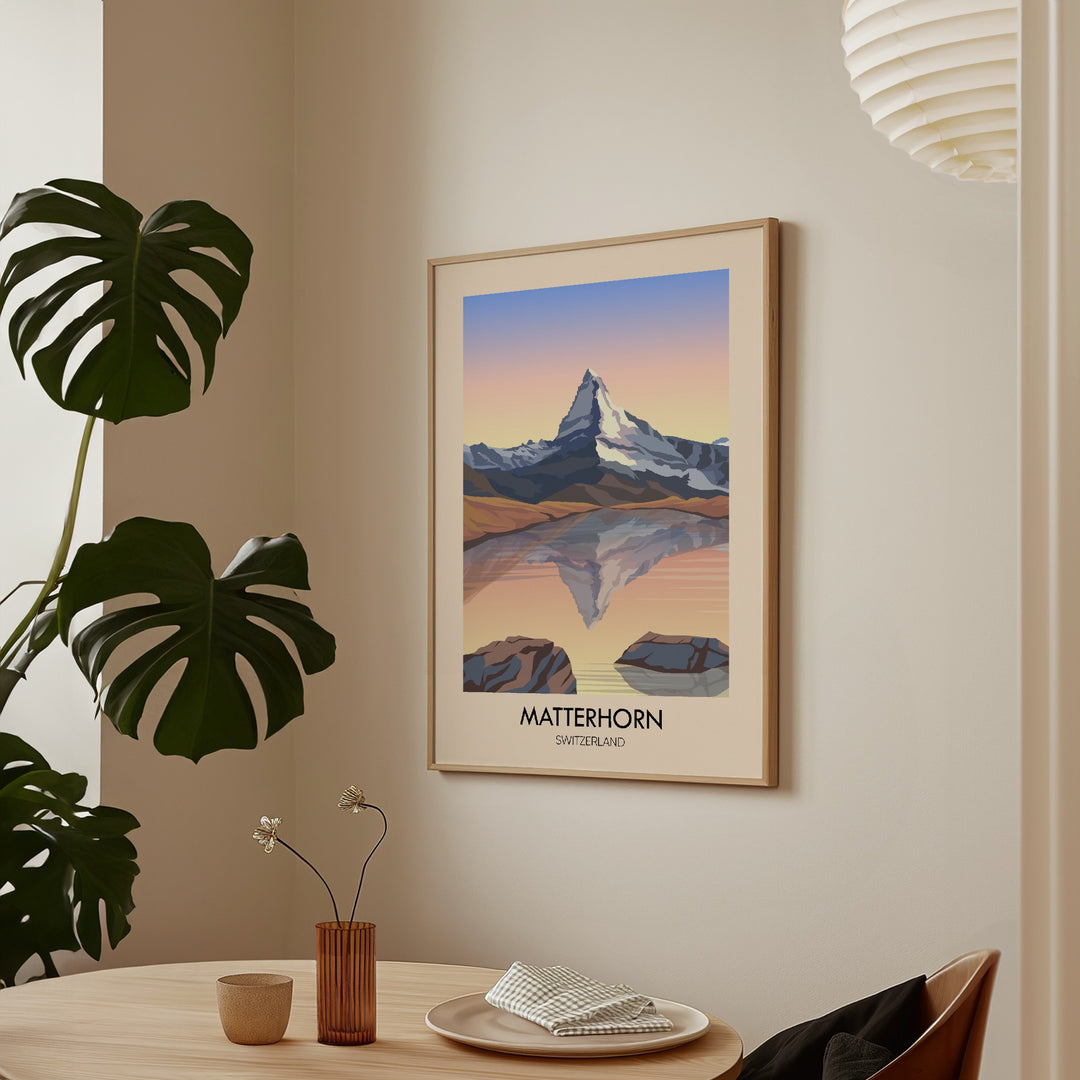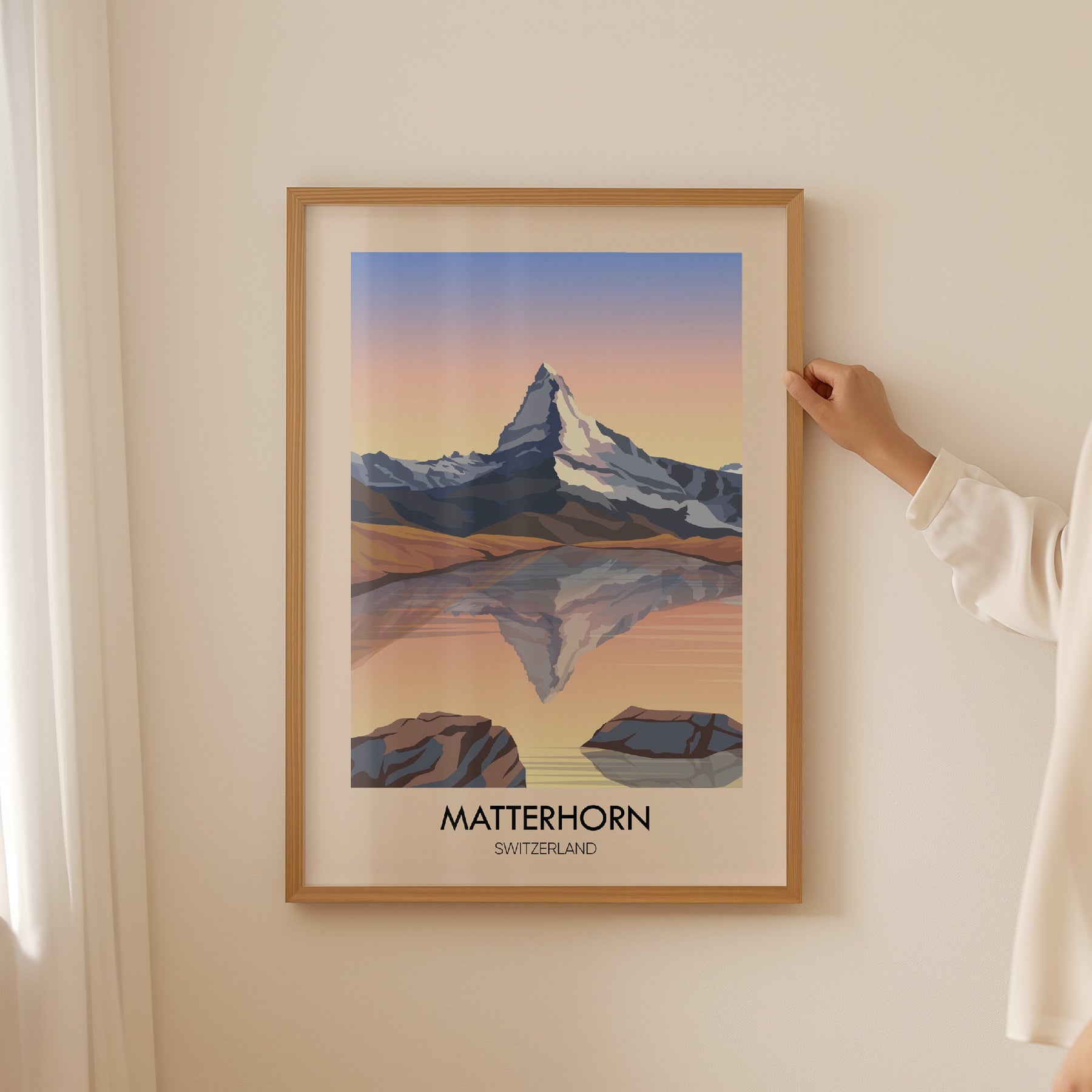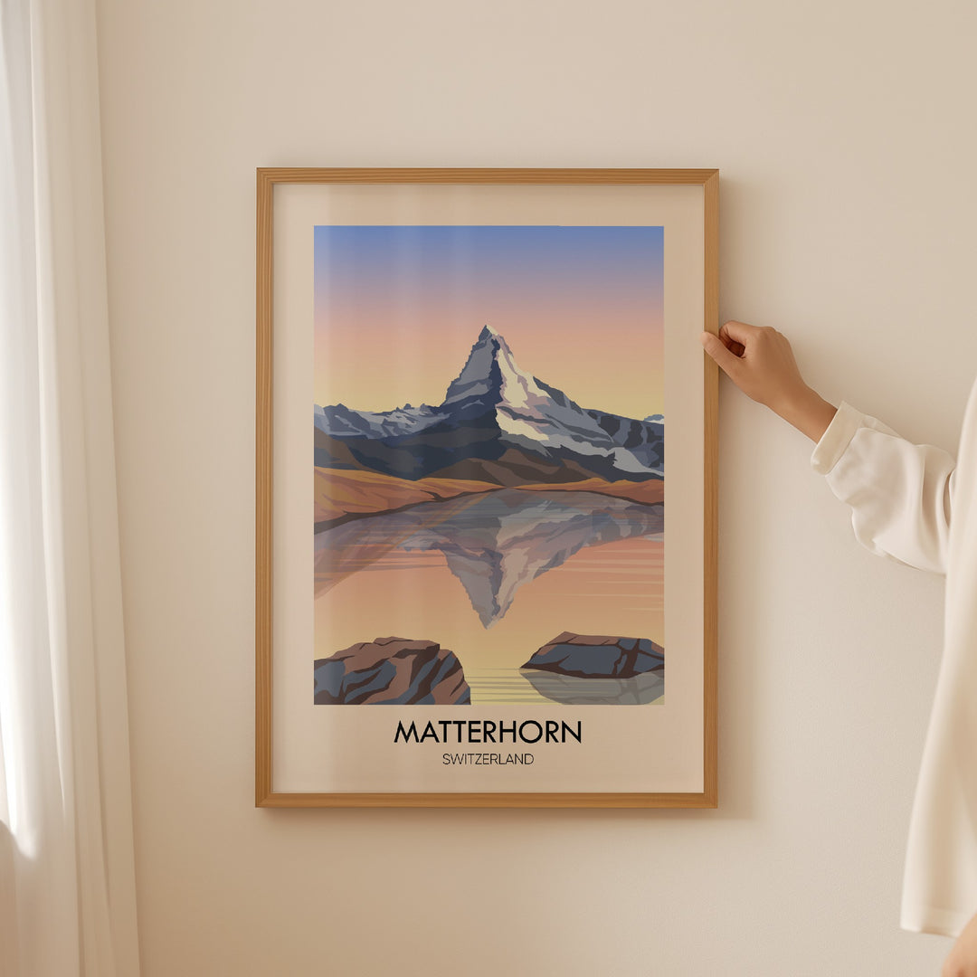 An original travel poster featuring famous Matterhorn mountain. The Matterhorn is one of the most iconic and recognisable mountains in the Alps, straddling the frontier between Switzerland and Italy.