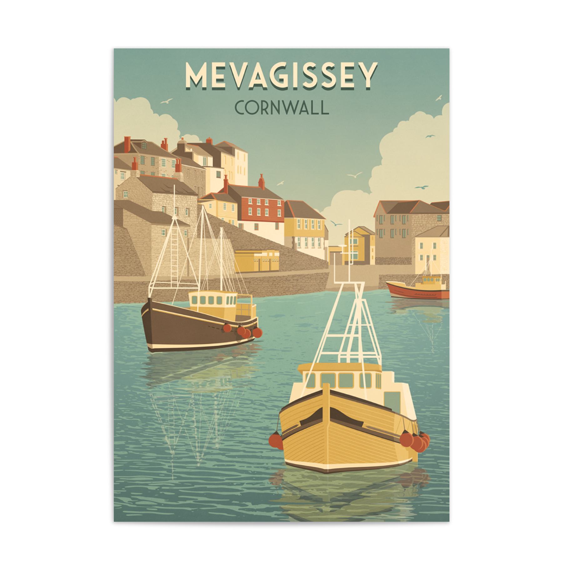 Original travel poster featuring the picturesque harbour town of Mevagissey in Cornwall.