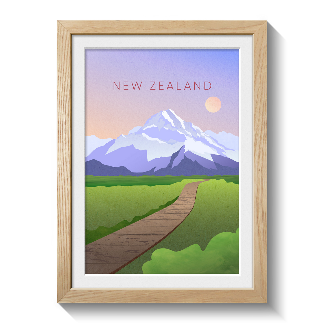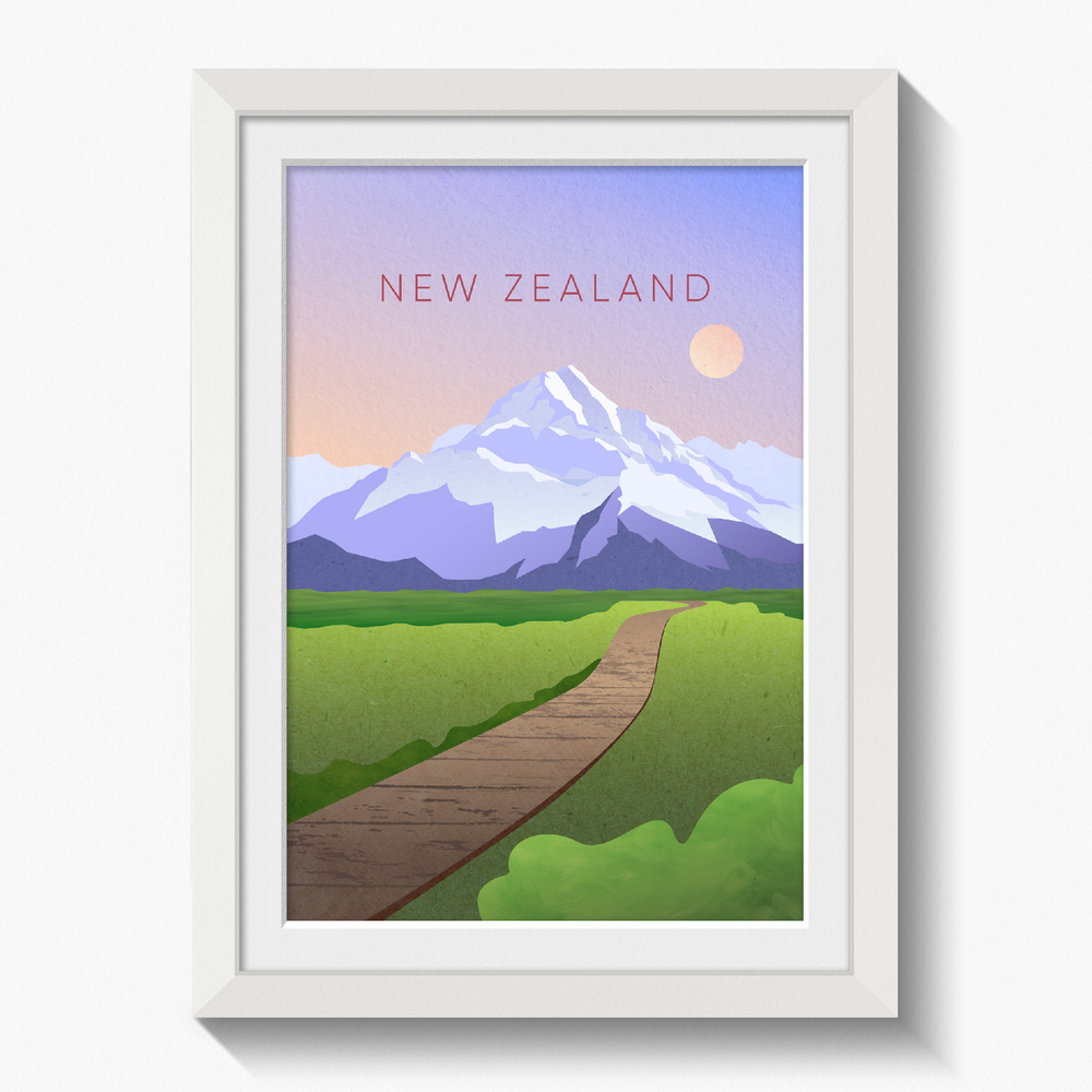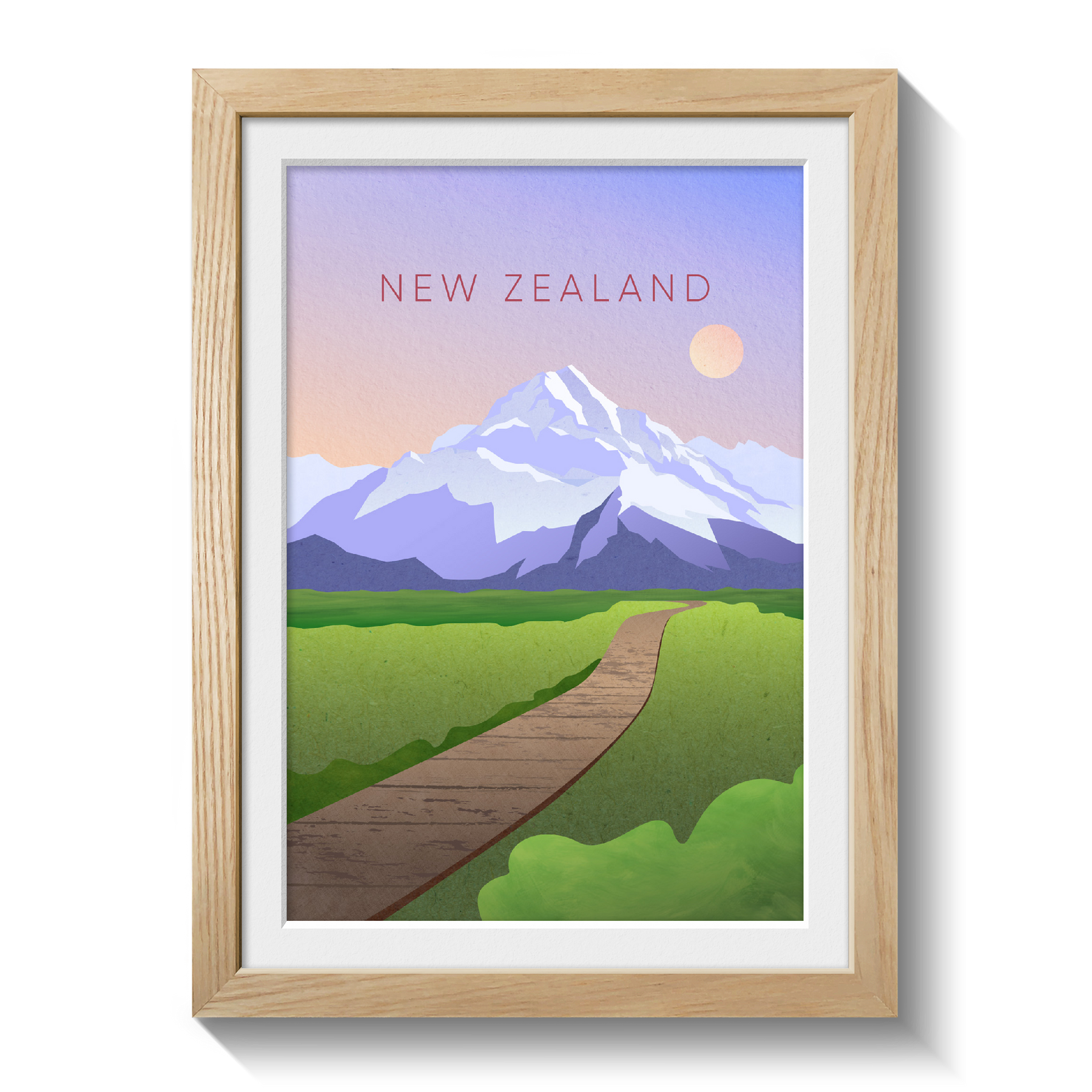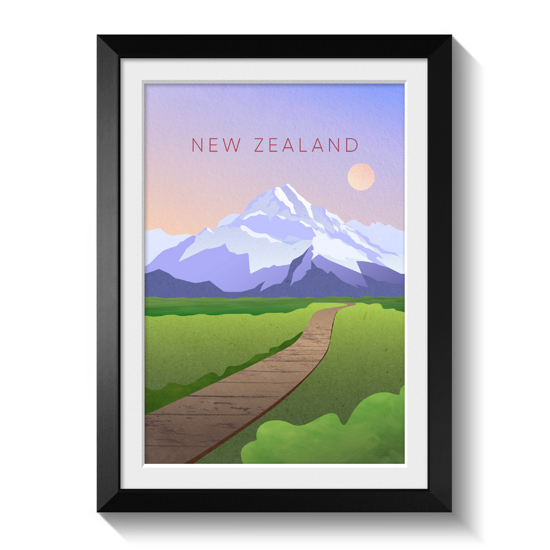 New Zealand is famous for its indigenous Maori culture, picturesque landscapes, Rugby and having more sheep than people. You can see the iconic Mount Cook in the poster which is New Zealands highest mountain.