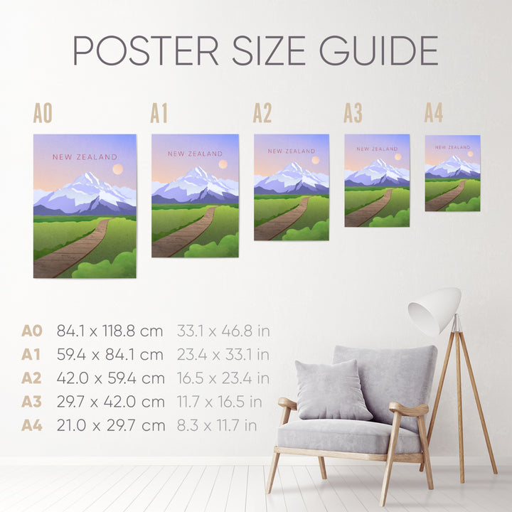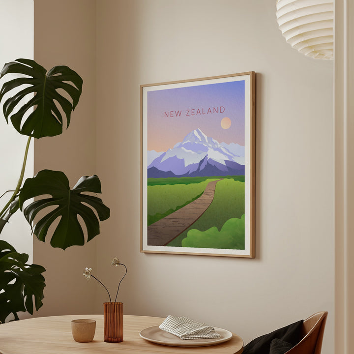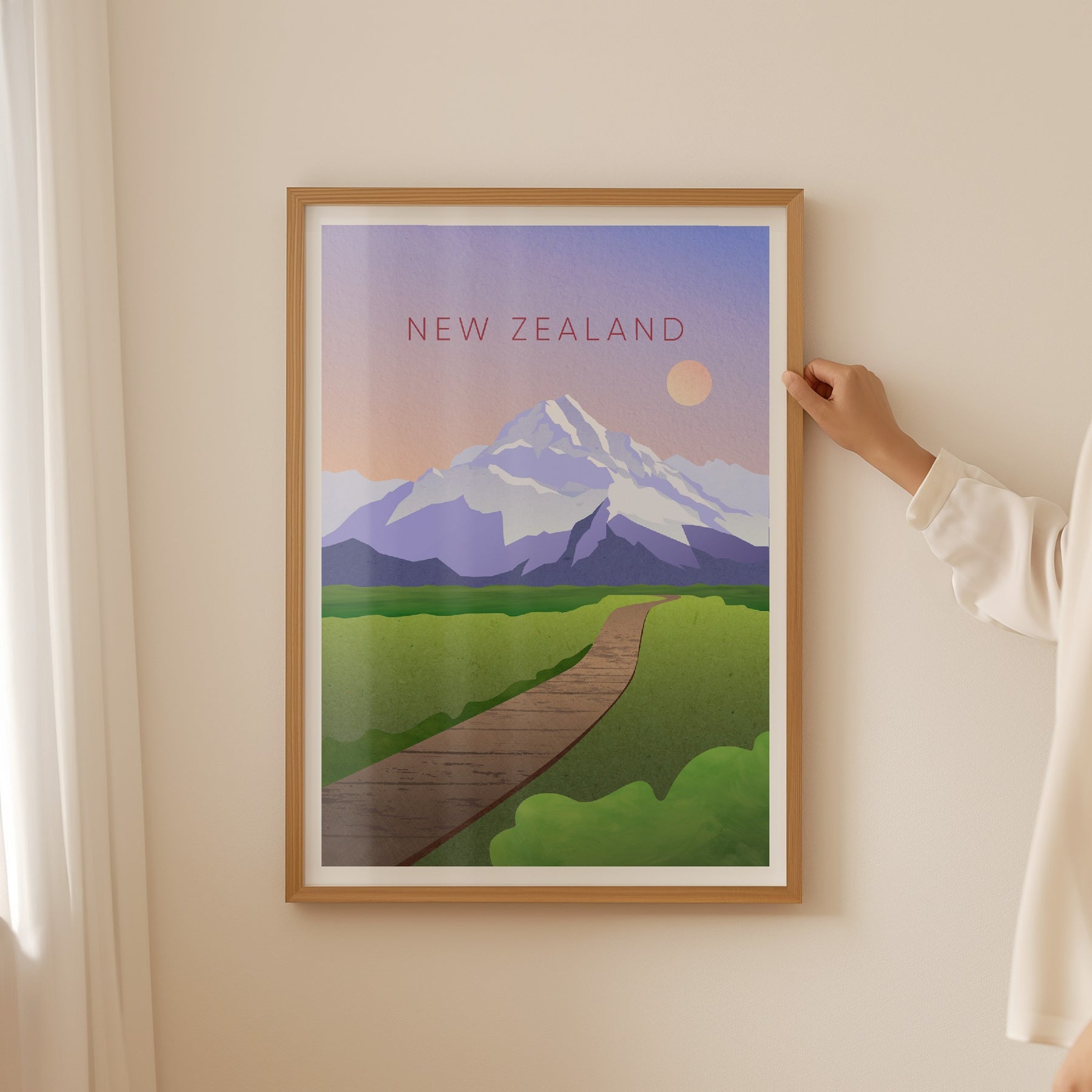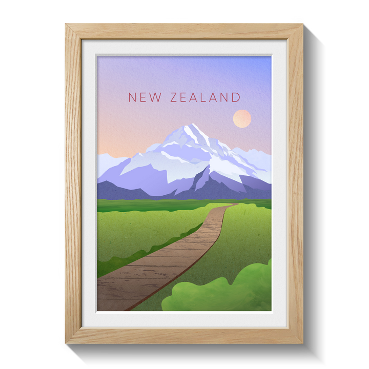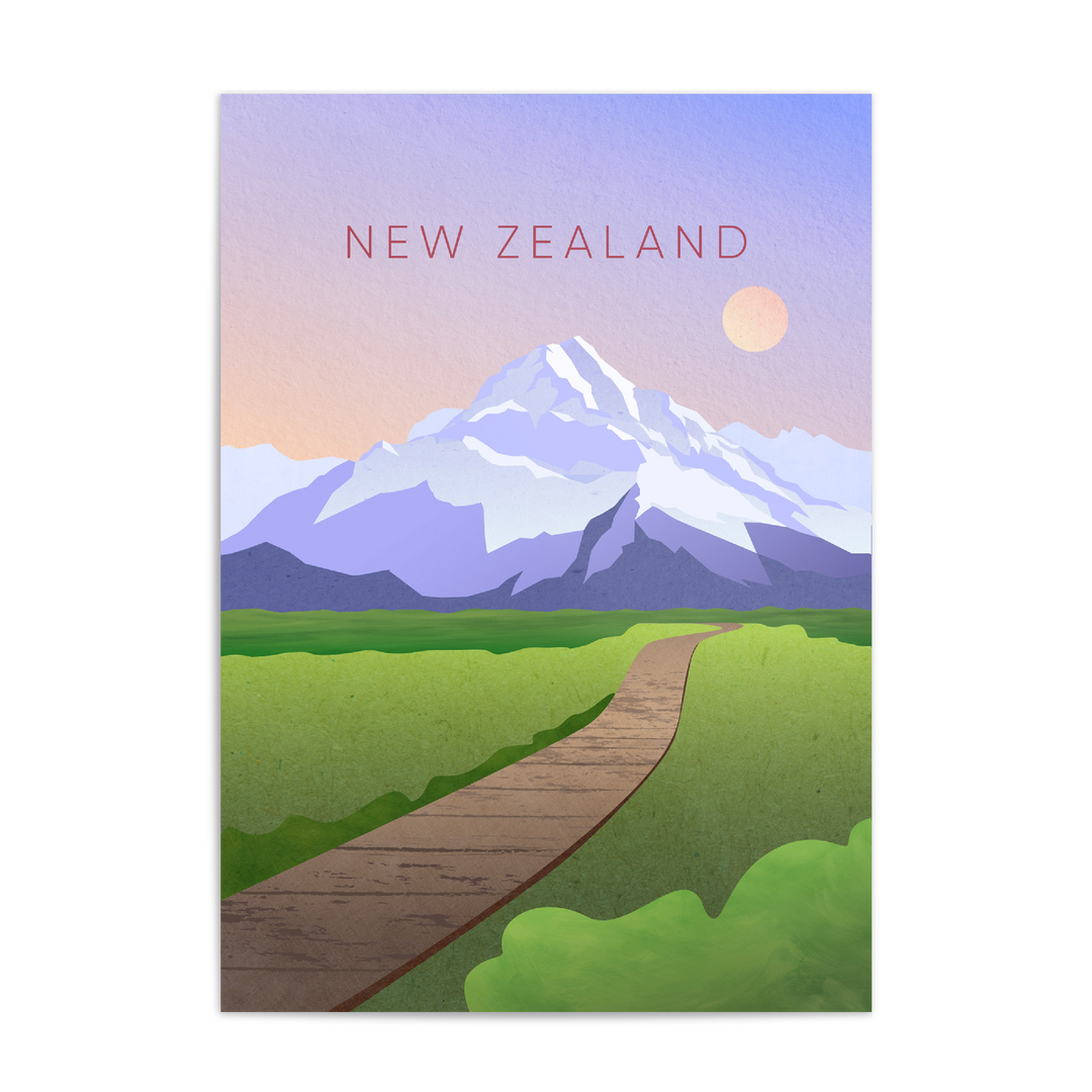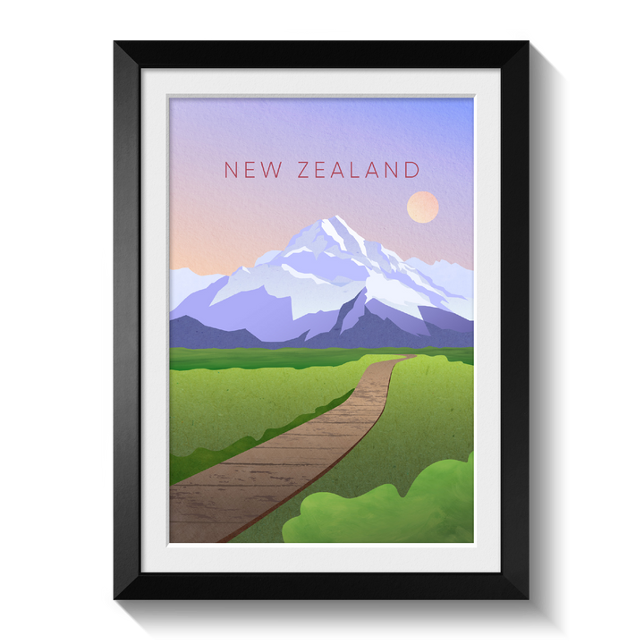 New Zealand is famous for its indigenous Maori culture, picturesque landscapes, Rugby and having more sheep than people. You can see the iconic Mount Cook in the poster which is New Zealands highest mountain.