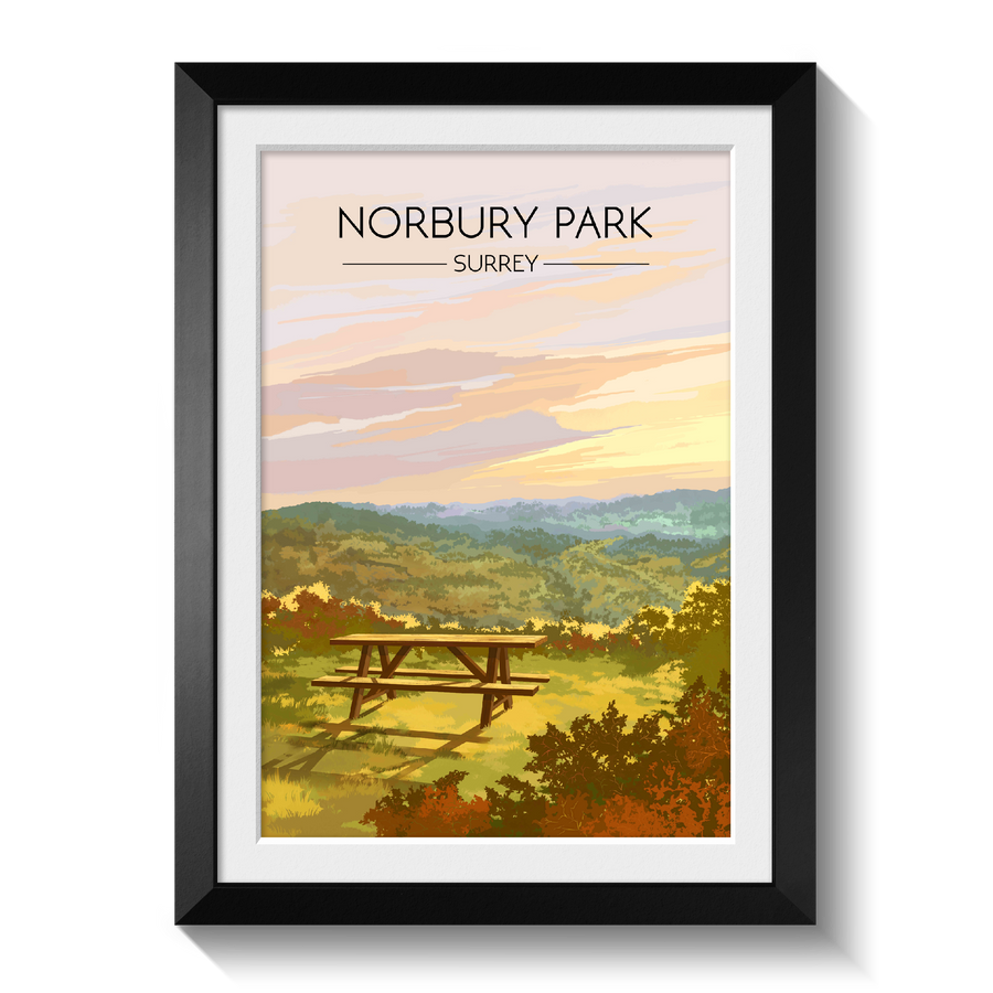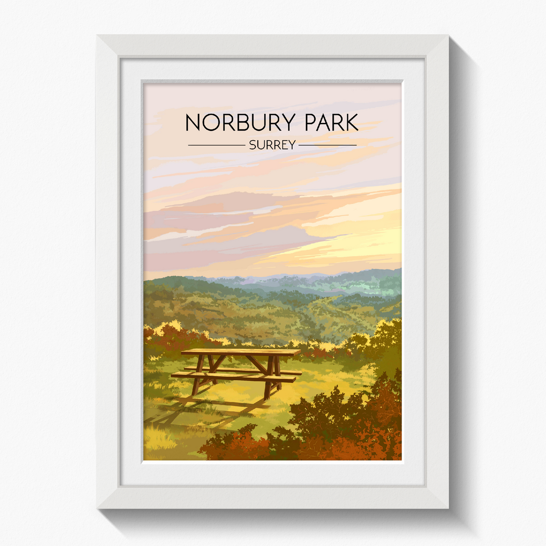 An original travel poster featuring the much loved Norbury Park in Surrey, close to Leatherhead, Mickleham and Dorking.