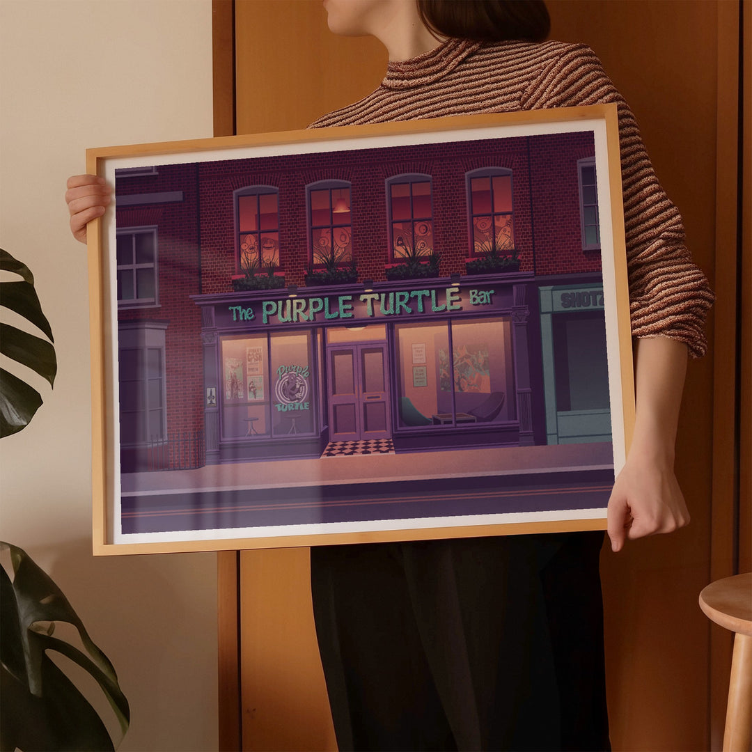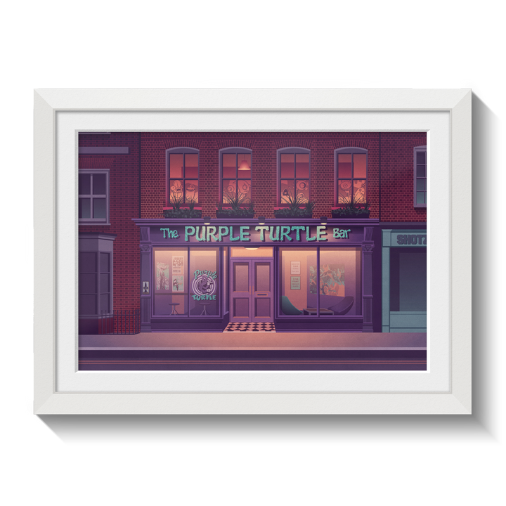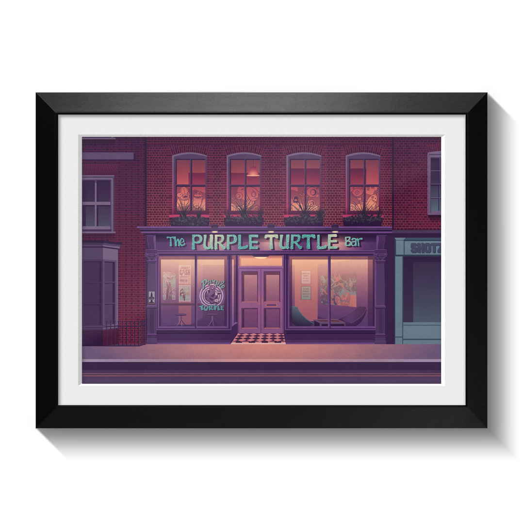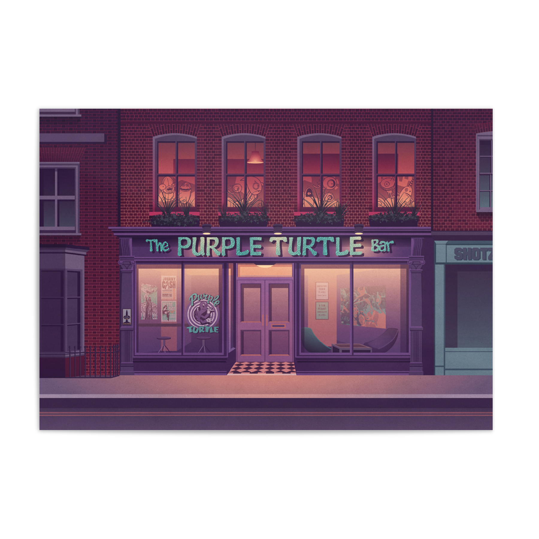 An original travel poster featuring iconic music venue The Purple Turtle Bar in Reading. This long standing bar prides its self on showcasing local talent and has become a right of passage for local Reading residents and Reading University Students alike.