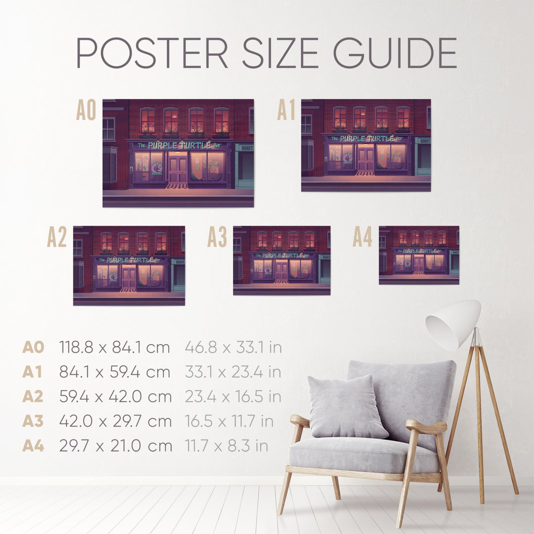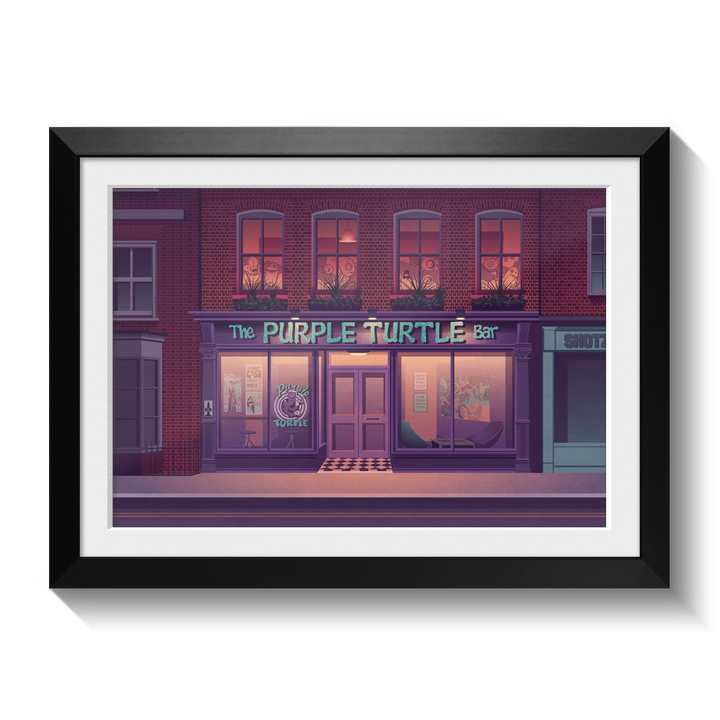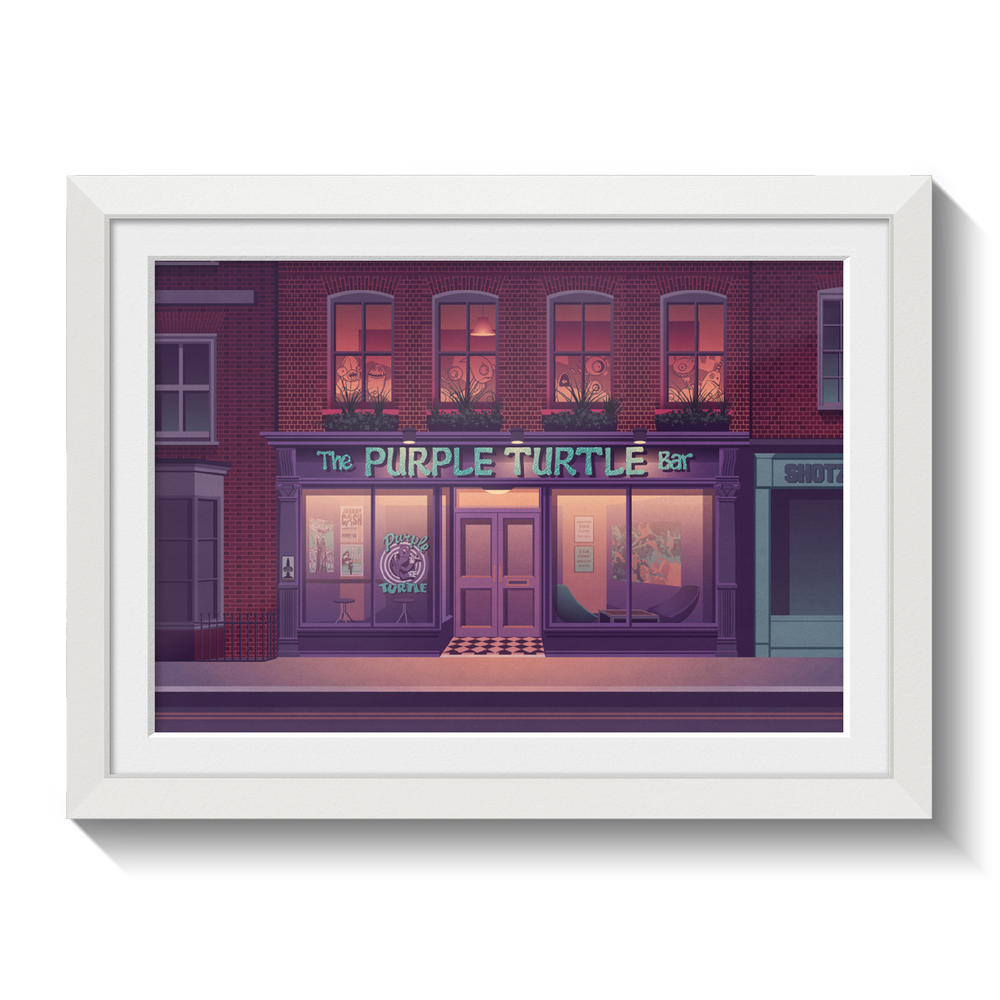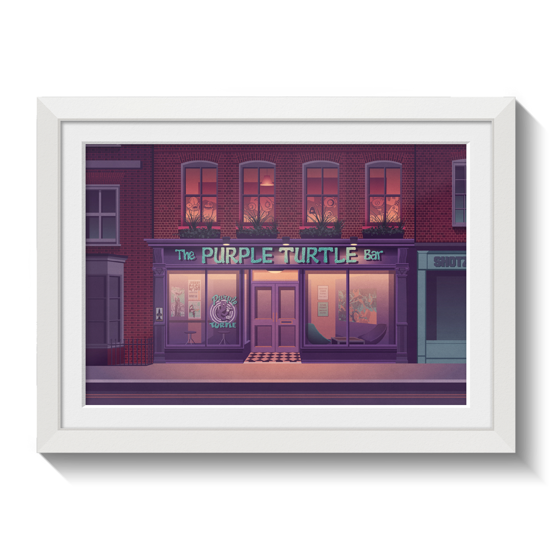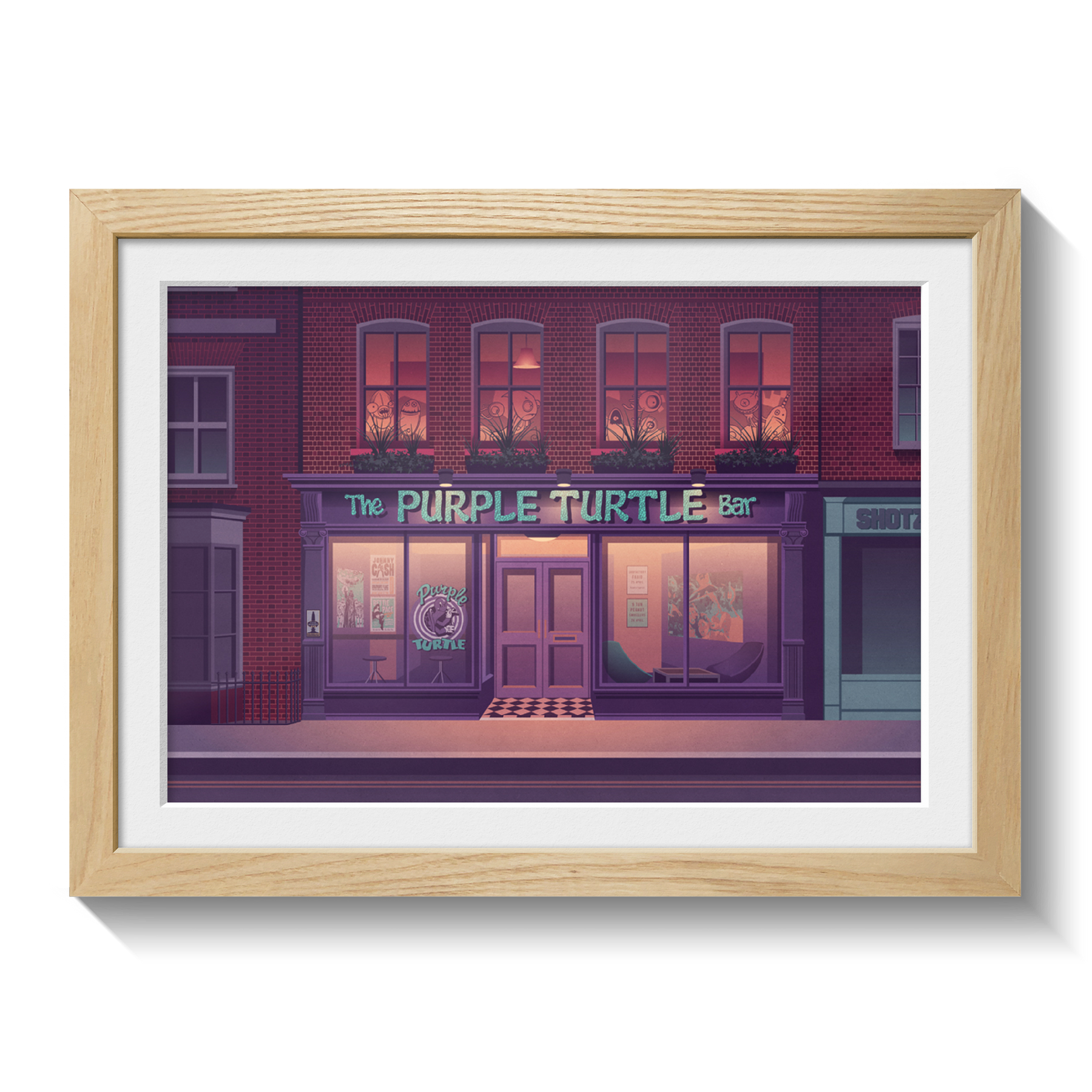 An original travel poster featuring iconic music venue The Purple Turtle Bar in Reading. This long standing bar prides its self on showcasing local talent and has become a right of passage for local Reading residents and Reading University Students alike.