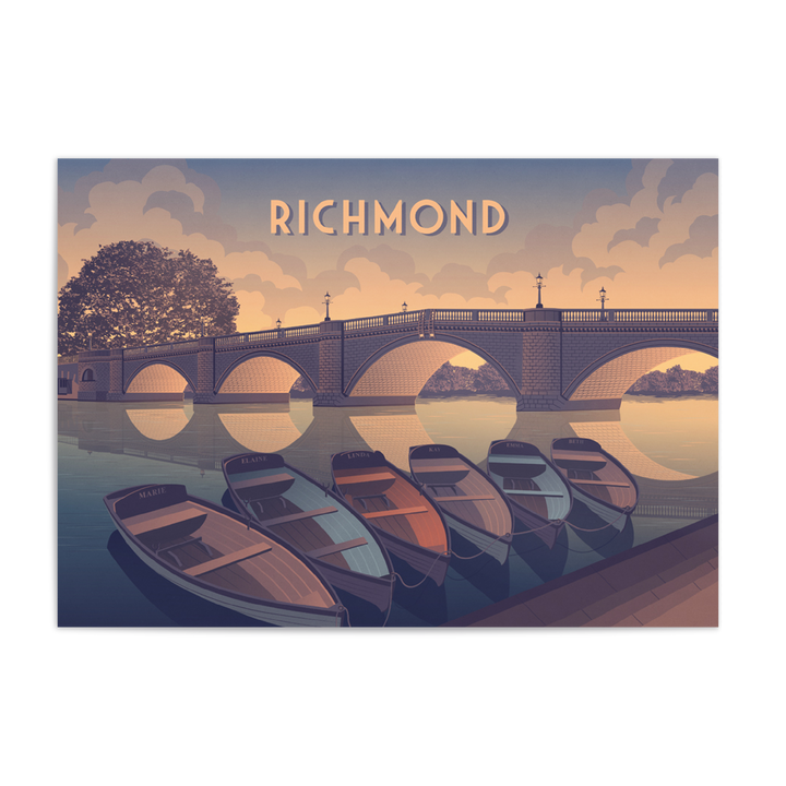 This vintage style travel poster features London's Richmond Bridge which spans the River Thames at Richmond to Twickenham.