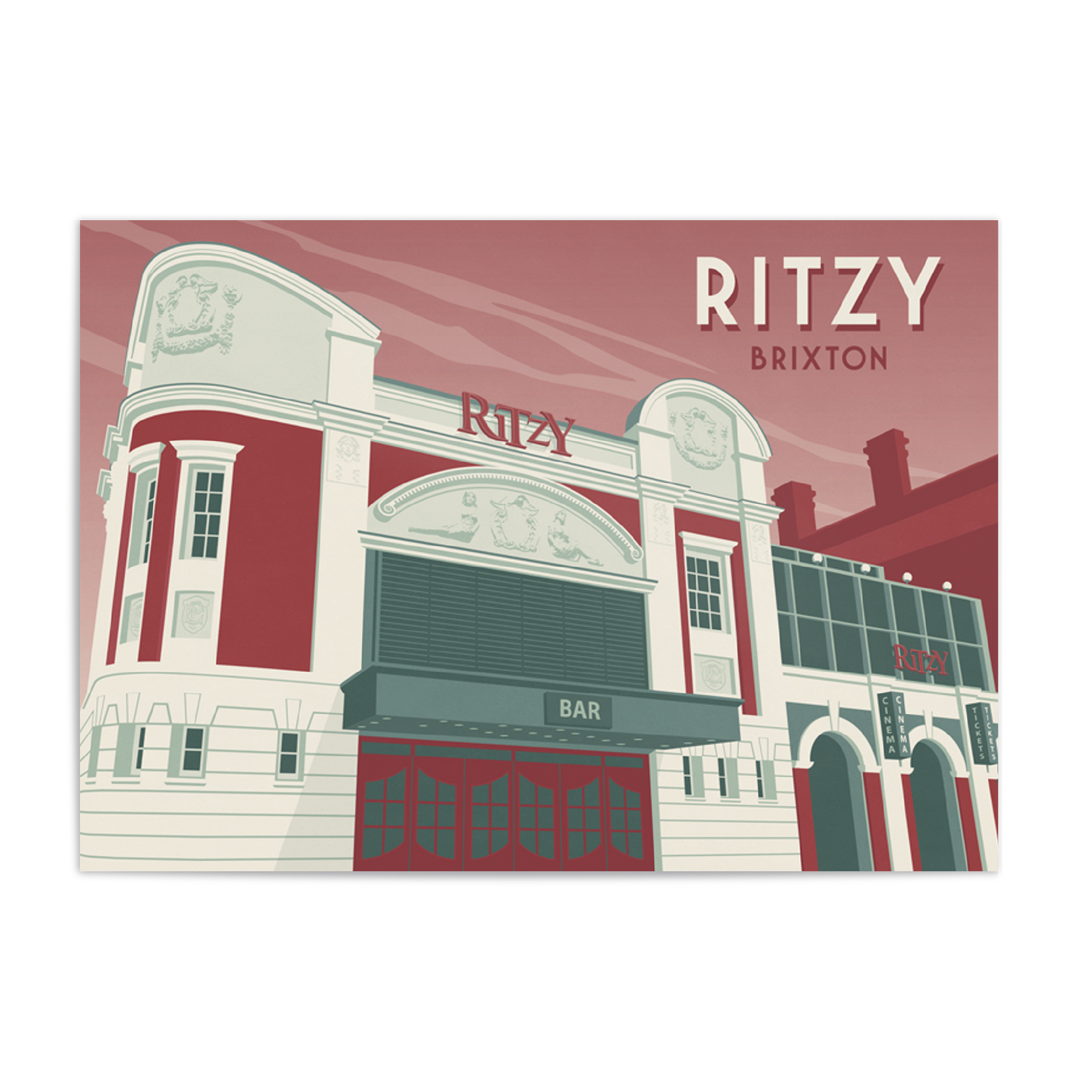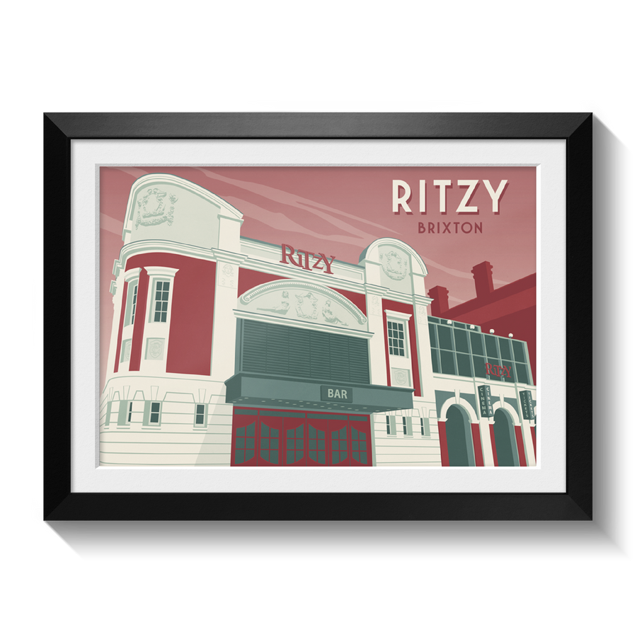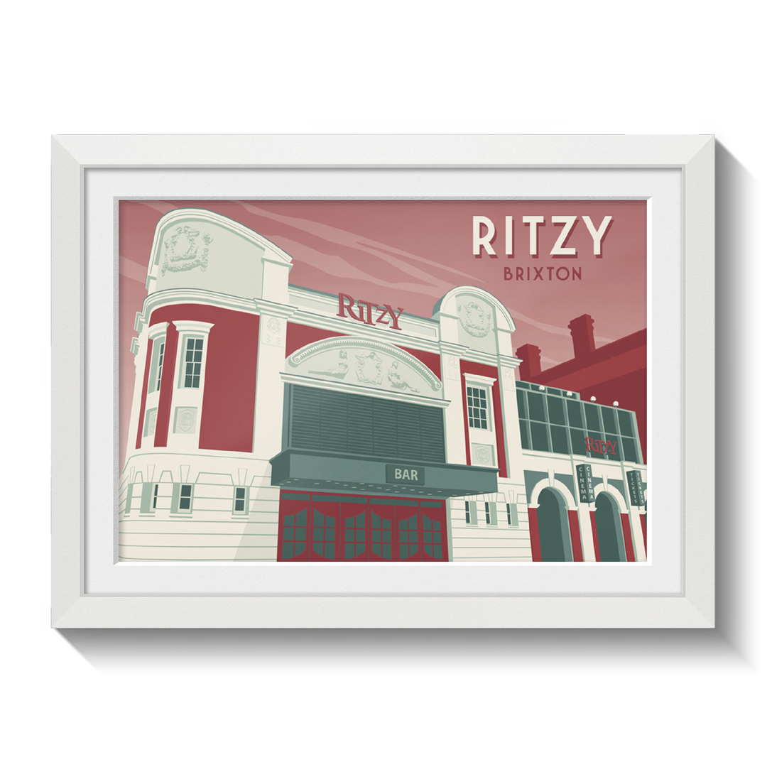 An art deco style architectural print of the iconic Ritzy Picturehouse in Brixton, South London.