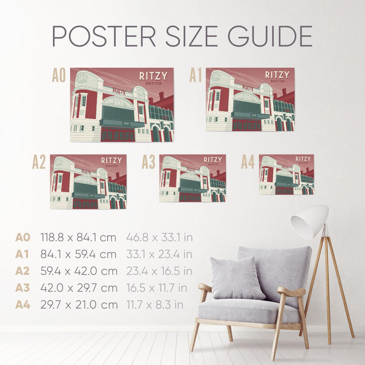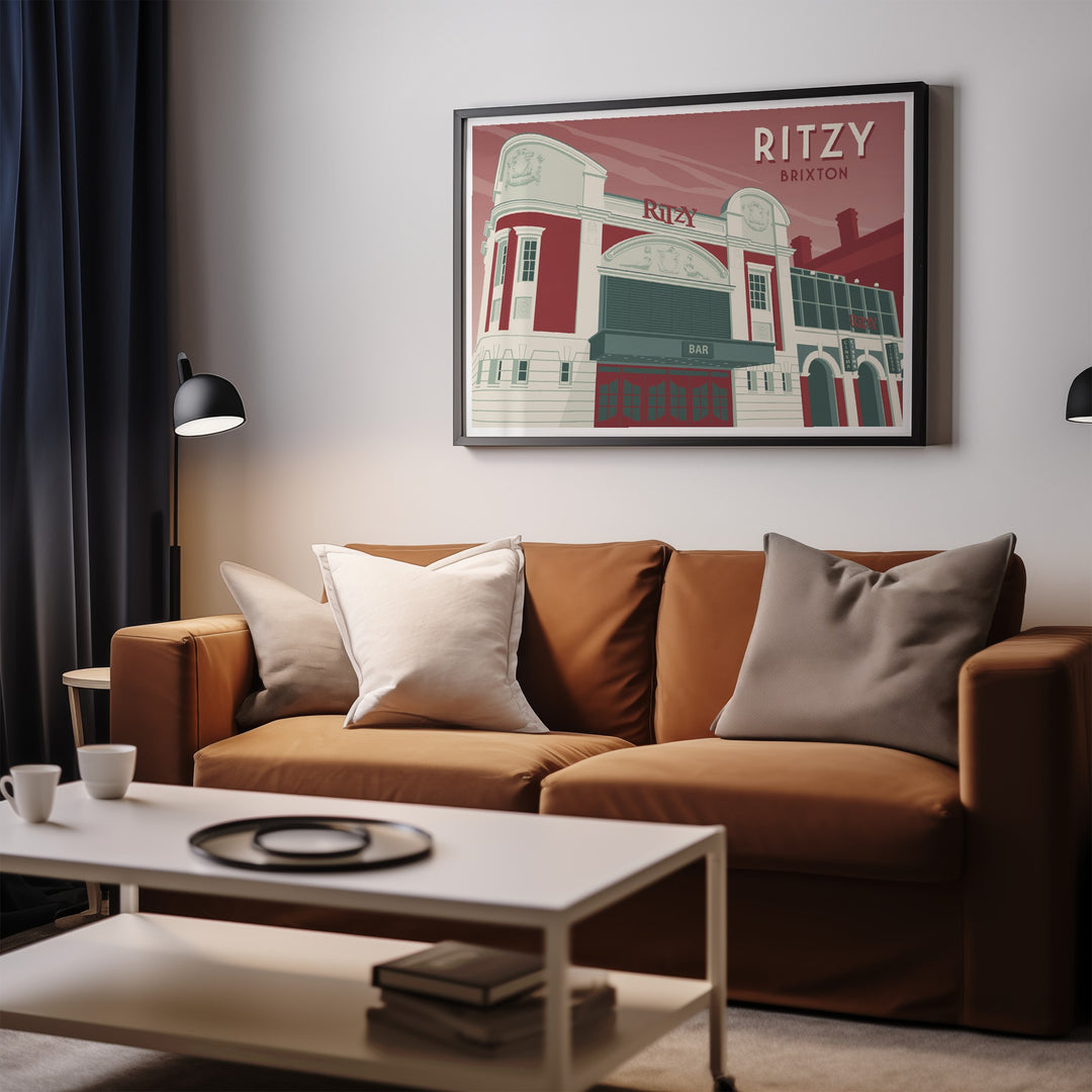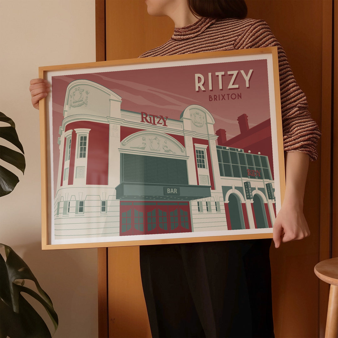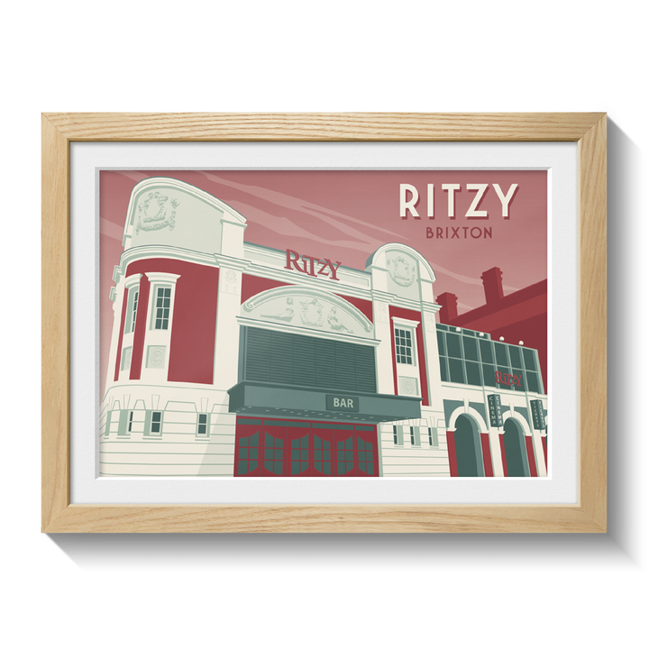 An art deco style architectural print of the iconic Ritzy Picturehouse in Brixton, South London.