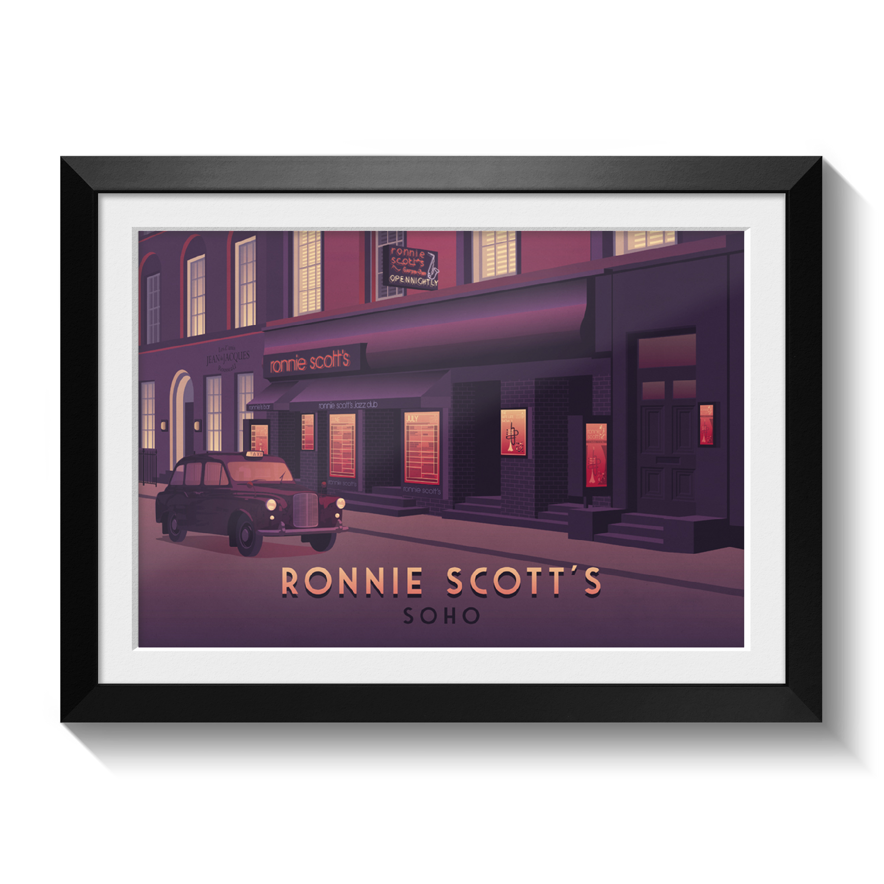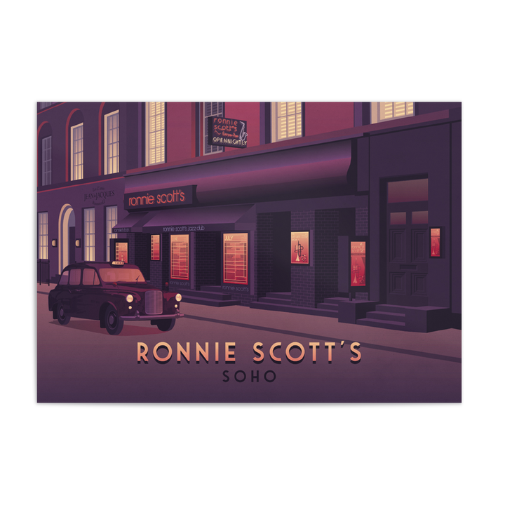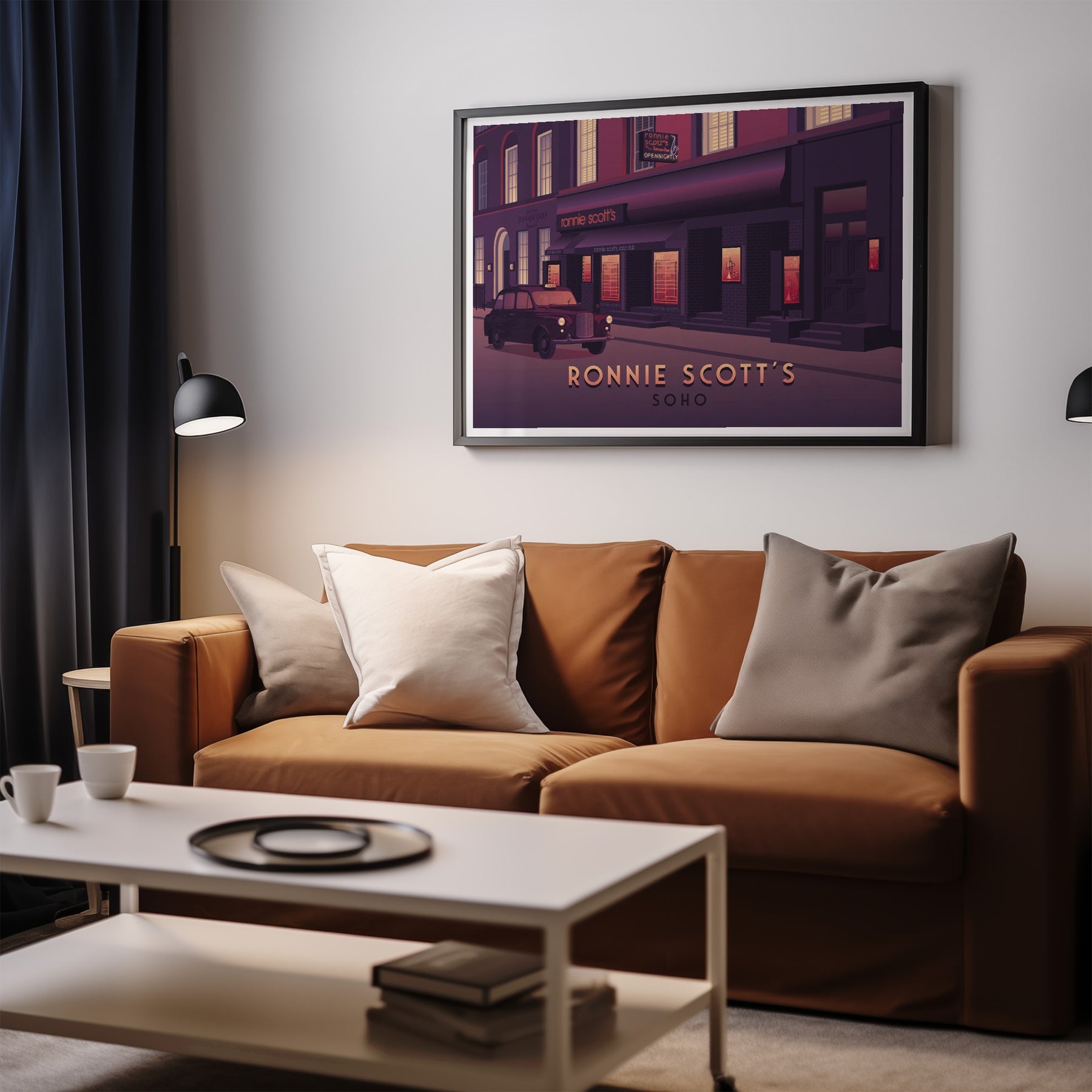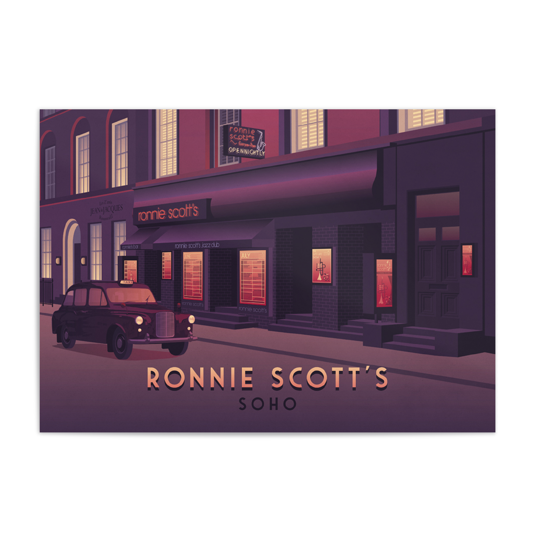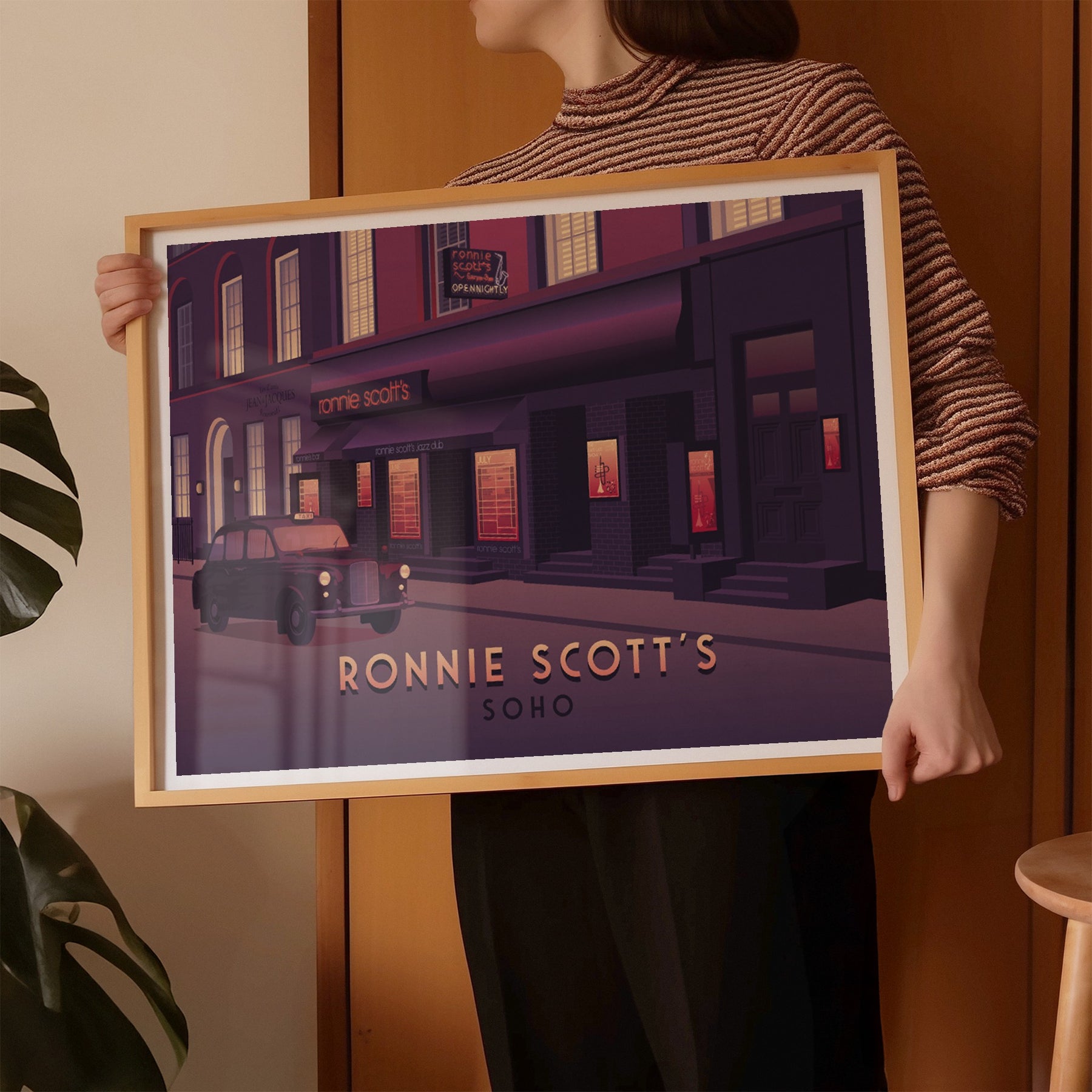An original travel poster featuring the legendary Ronnie Scott's Jazz Club, situated in the heart of Soho in London's West End.