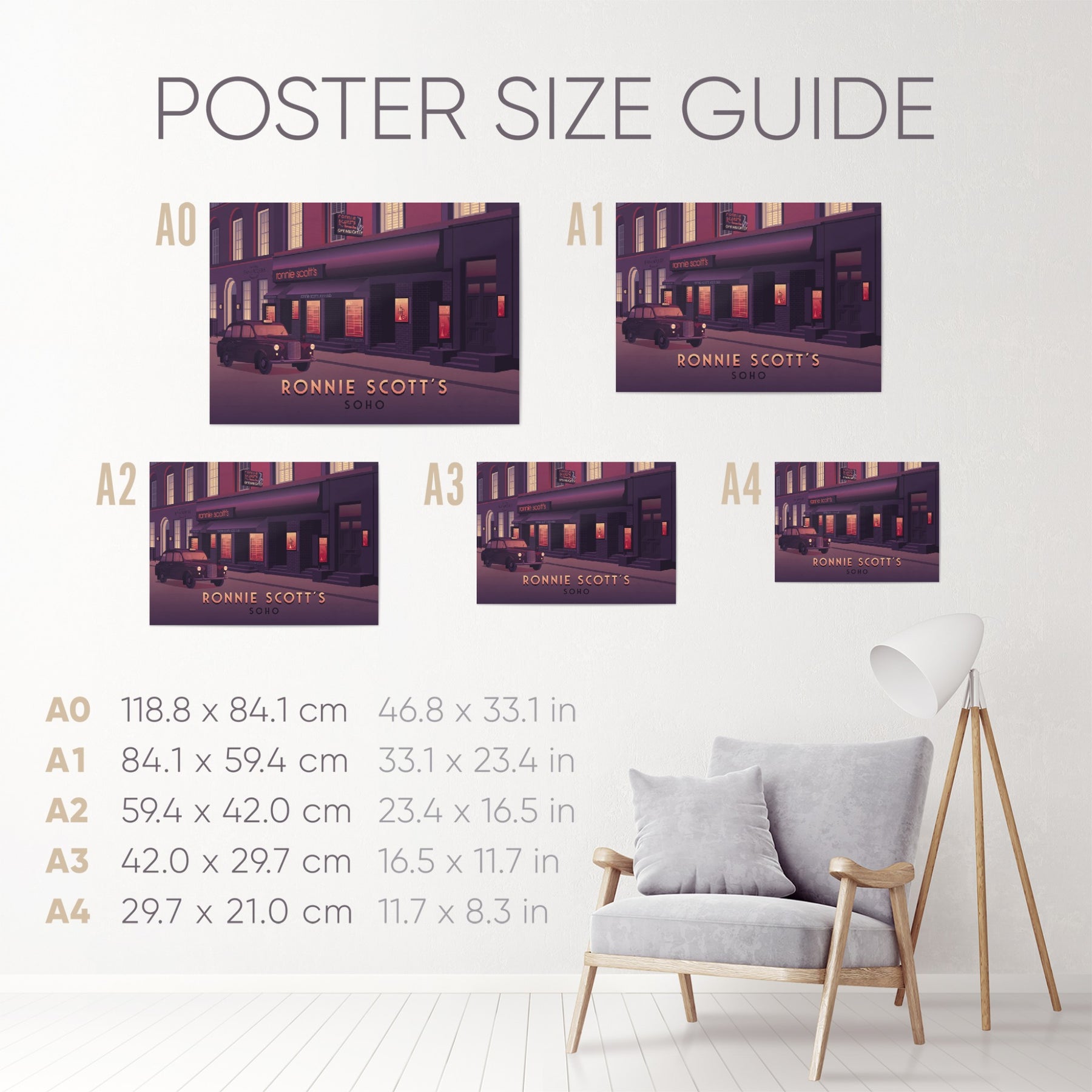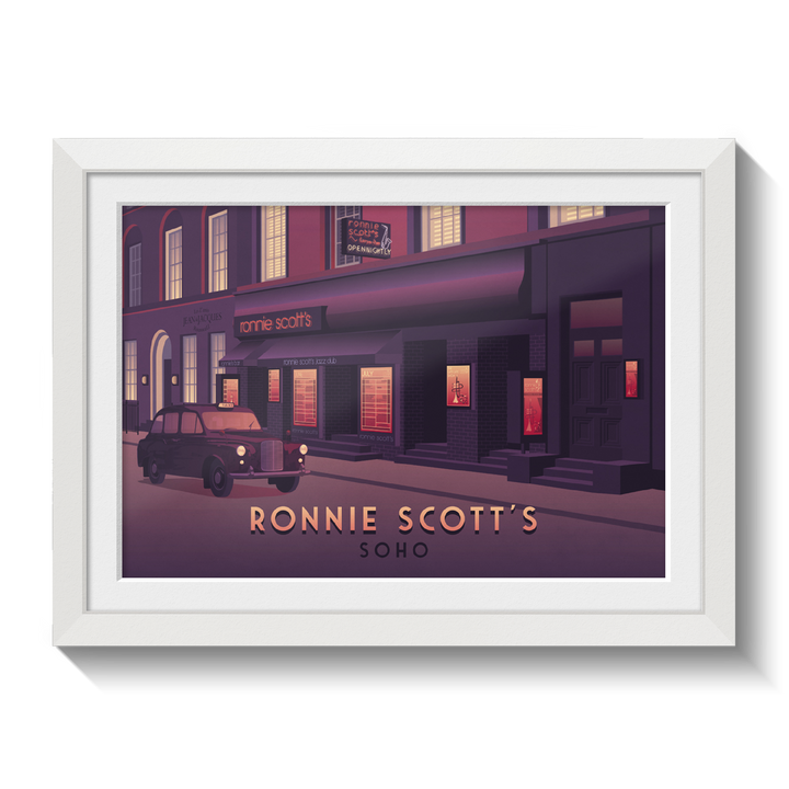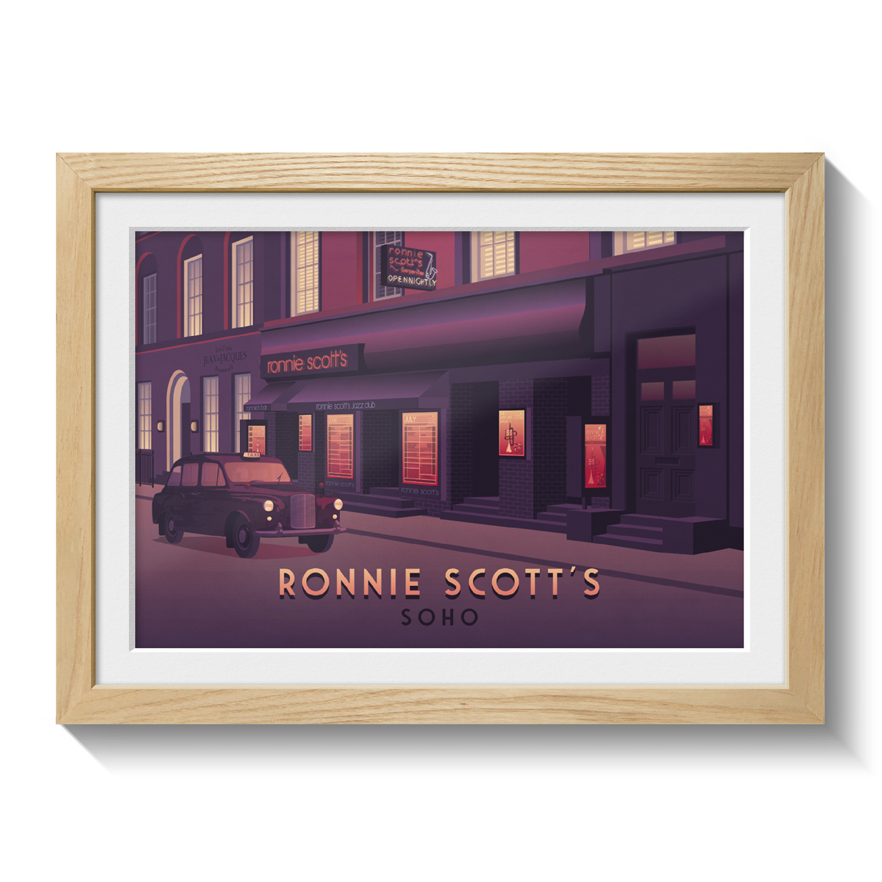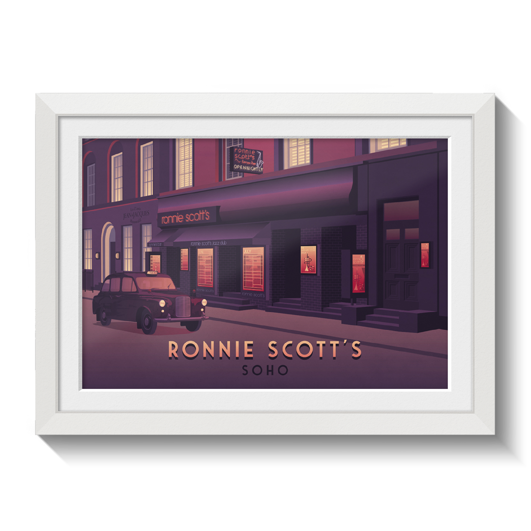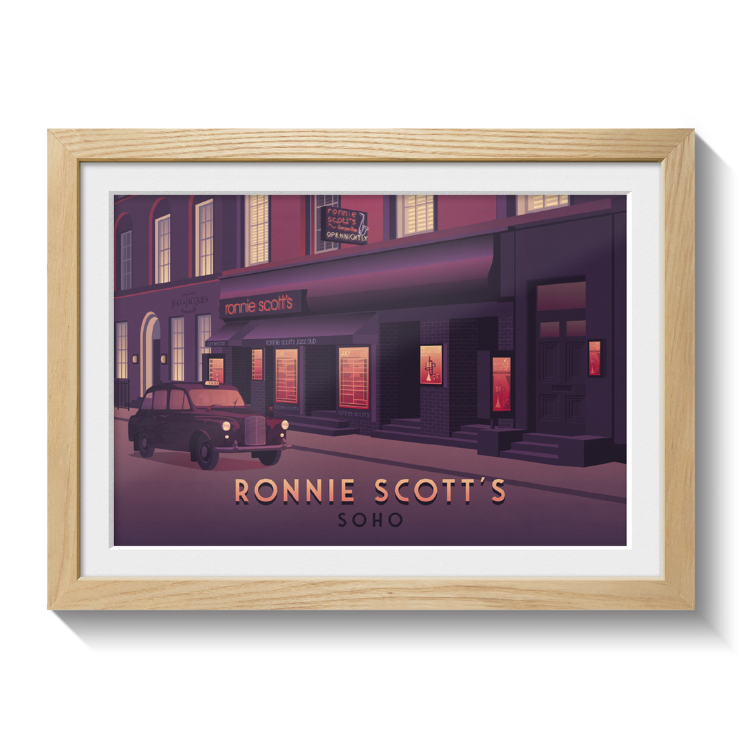 An original travel poster featuring the legendary Ronnie Scott's Jazz Club, situated in the heart of Soho in London's West End.