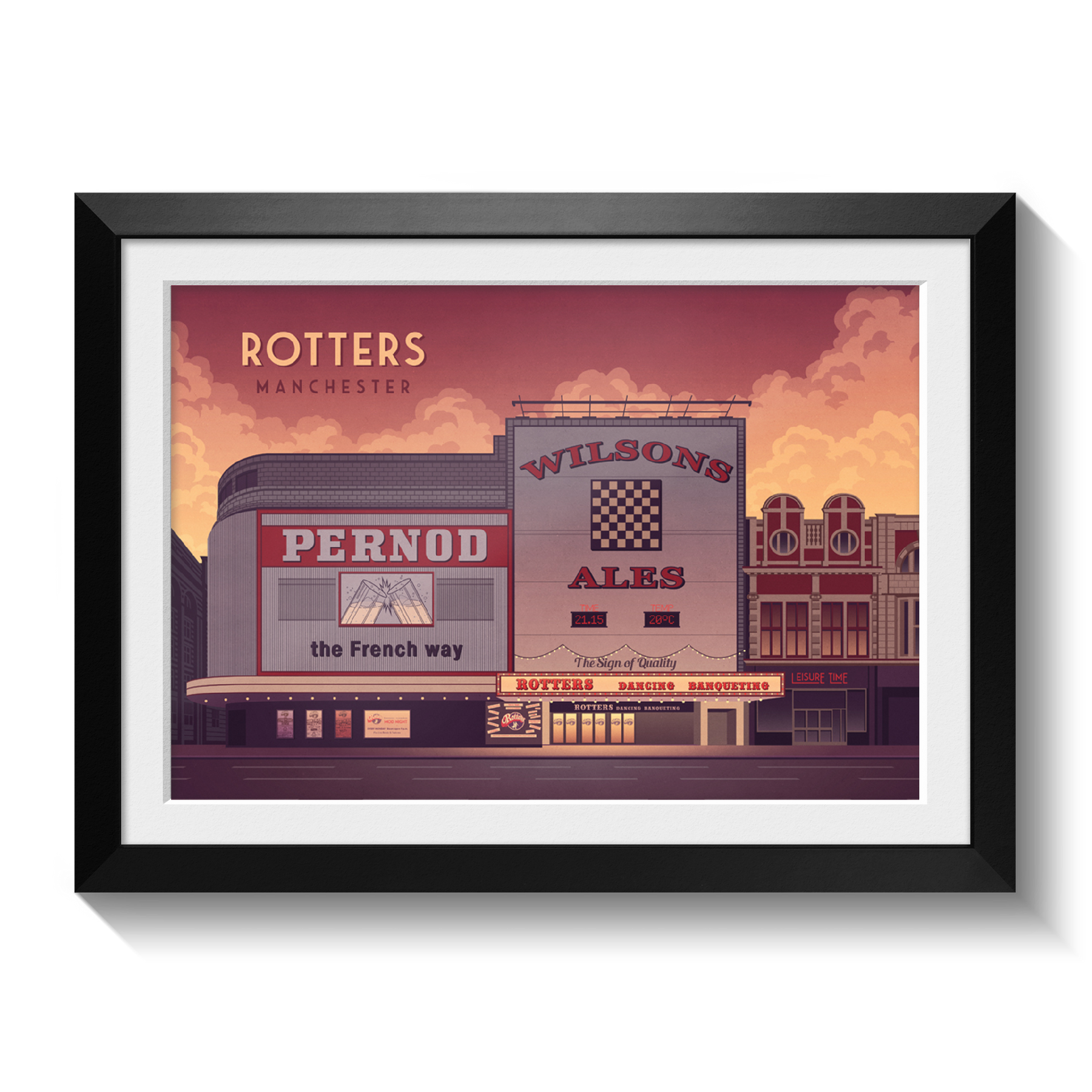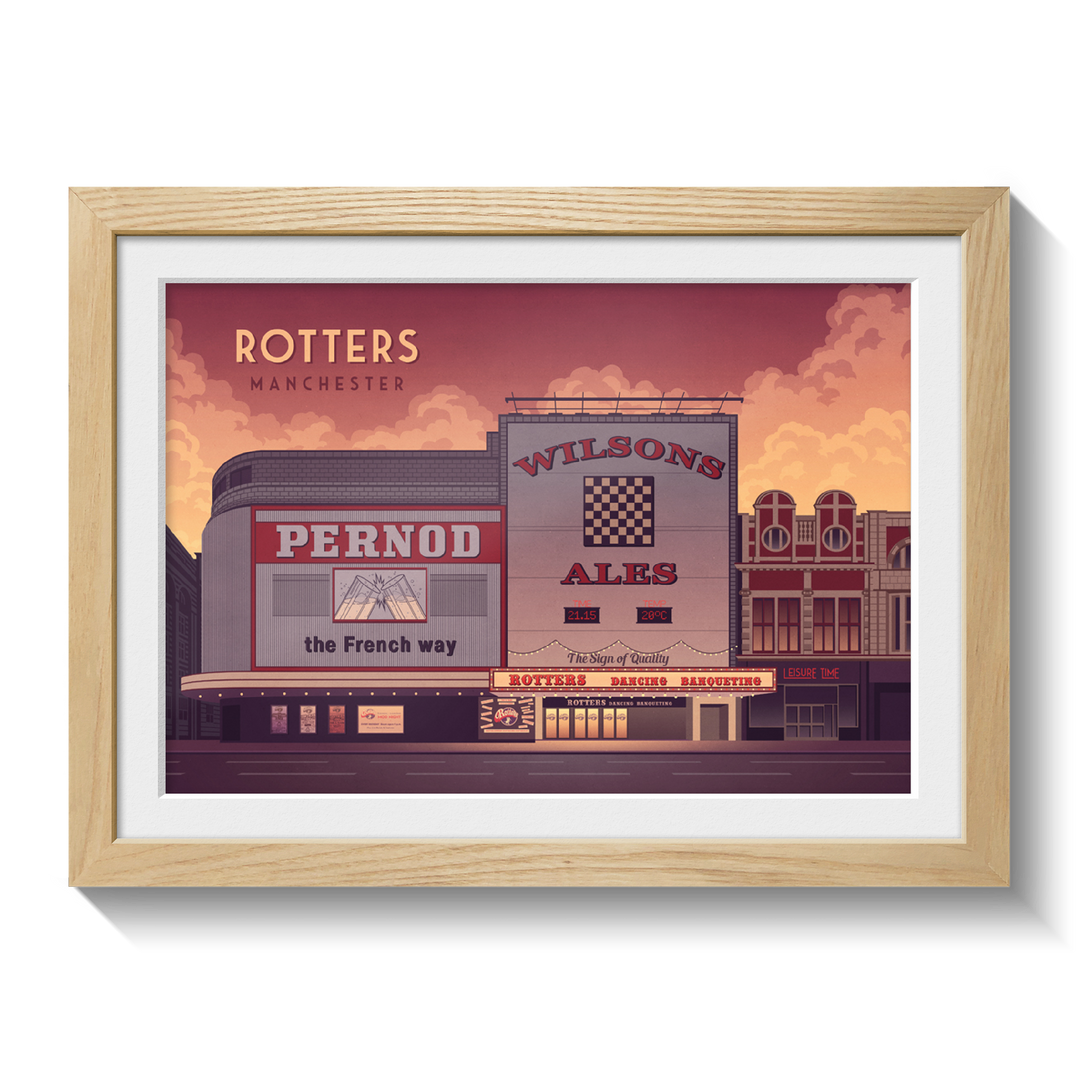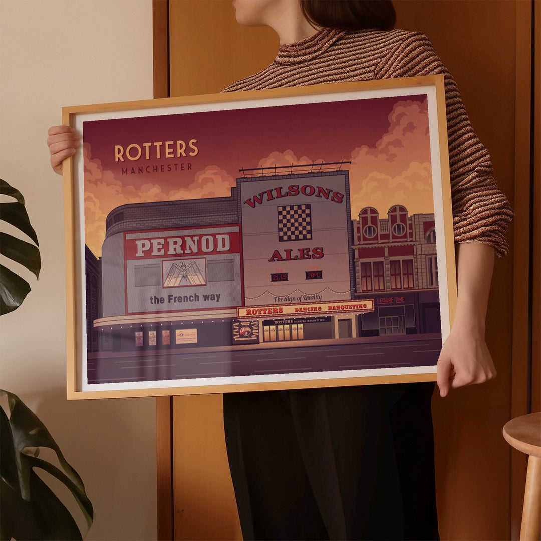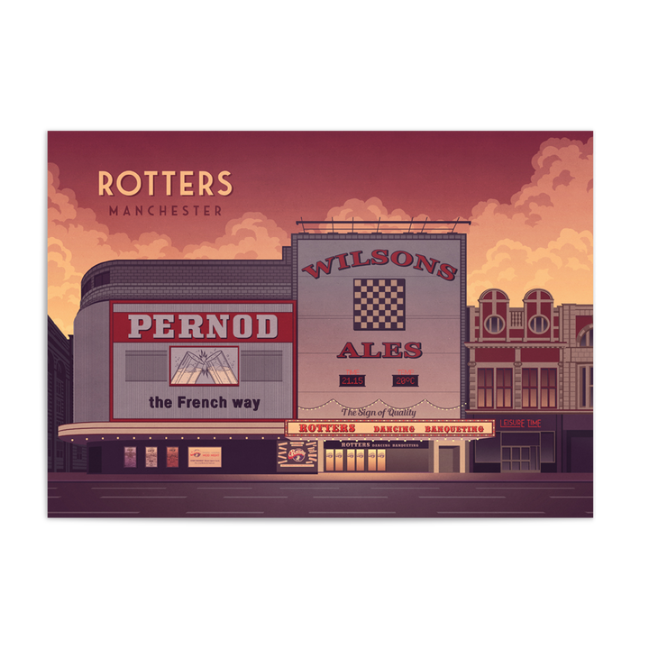 An original travel poster featuring the legendary Manchester Nightclub, Rotters. Situated in the old Gaumont Cinema building on Oxford Street, Rotters was a hugely popular nightclub and live music venue.