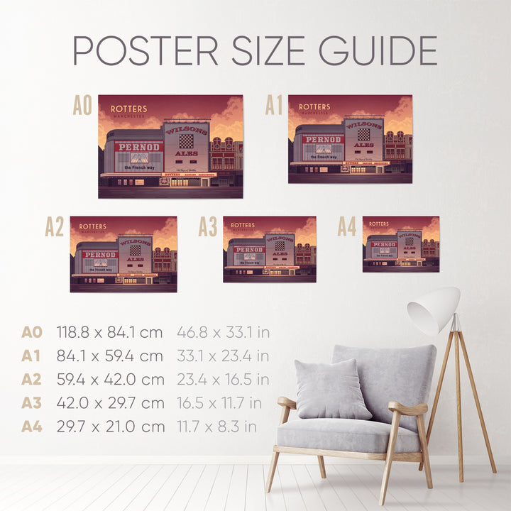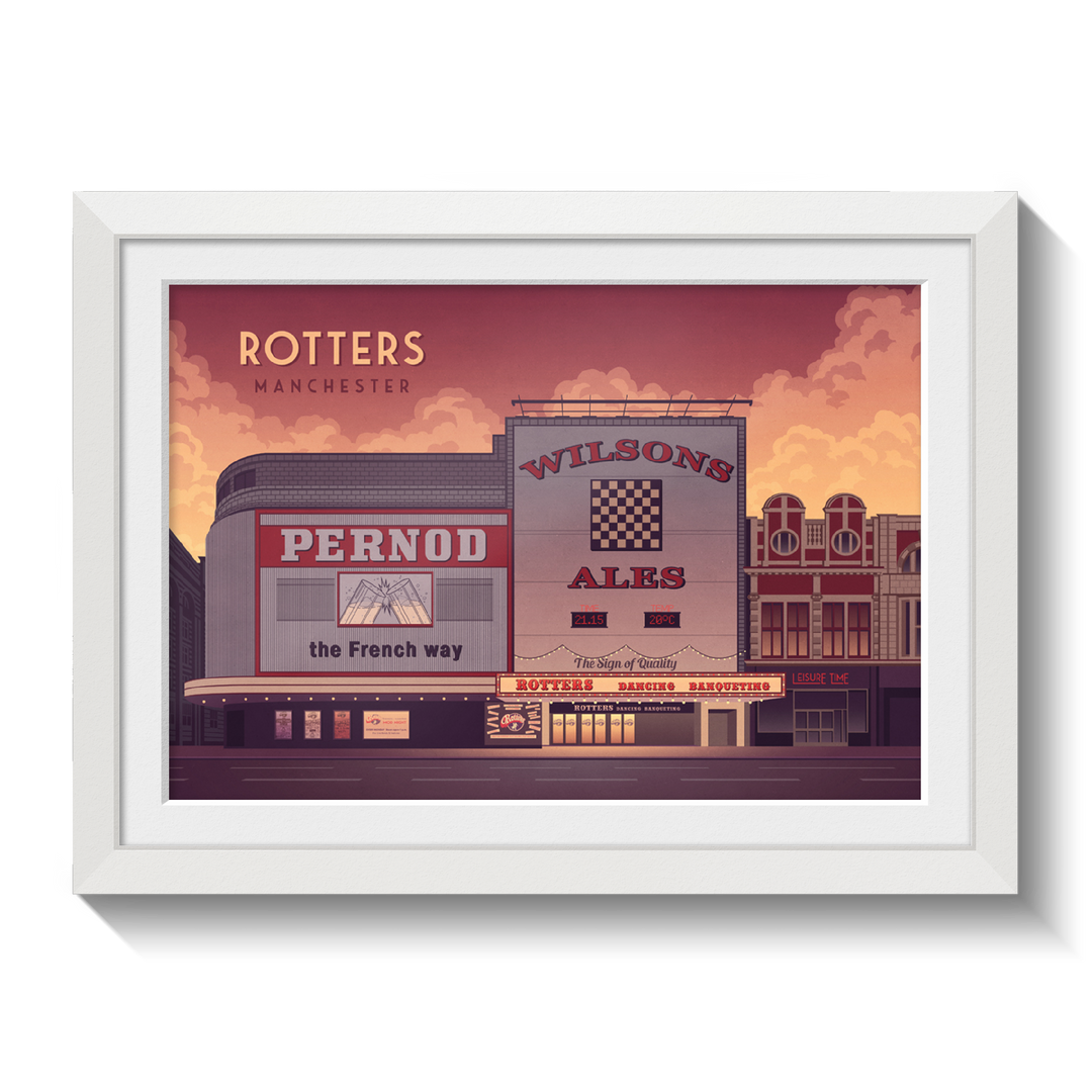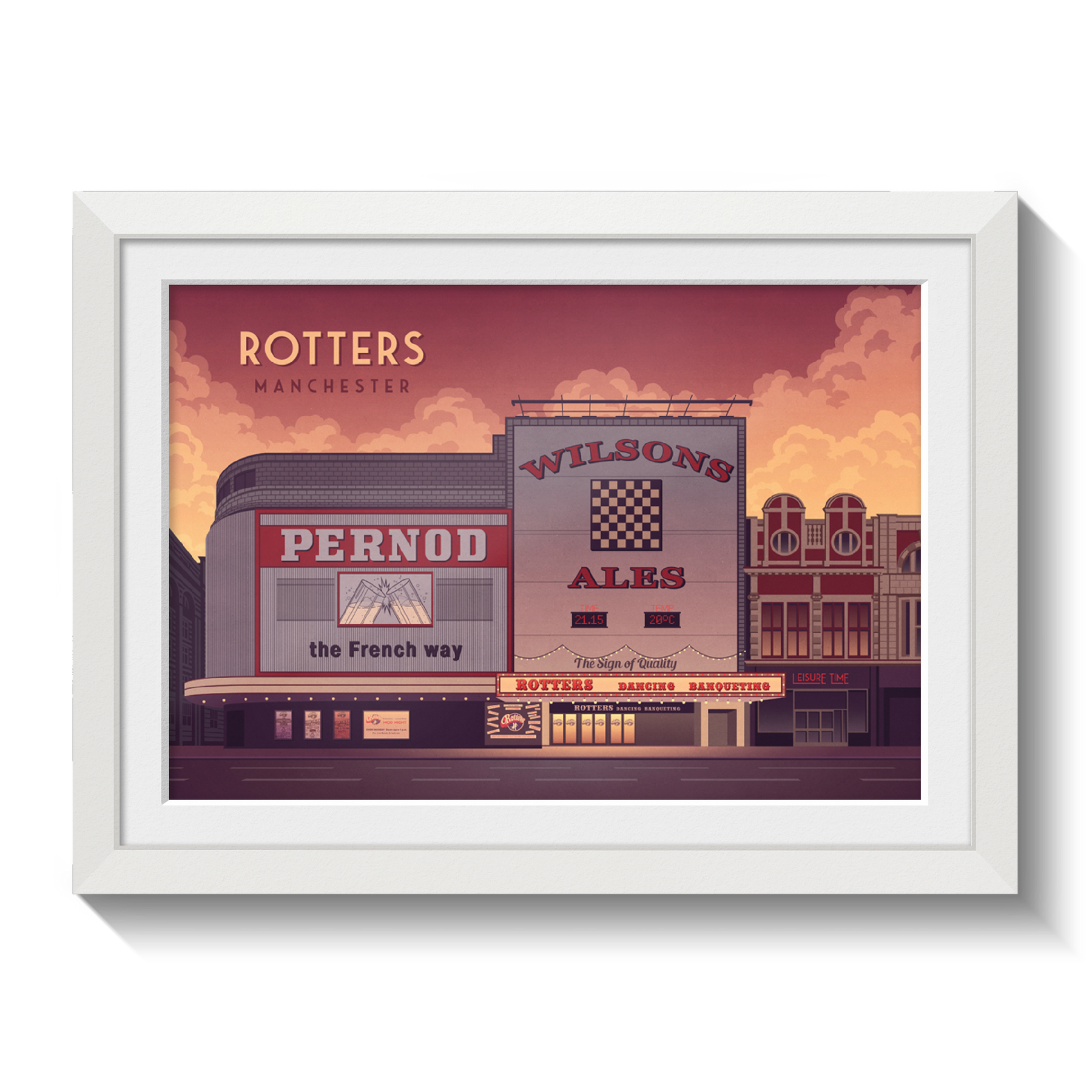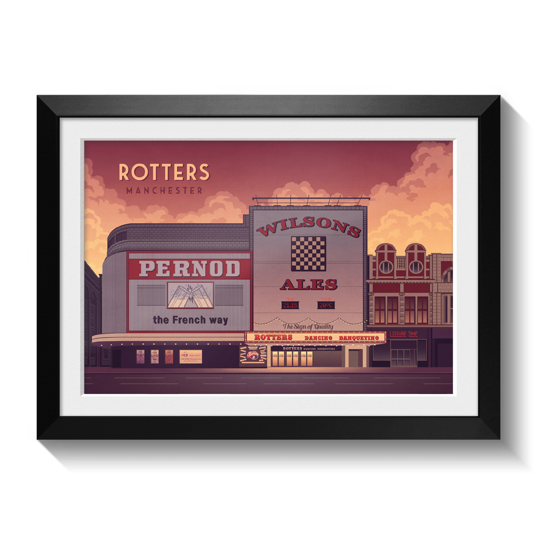 An original travel poster featuring the legendary Manchester Nightclub, Rotters. Situated in the old Gaumont Cinema building on Oxford Street, Rotters was a hugely popular nightclub and live music venue.