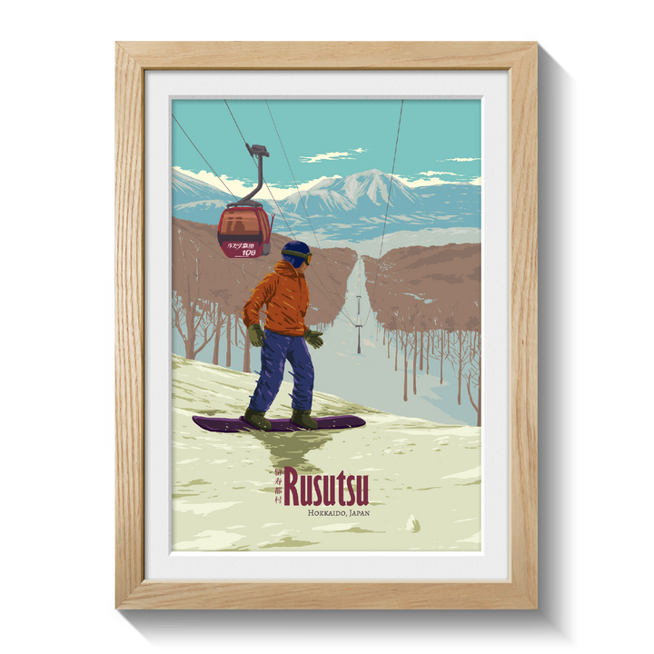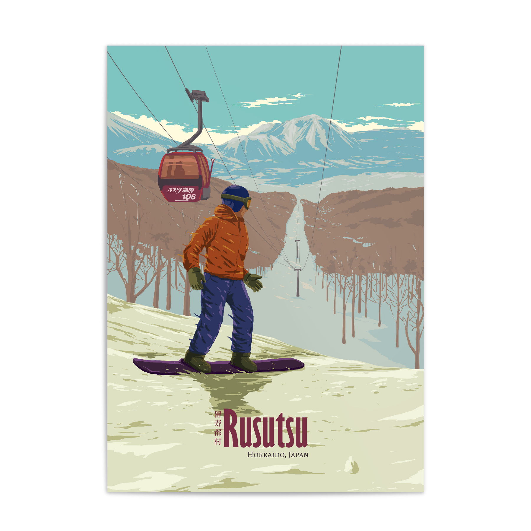 This is an original snowboard poster featuring the ski resort of Rusutsu on the Japanese island of Hokkaido. Rusutsu is based around 3 mountains; West Mountain, East Mountain, and Mount Isola. It has been voted the "Best Small Ski Resort" in Japan.