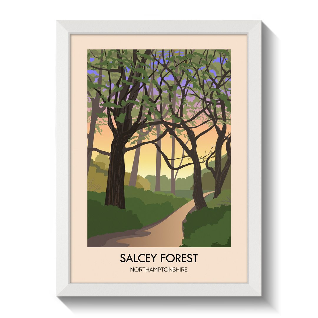 An original travel poster featuring Salcey Forest in Northamptonshire. Located 7 miles from Northampton, Salcey Forest is part of a former medieval hunting forest east of the village of Hartwell, between Northampton and Newport Pagnell in Northamptonshire.
