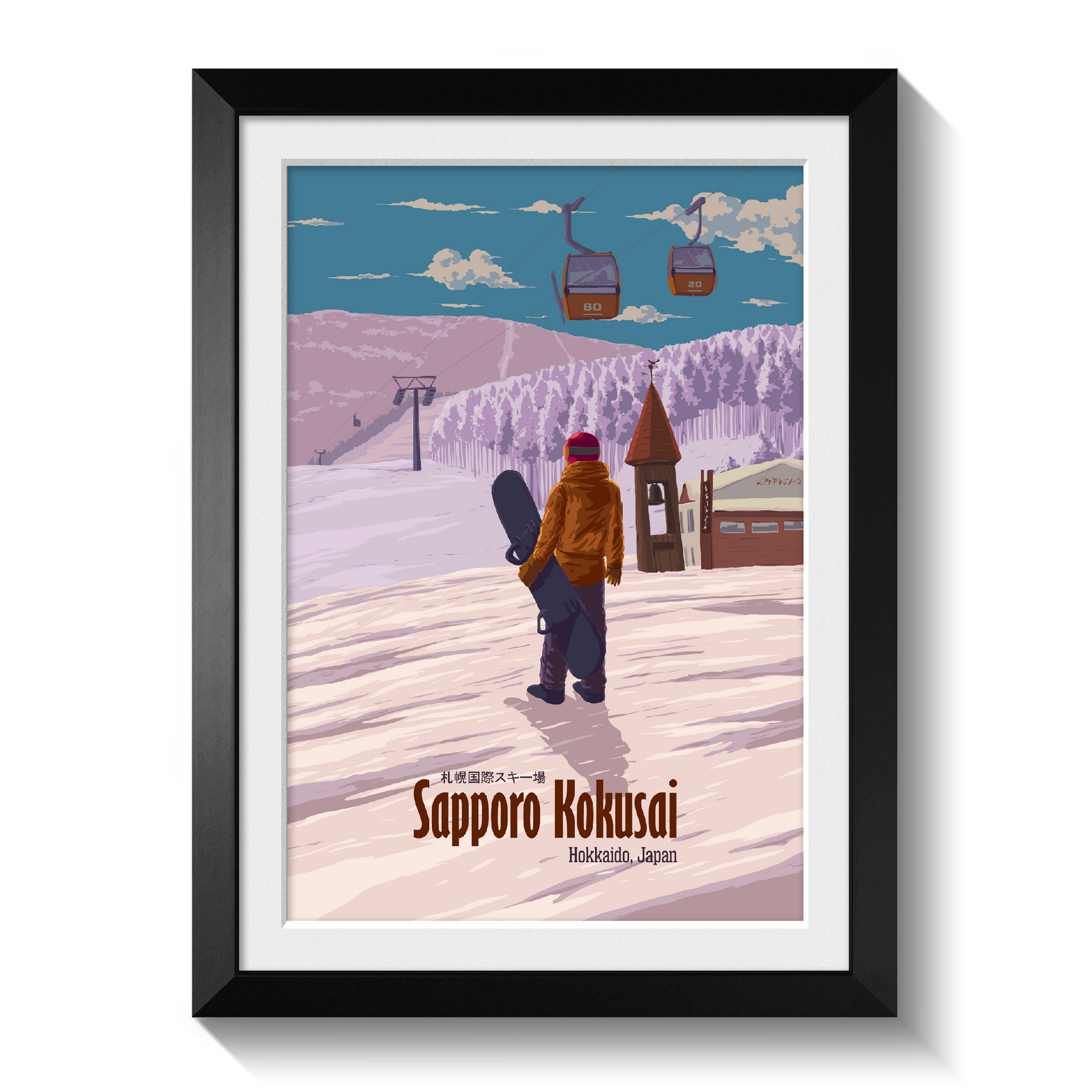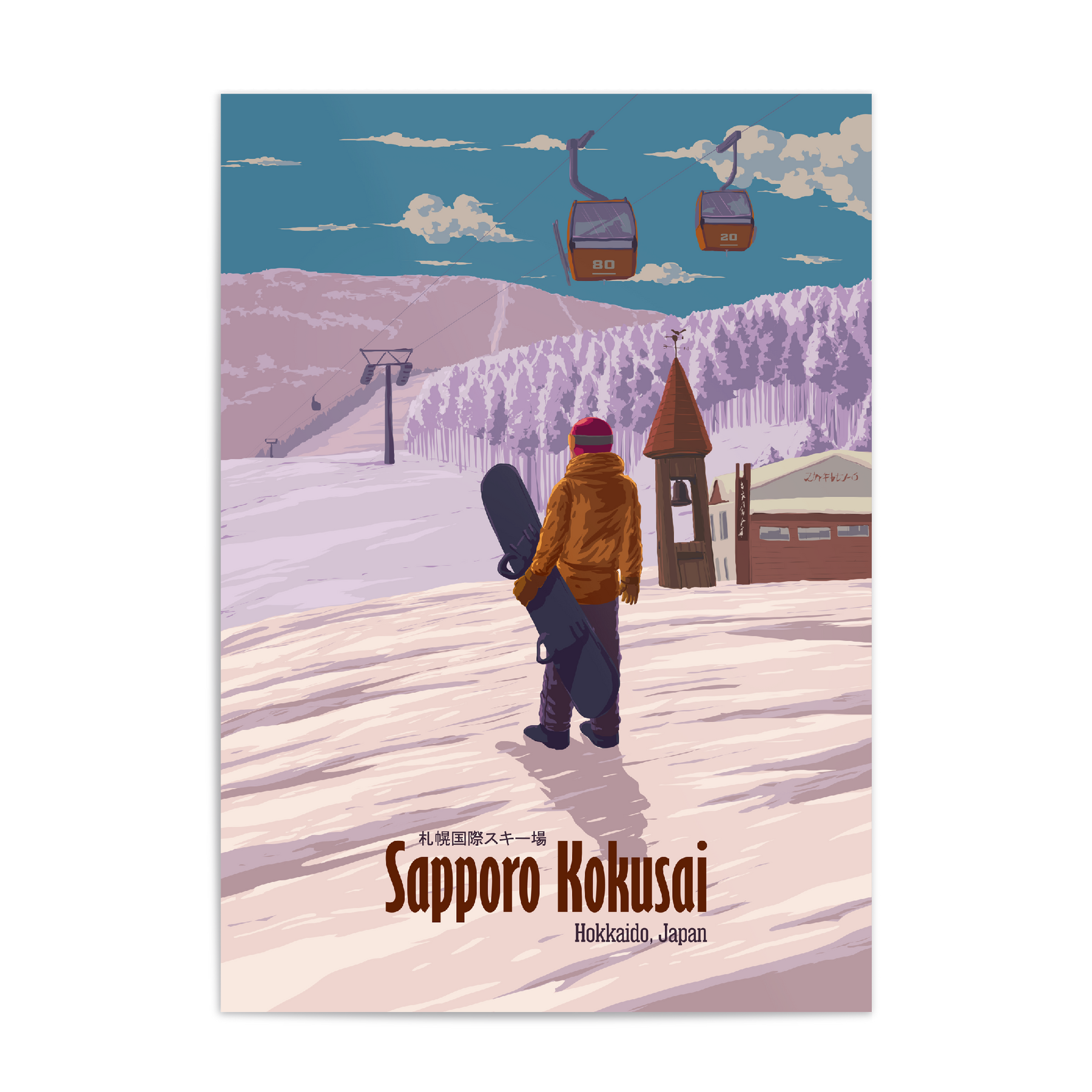 This is an original snowboard poster featuring the ski resort of Sapporo Kokusai on the Japanese island of Hokkaido. This popular resort on the outskirts of Sapporo is blessed with frequent dumps of snow, with some claiming it to be the most snow sure resort in Japan.