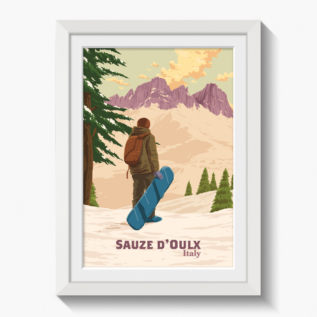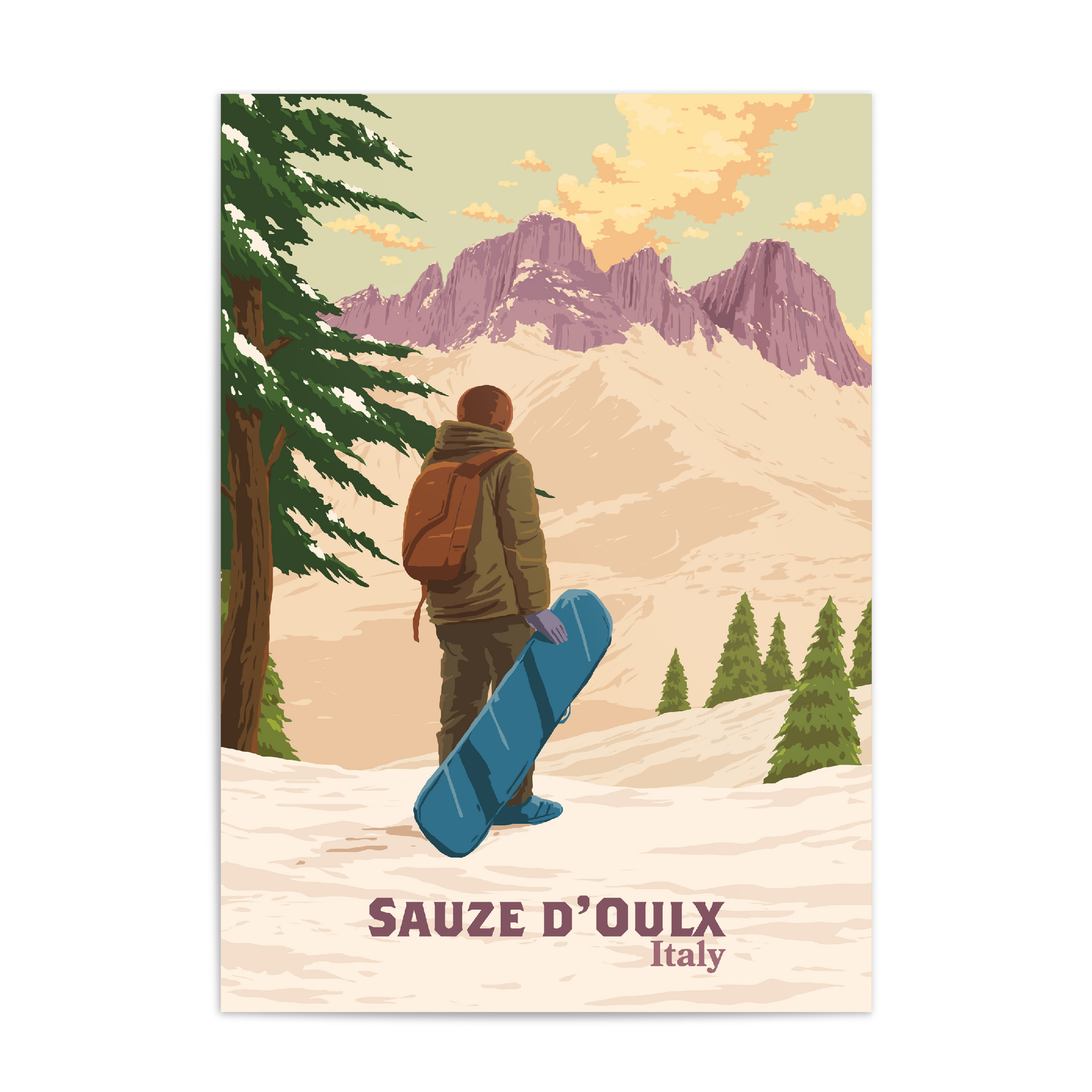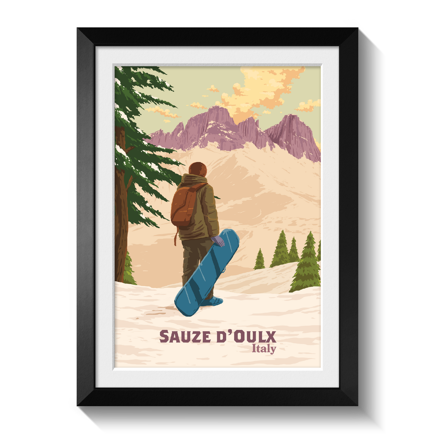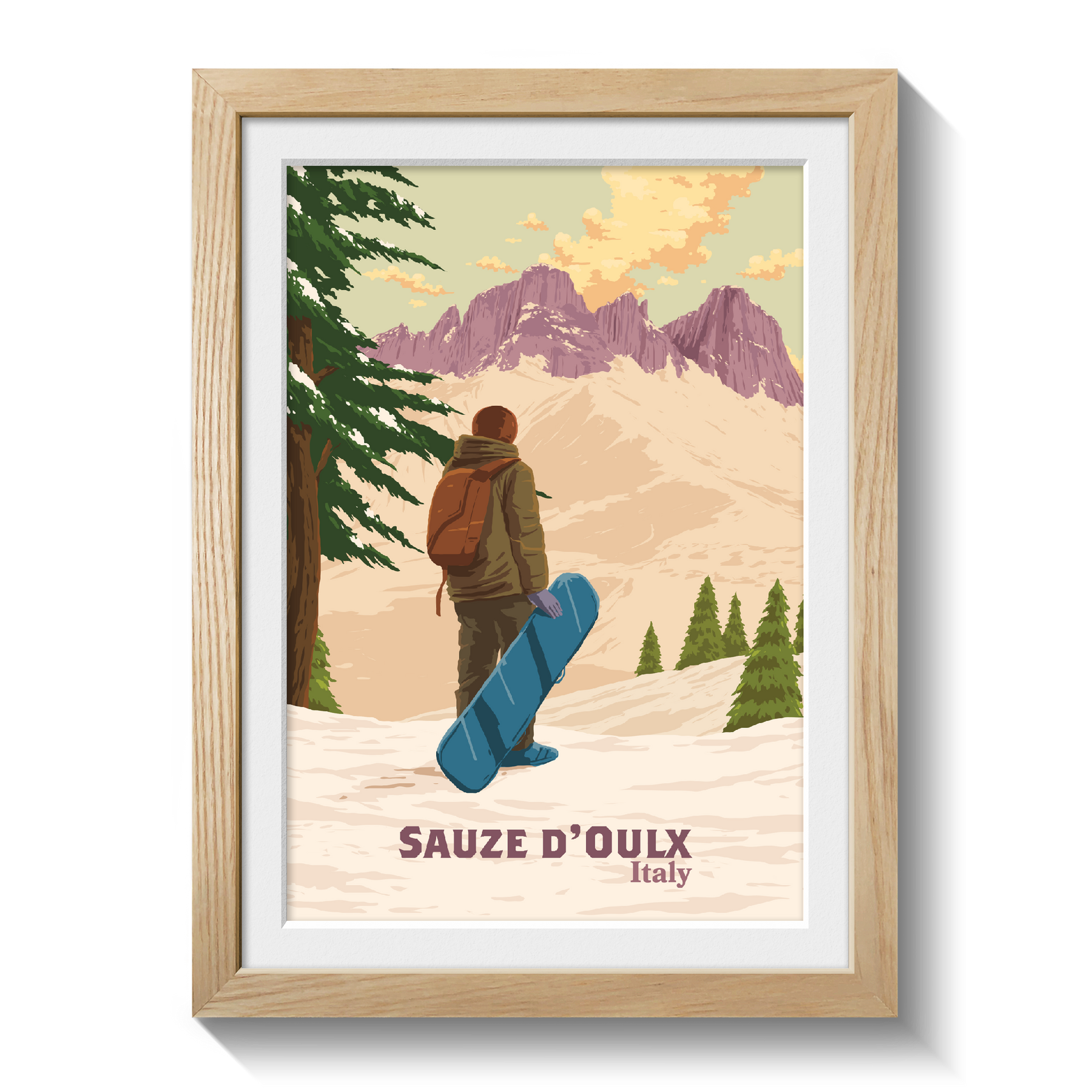 Sauze d'Oulx ski resort, Italy snowboarding travel poster.