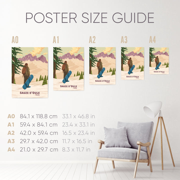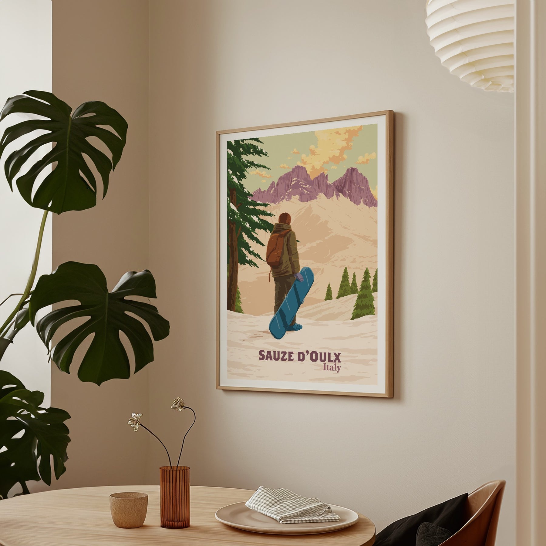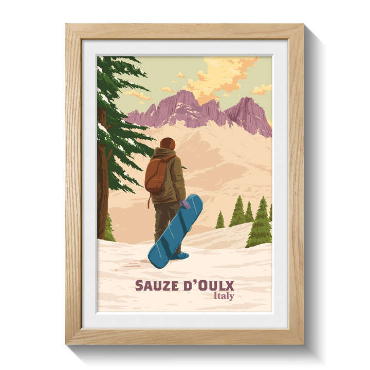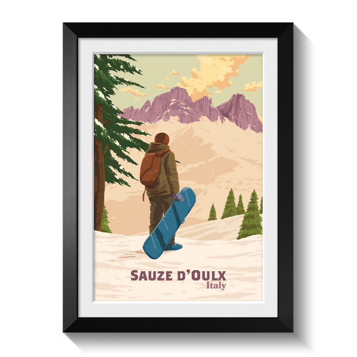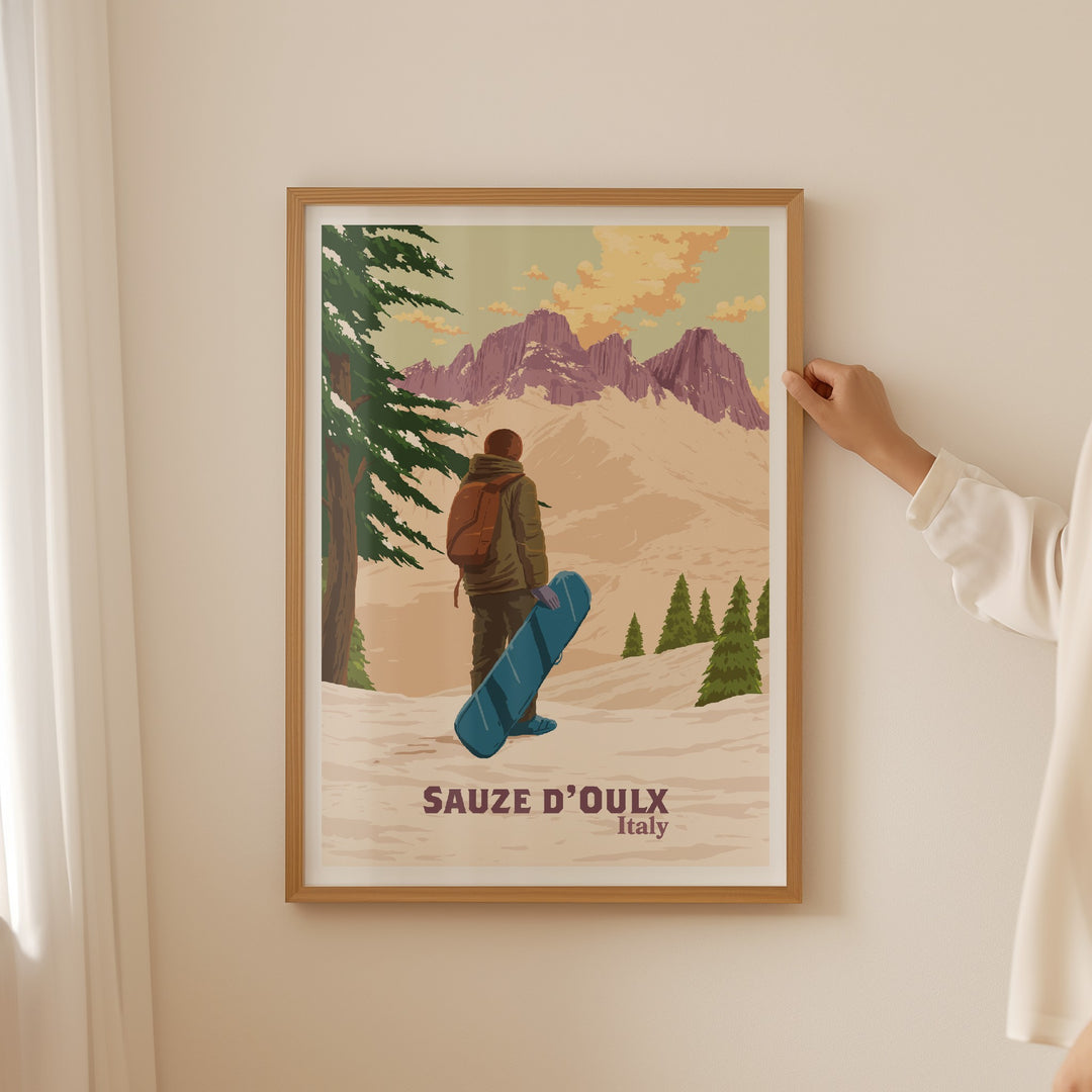 Sauze d'Oulx ski resort, Italy snowboarding travel poster.