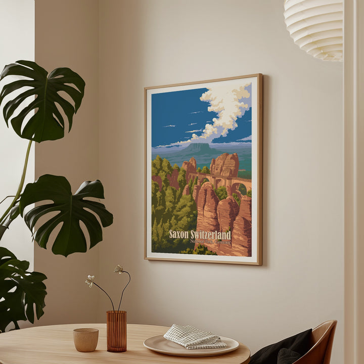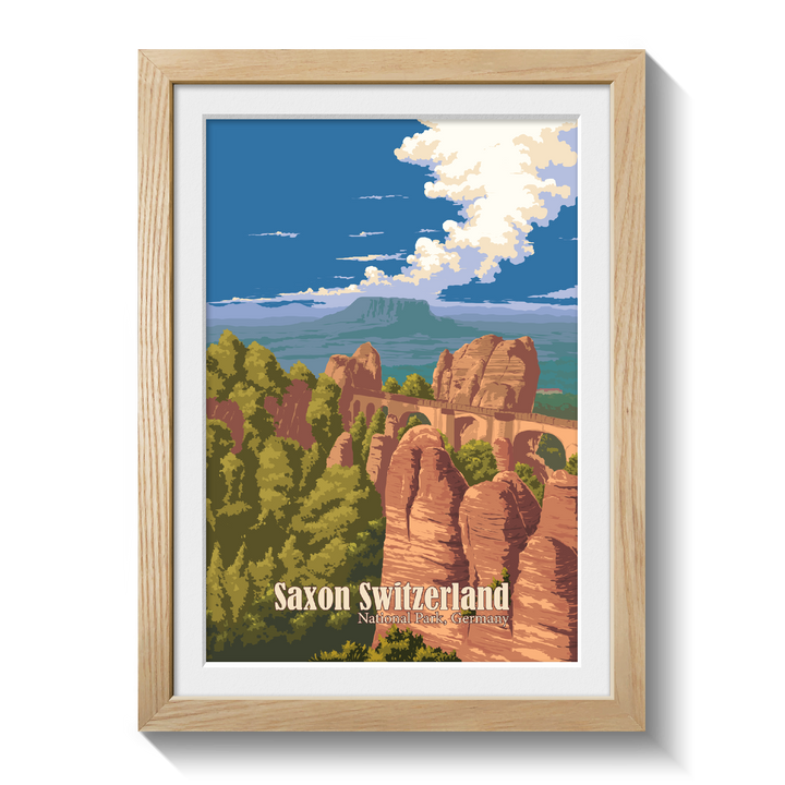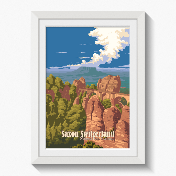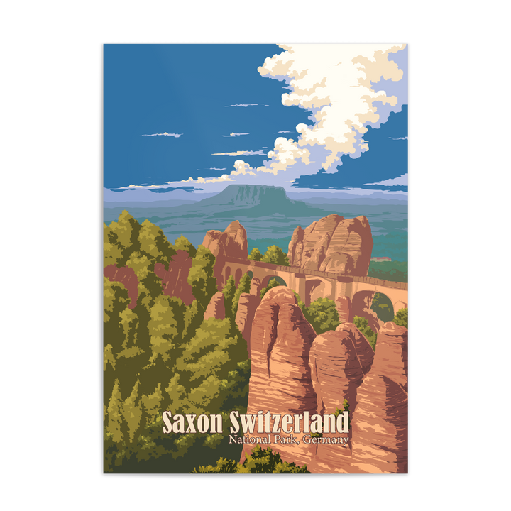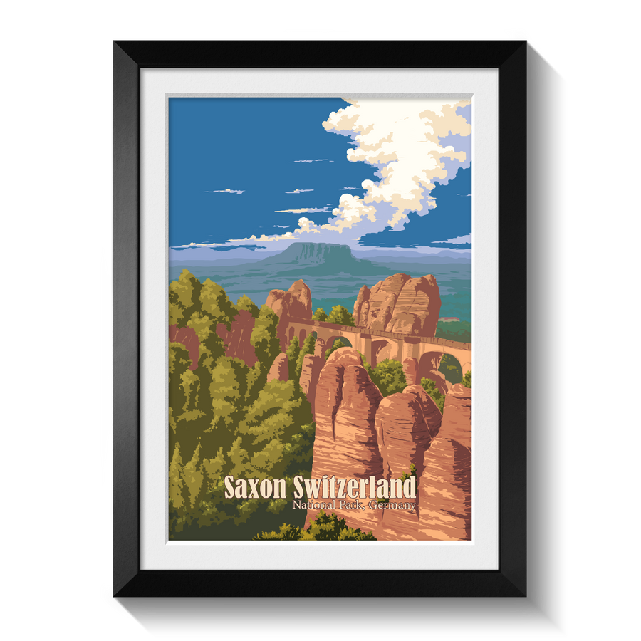 This is an original travel poster of Saxon Switzerland National Park in Germany. The travel poster features the iconic Bastei Bridge, an iconic rock formation towering 194 metres above the Elbe River