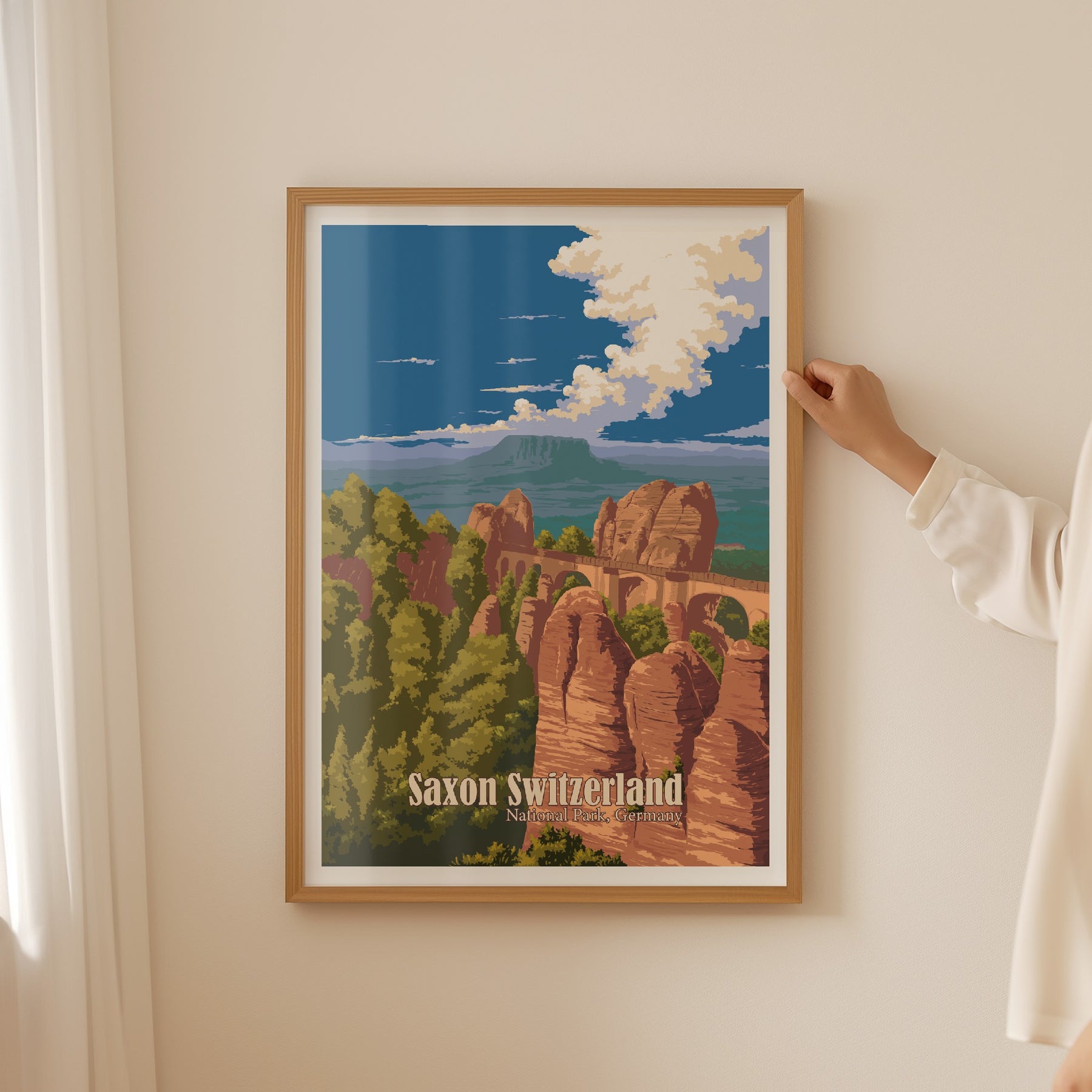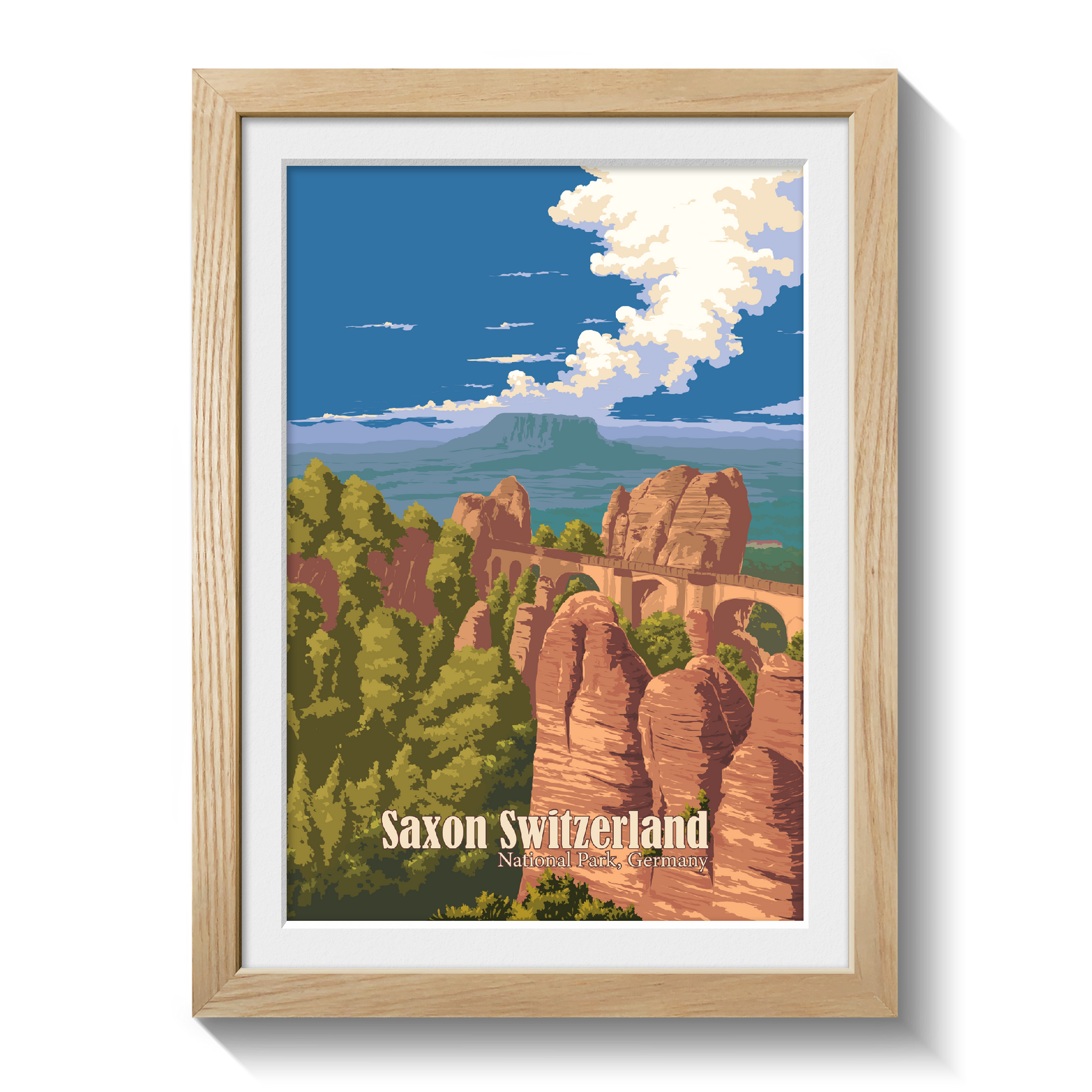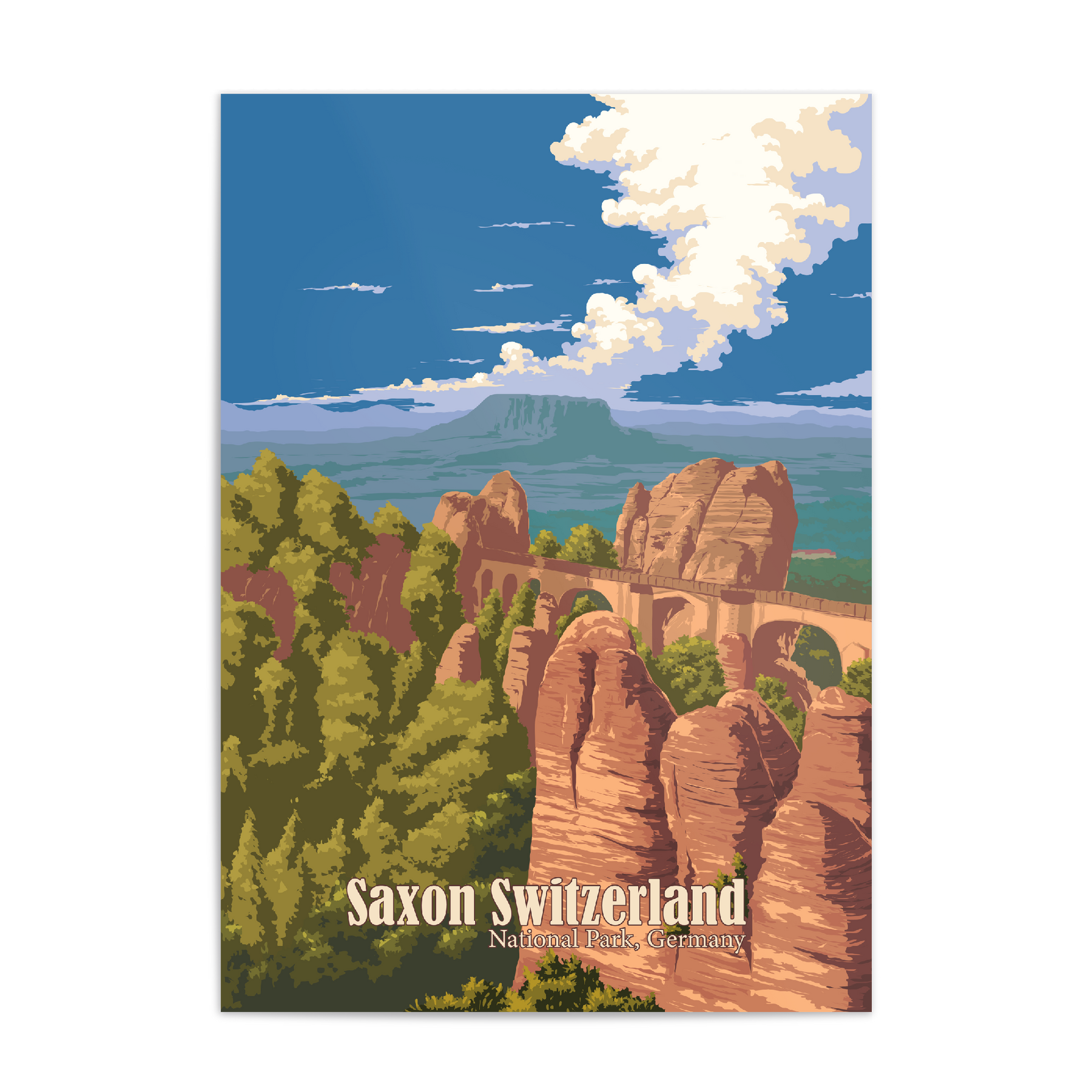 This is an original travel poster of Saxon Switzerland National Park in Germany. The travel poster features the iconic Bastei Bridge, an iconic rock formation towering 194 metres above the Elbe River