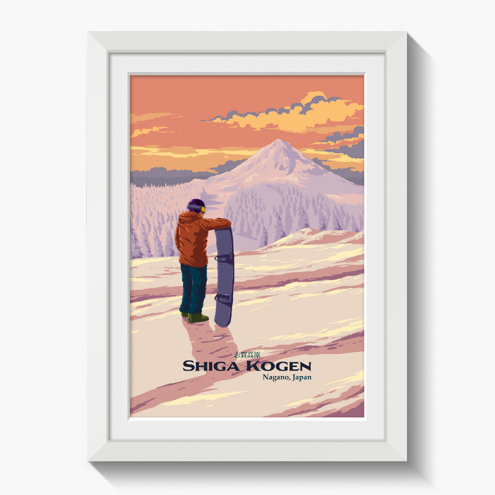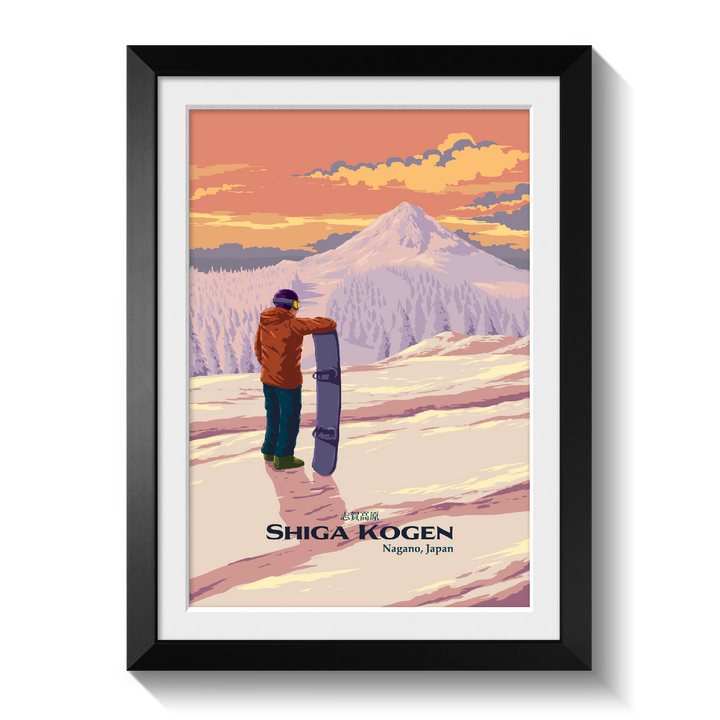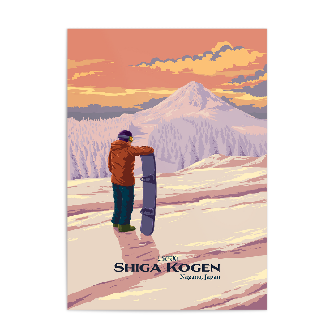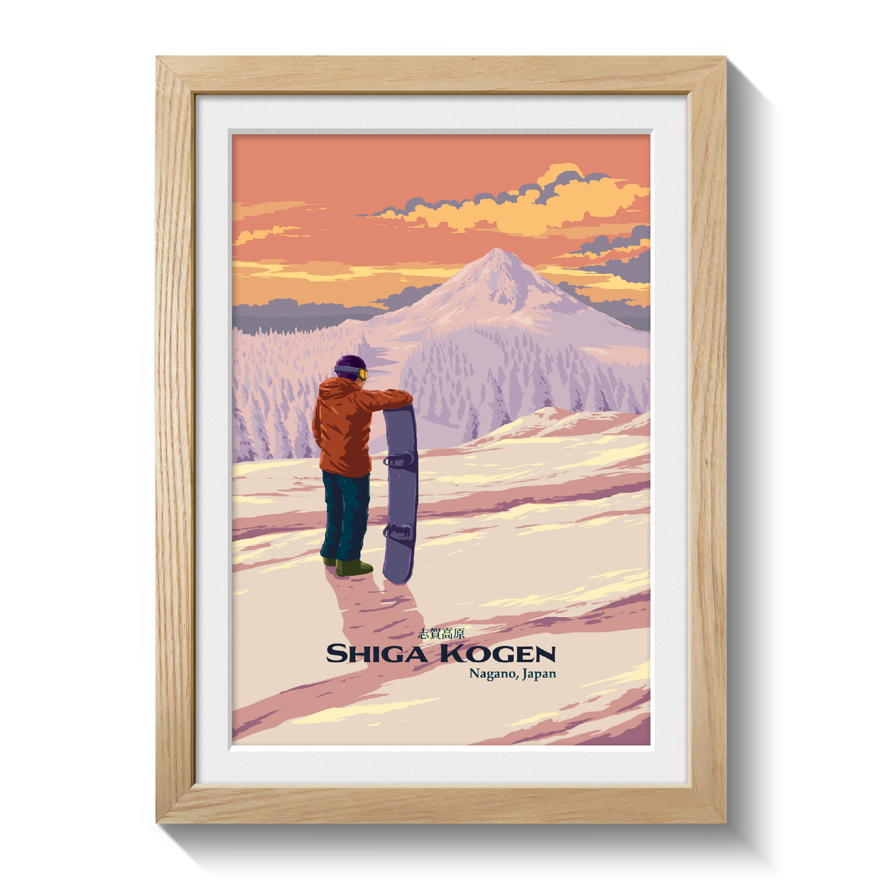 This is an original snowboard poster featuring the ski resort of Shiga Kogen located in the Jōshin'etsu-kōgen National Park in the highlands of Yamanouchi, Nagano, Japan.