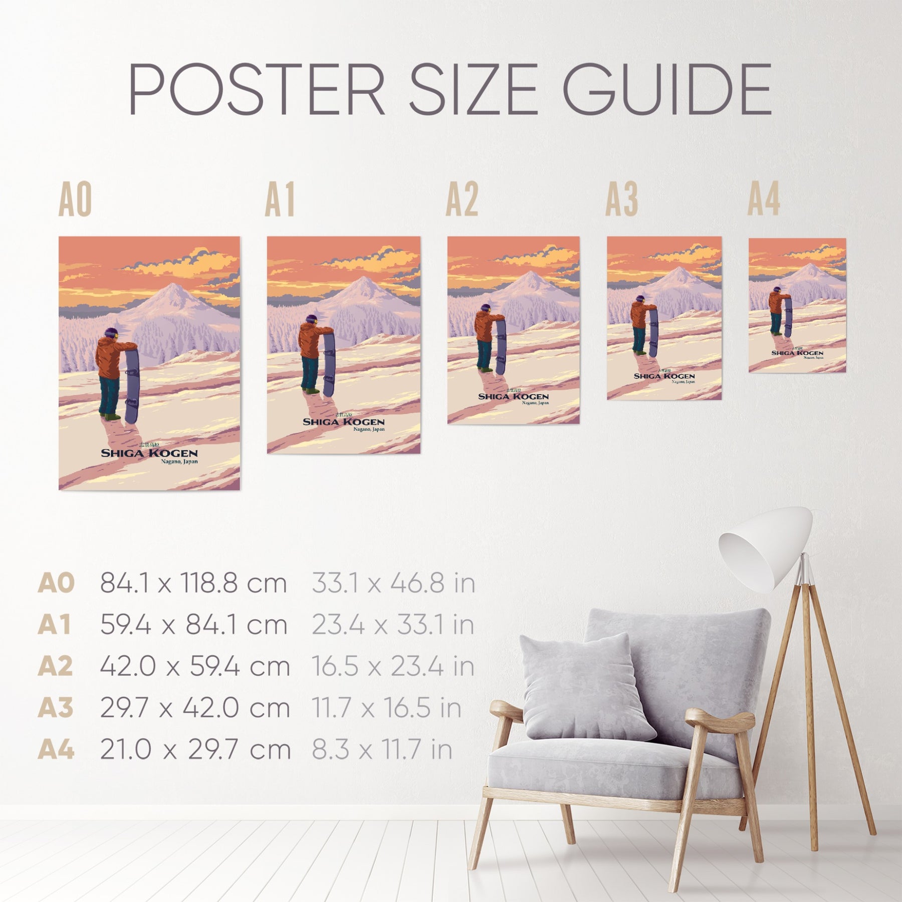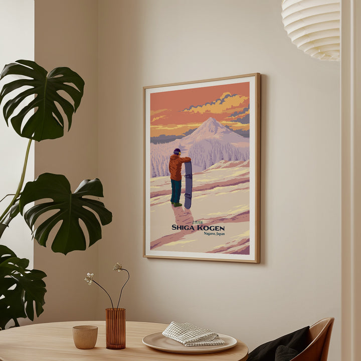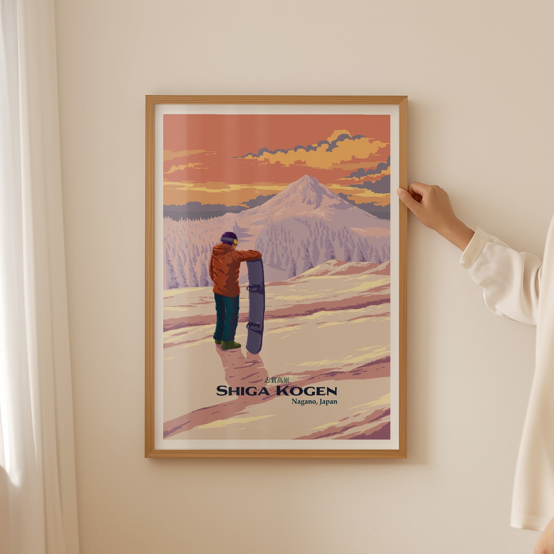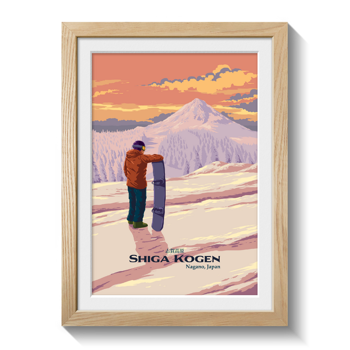 This is an original snowboard poster featuring the ski resort of Shiga Kogen located in the Jōshin'etsu-kōgen National Park in the highlands of Yamanouchi, Nagano, Japan.