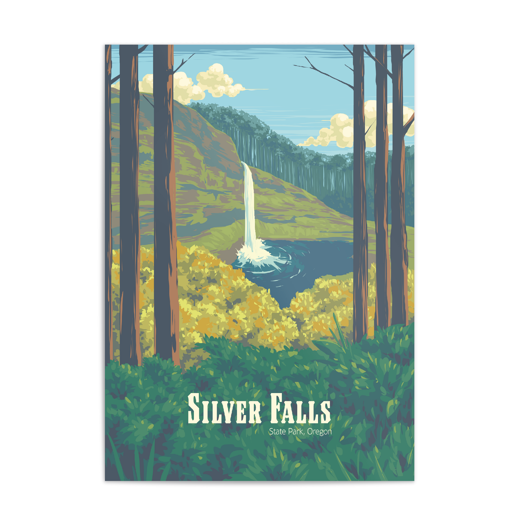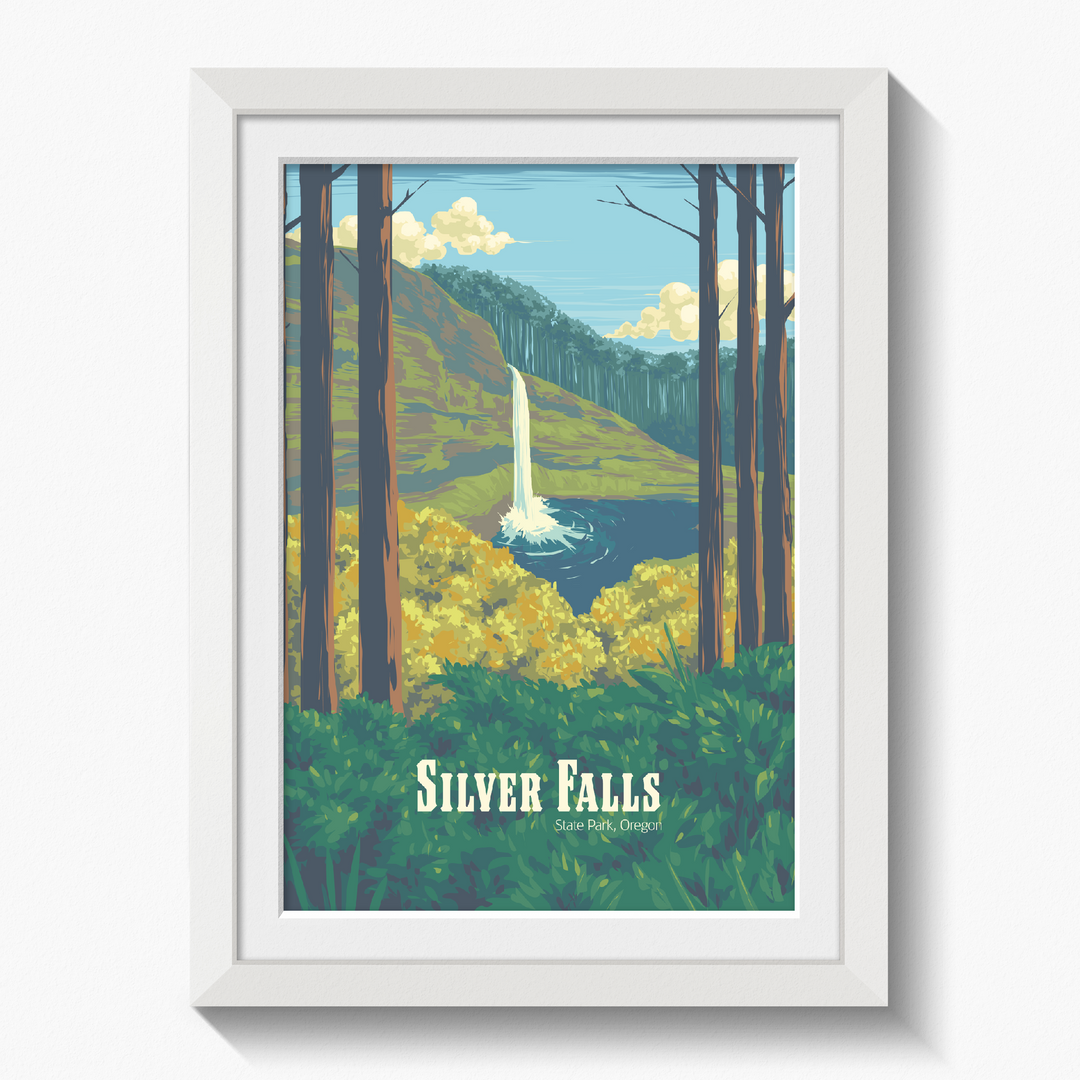 This Silver Falls State Park poster captures the stunning beauty of Oregon’s famous waterfalls. Perfect for nature enthusiasts and hikers, it highlights the lush greenery and cascading falls of this iconic Pacific Northwest location. A stylish addition to your decor, celebrating the natural wonder and peaceful charm of Oregon’s scenic treasure.
