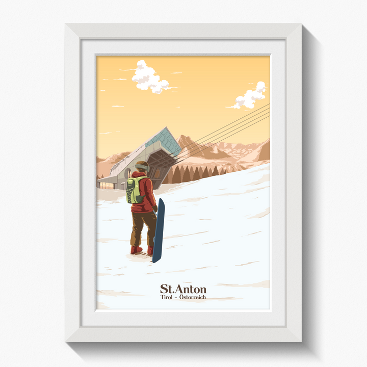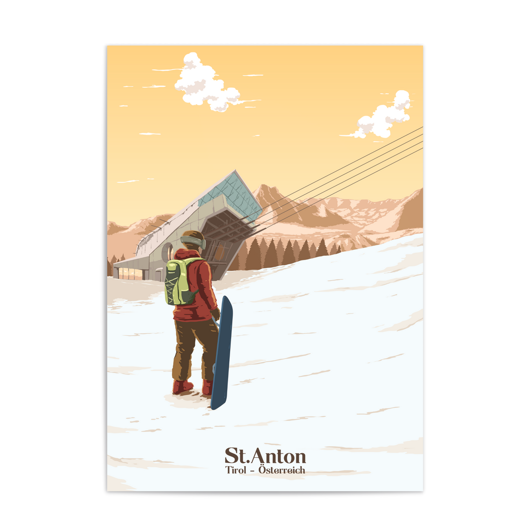 An original travel poster featuring a snowboarder approaching the modern Galzigbahn lift station in the popular Austrian ski resort of St Anton.
