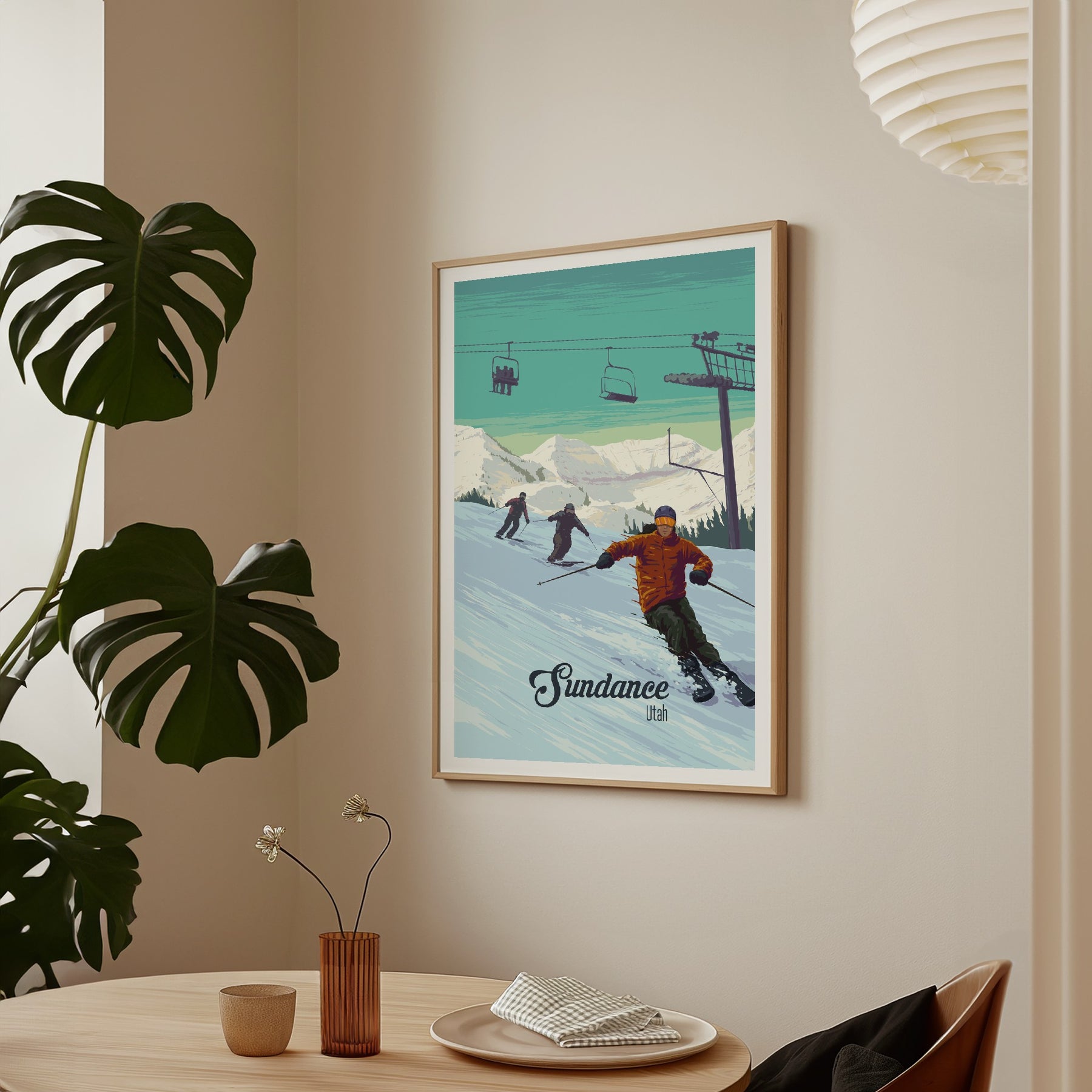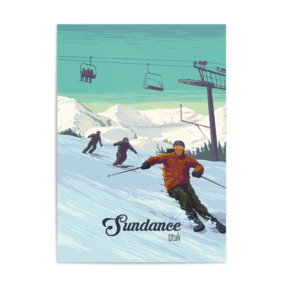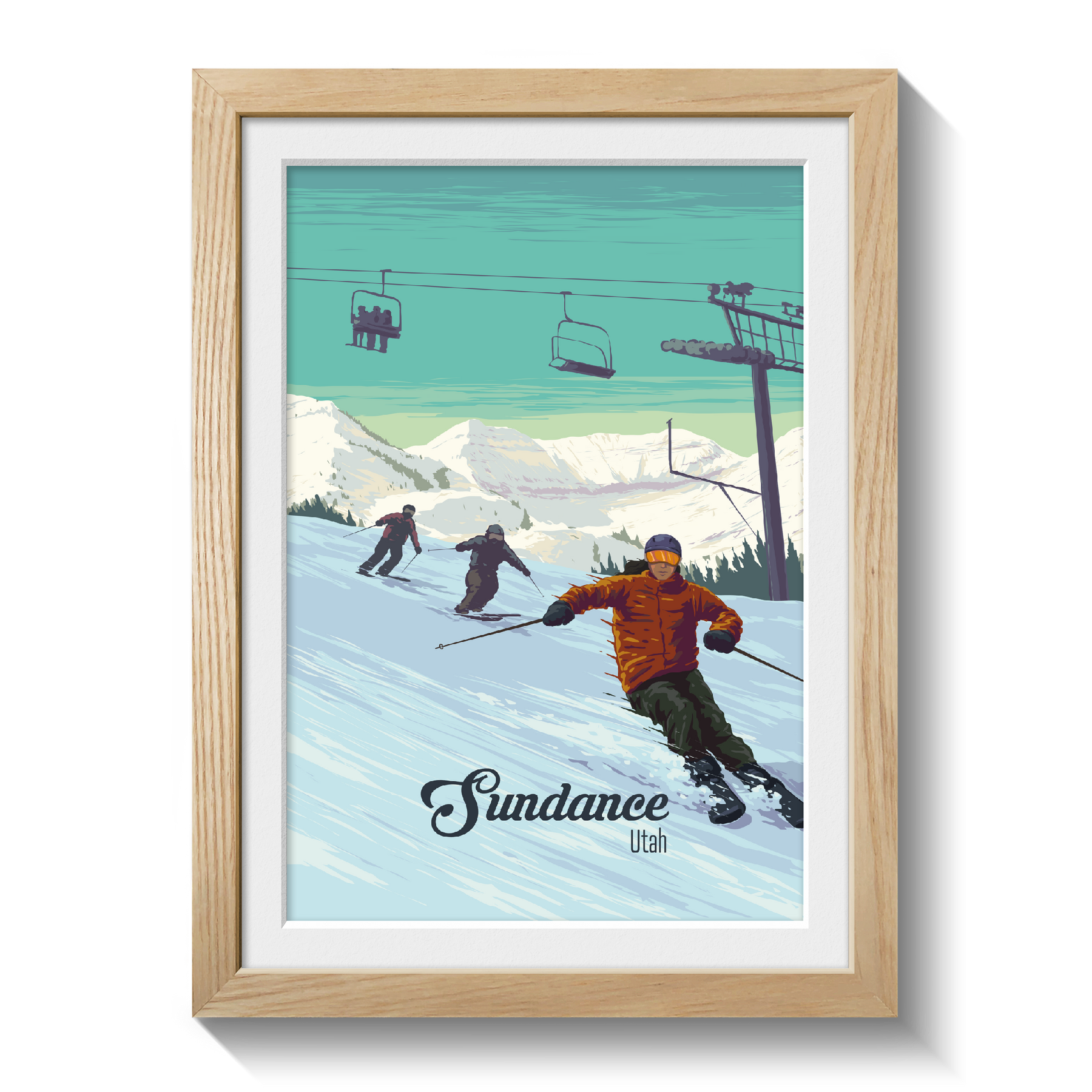 An original skiing poster featuring the American ski resort of Sundance Utah.