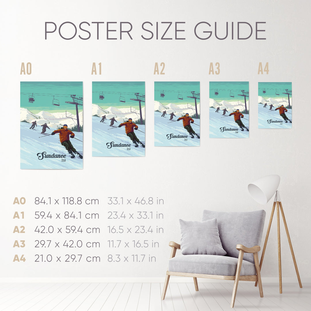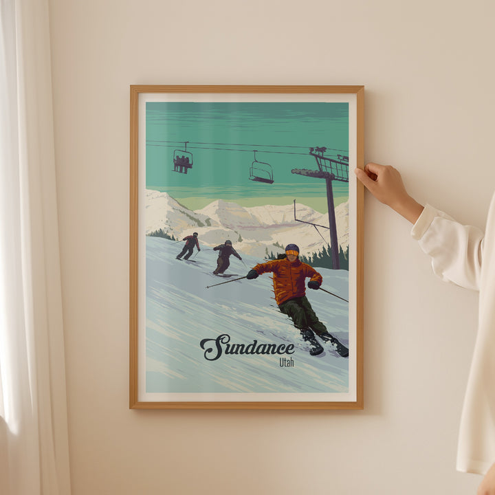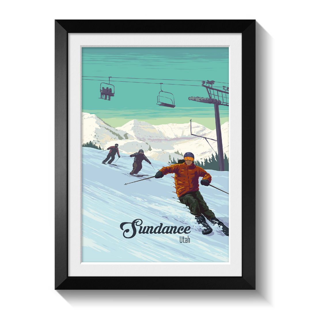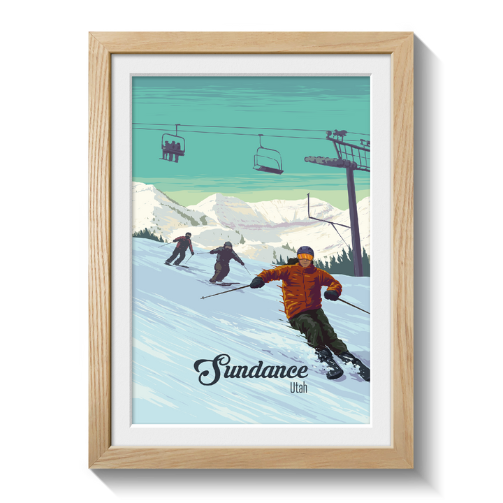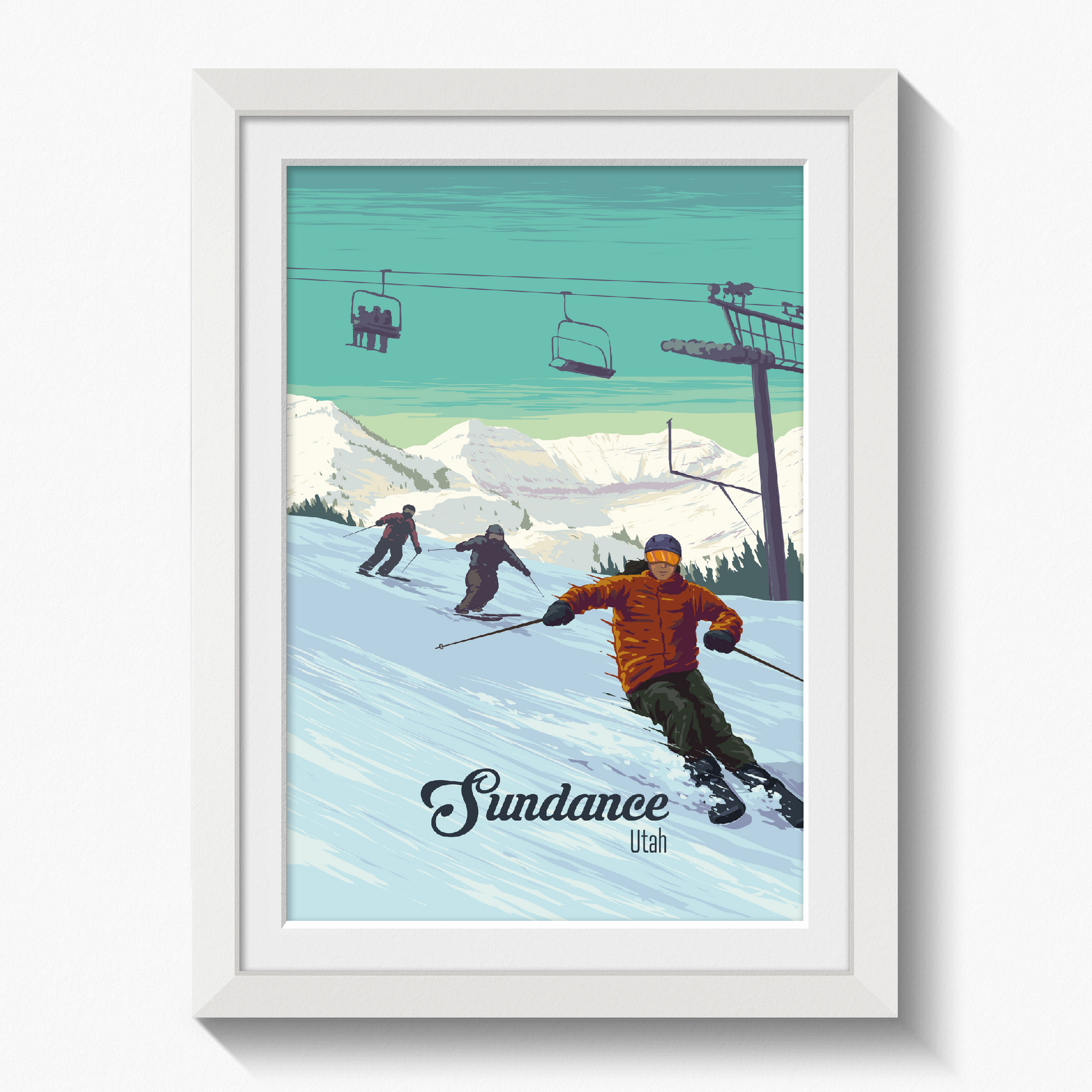An original skiing poster featuring the American ski resort of Sundance Utah.