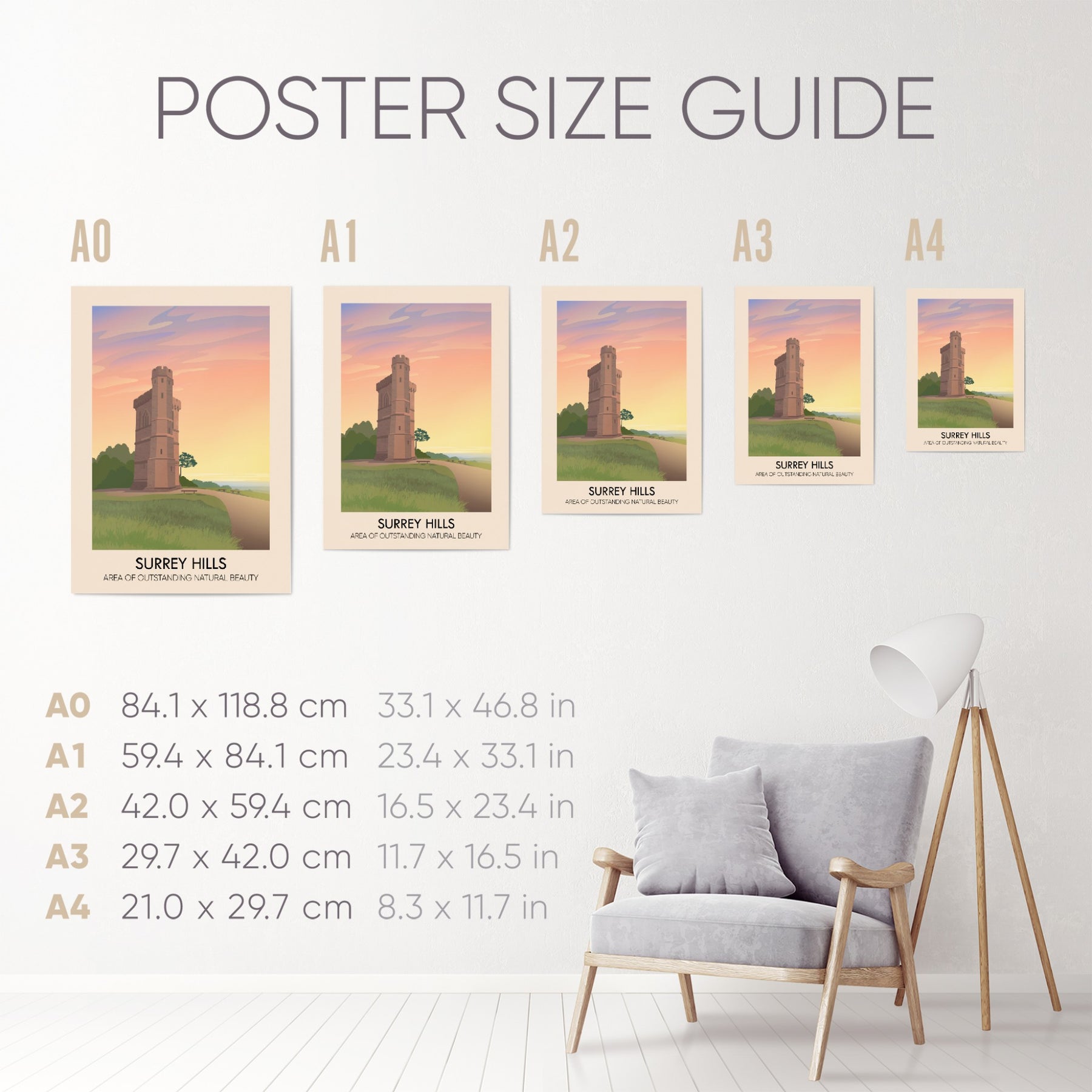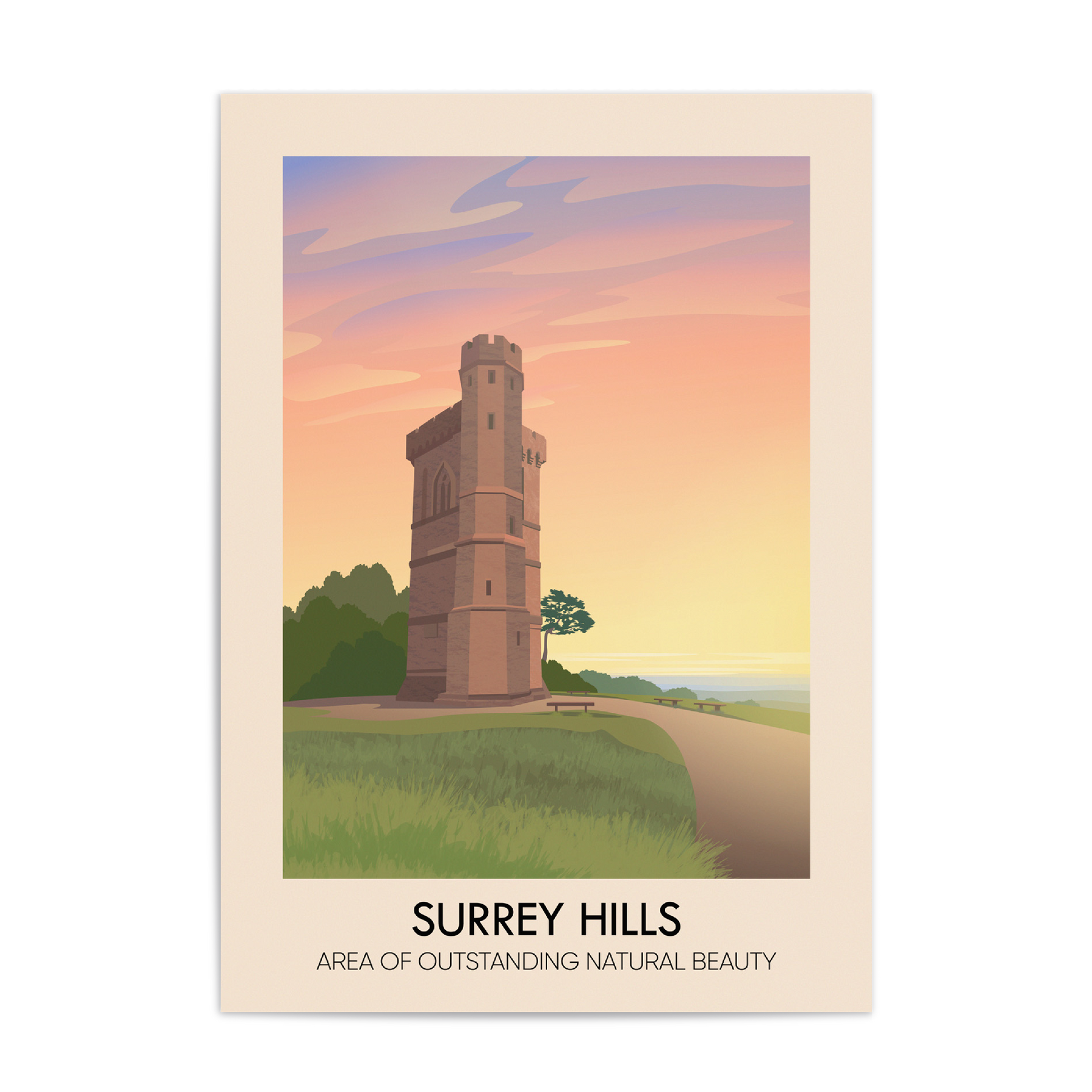 Original travel poster featuring The Surrey Hills Area of Outstanding Natural Beauty. Surrey Hills National Landscape includes the chalk slopes of the North Downs from Farnham in the west to Oxted in the east and extends south to the deeply wooded Greensand Hills which rise in Haslemere.