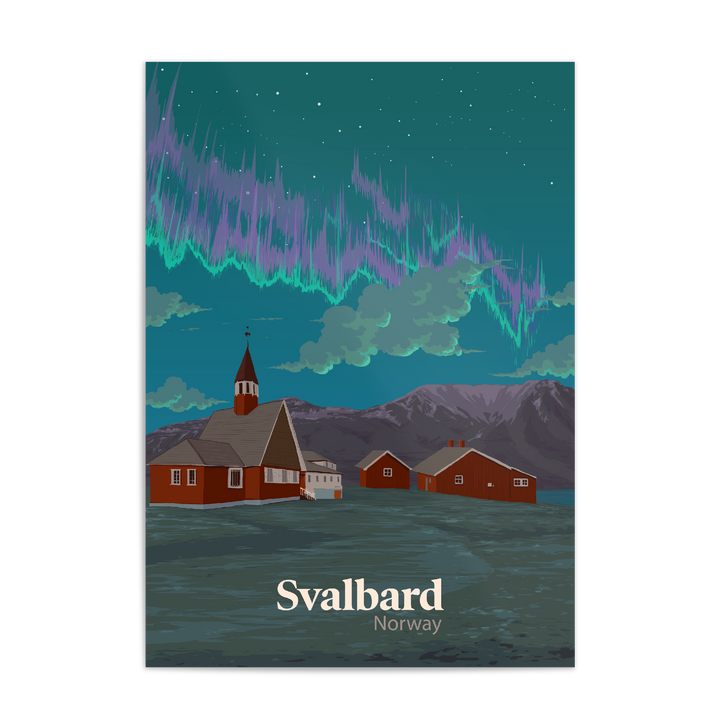 This is an original travel poster for Svalbard, an archipelago in Northern Norway. In the poster, the northern lights can be seen dancing in the sky above the church building in Longyearbyen, Svalbard's central town on the island of Spitsbergen.
