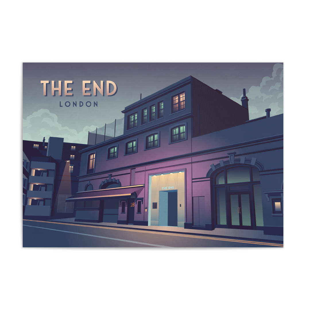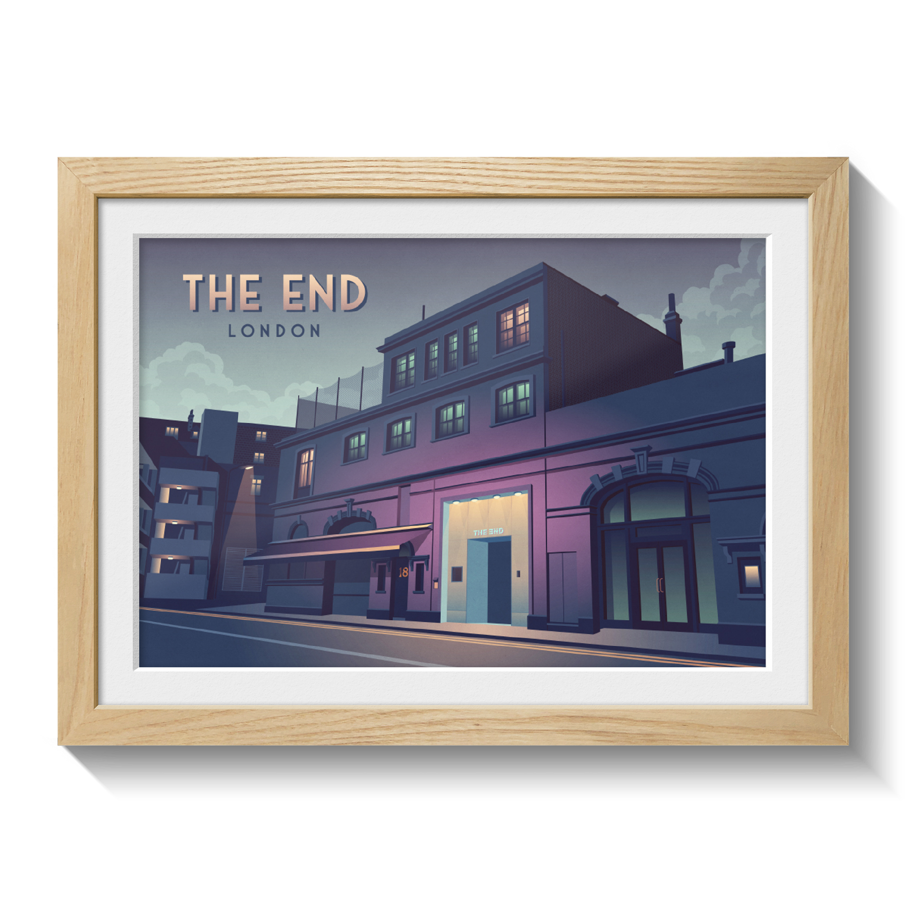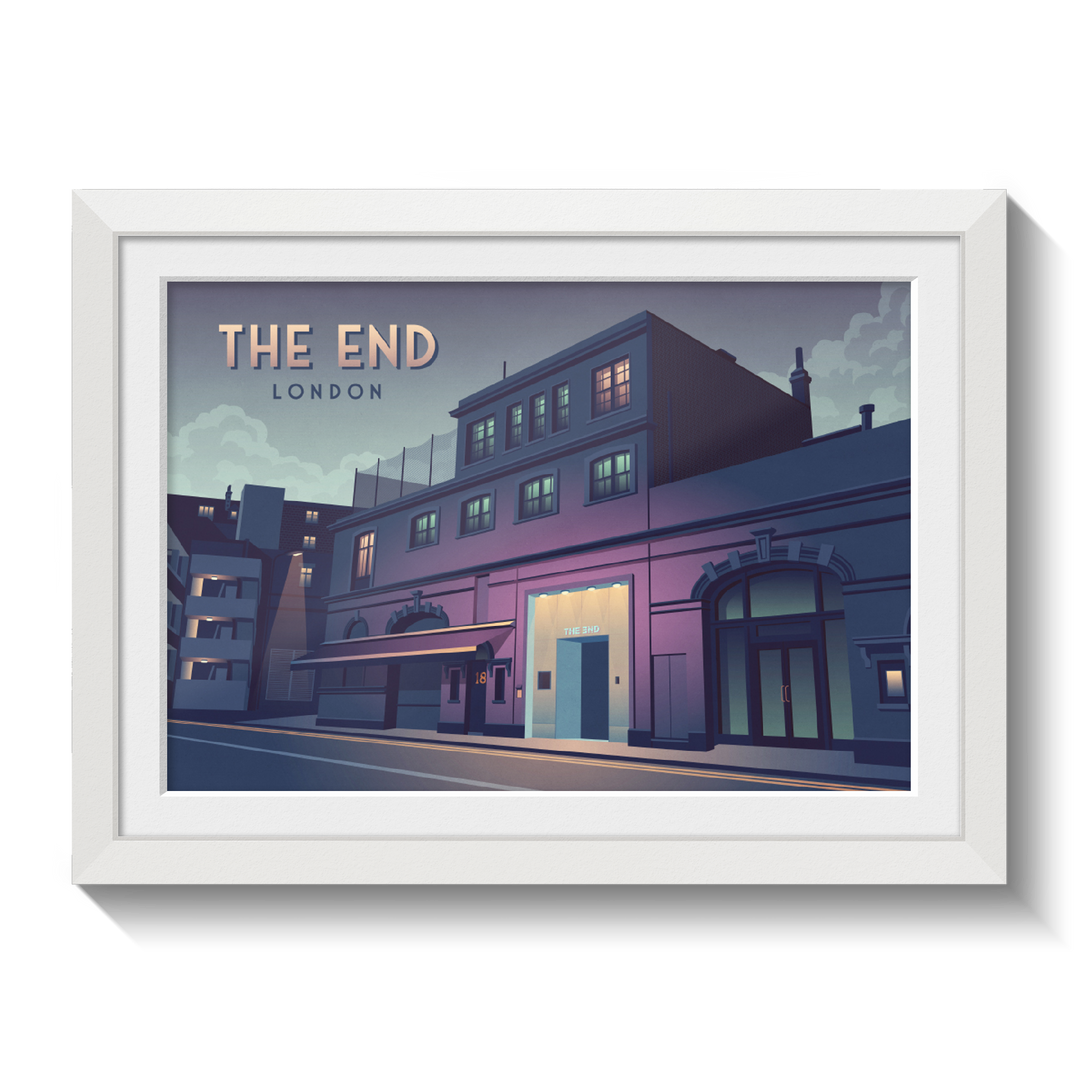 An original travel poster featuring iconic nightclub The End. Based in central London's West End, The End opened in 1996 and played a mixture of music genres including techno, house, drum and bass, breakbeat, dubstep and indie music. It sadly closed in 2009.