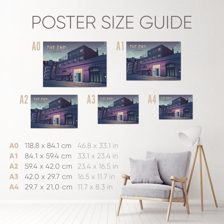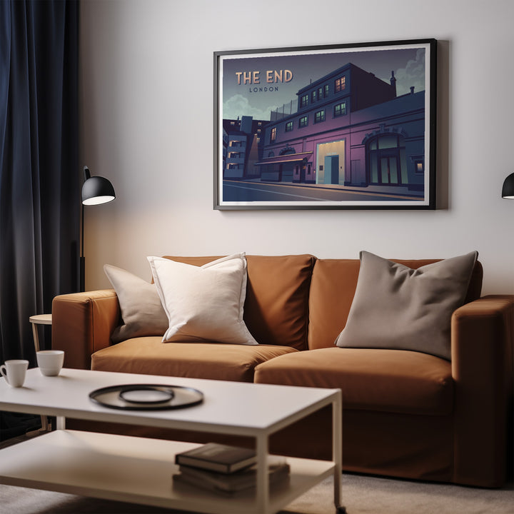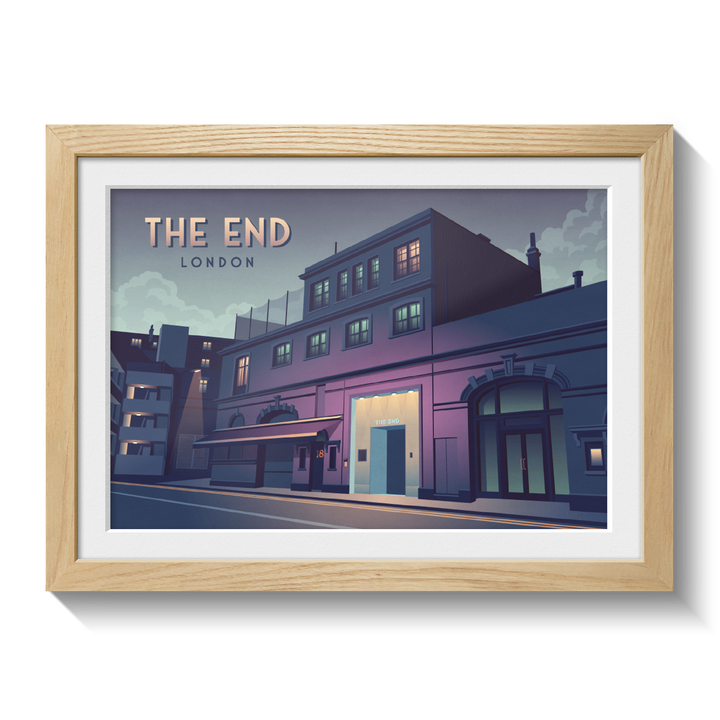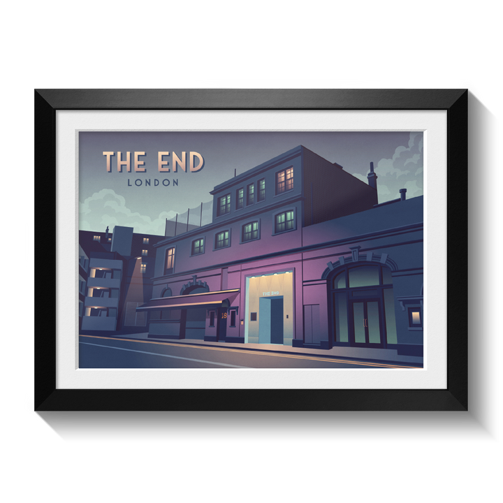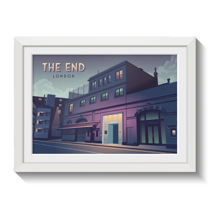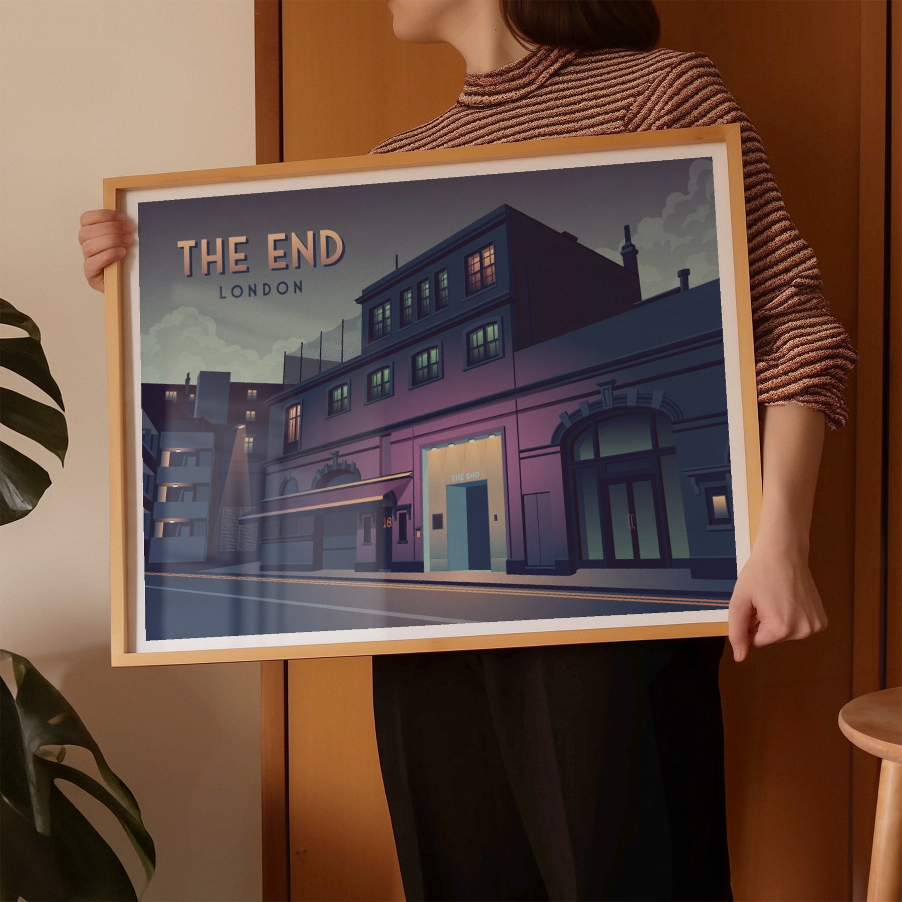 An original travel poster featuring iconic nightclub The End. Based in central London's West End, The End opened in 1996 and played a mixture of music genres including techno, house, drum and bass, breakbeat, dubstep and indie music. It sadly closed in 2009.