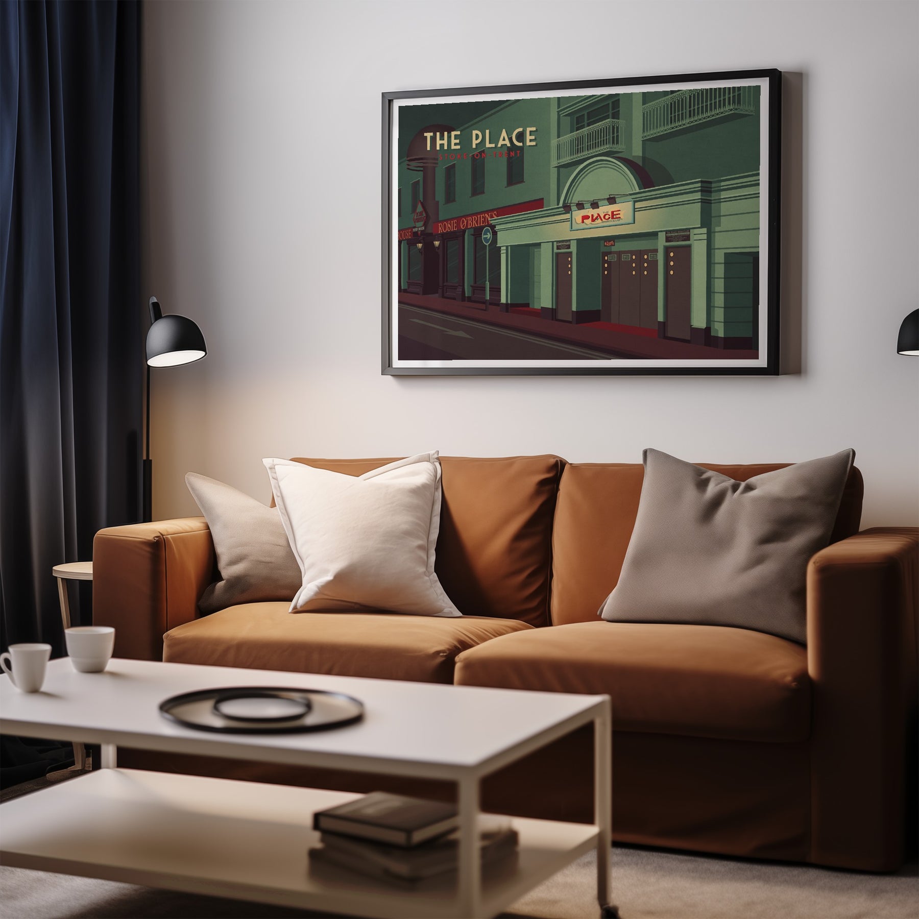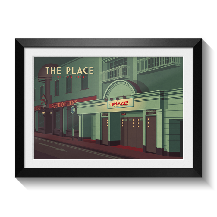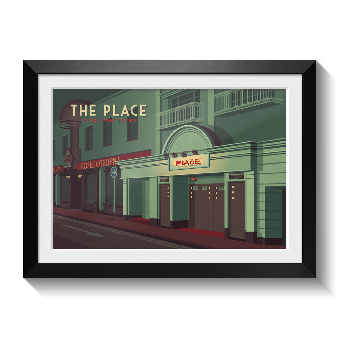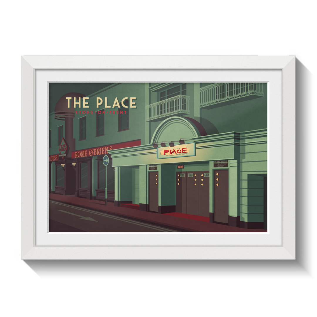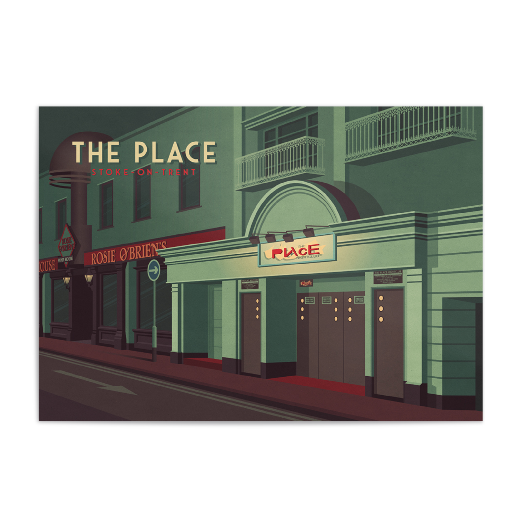 An original travel poster featuring The Place Nightclub, Stoke on Trent. It was one of the country’s most famous nightspots during the 60s and 70s, and remained open until the late nineties playing host to musical icons such as Long John Baldry, Chris Farlowe, David Bowie and Led Zeppelin.
