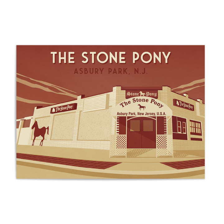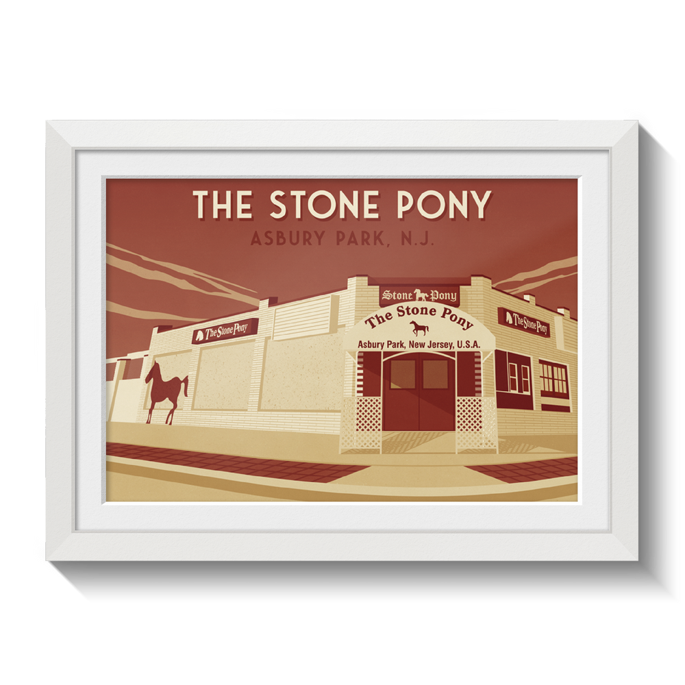 An original travel poster featuring one of New Jersey's most iconic live music venues, The Stone Pony.