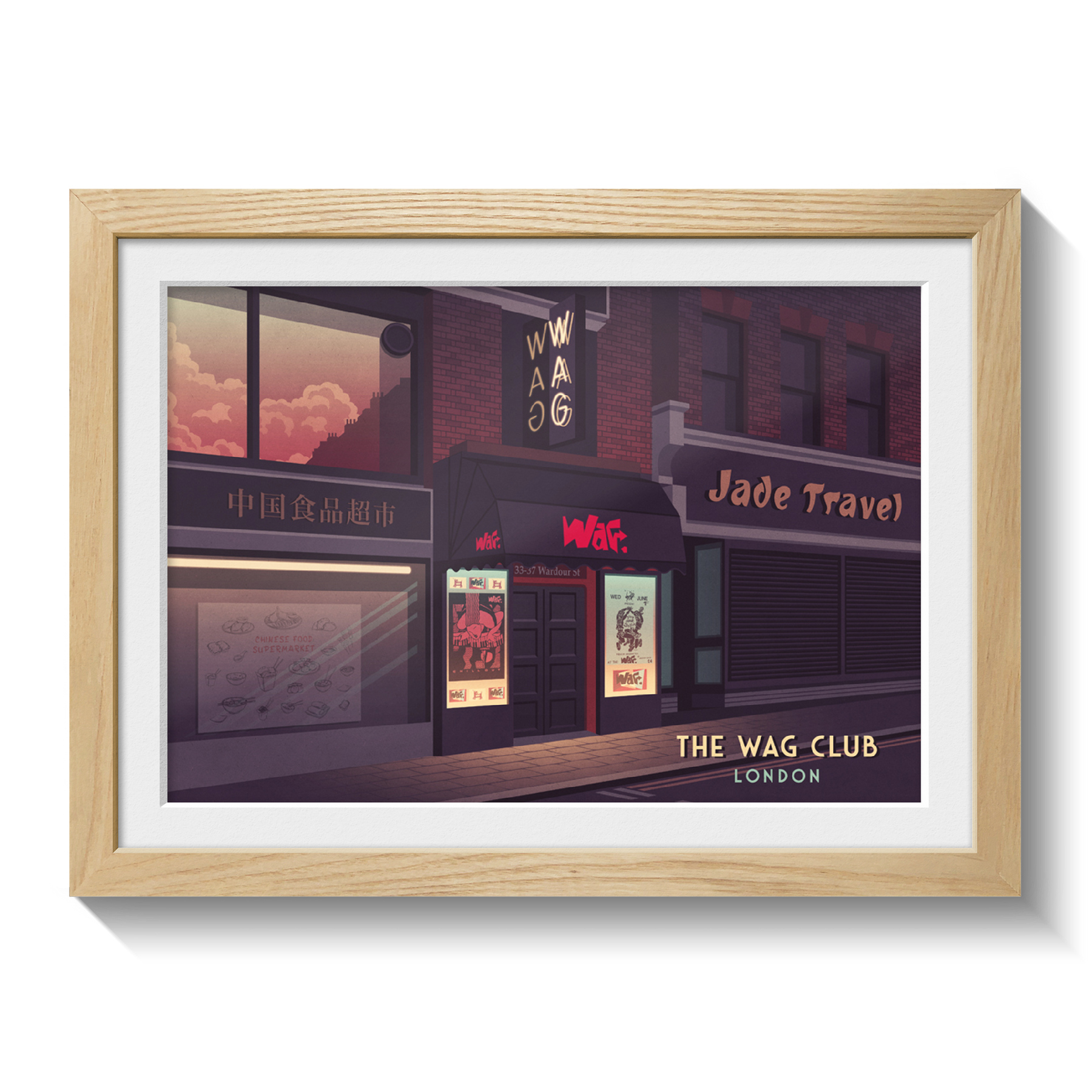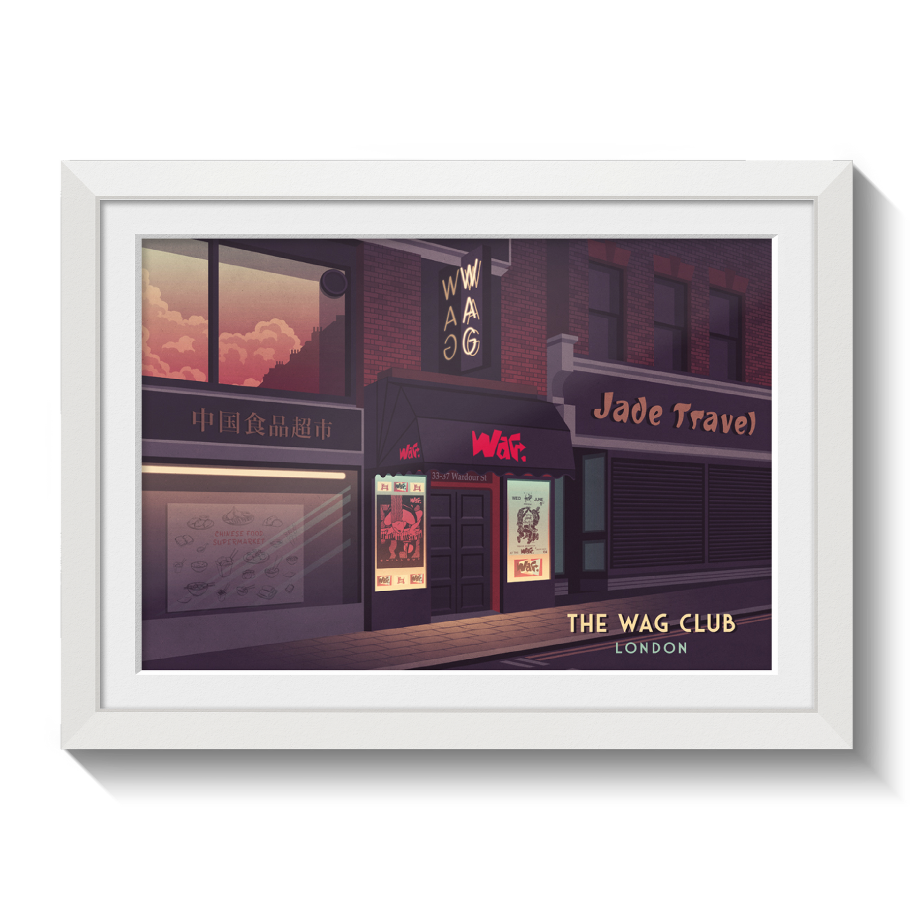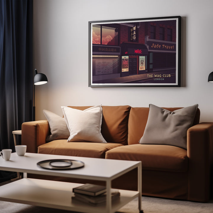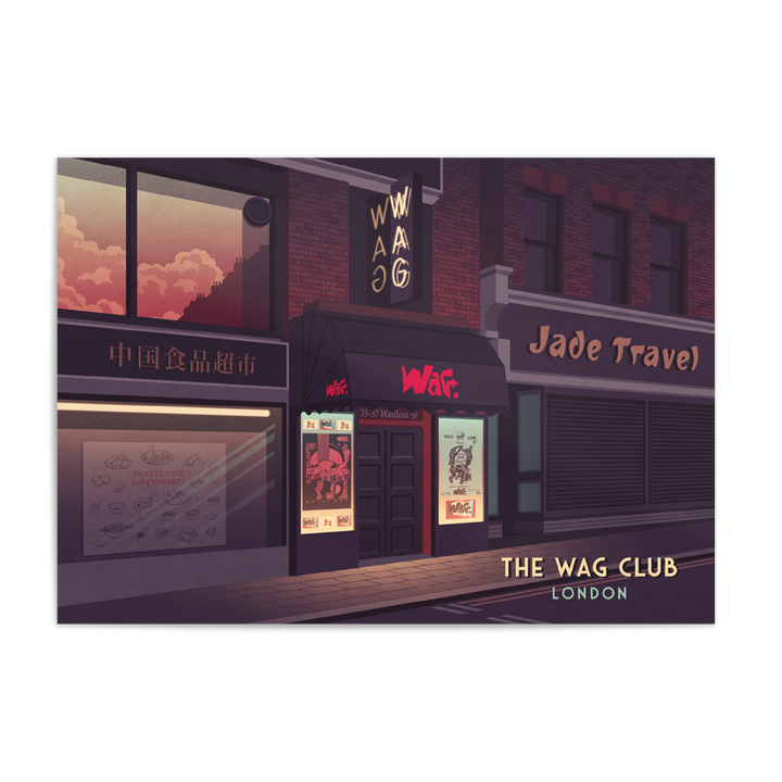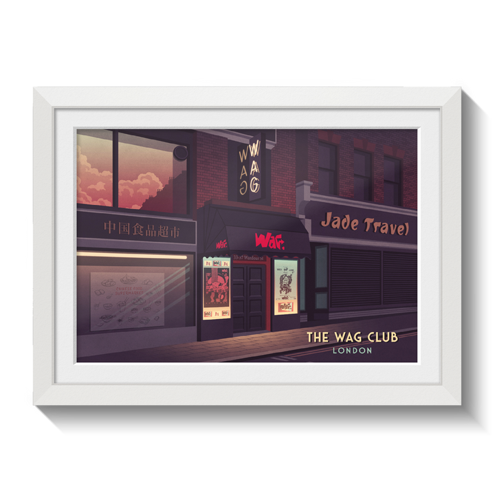 An original travel print featuring the iconic 80s London Nightclub, the Wag Club.