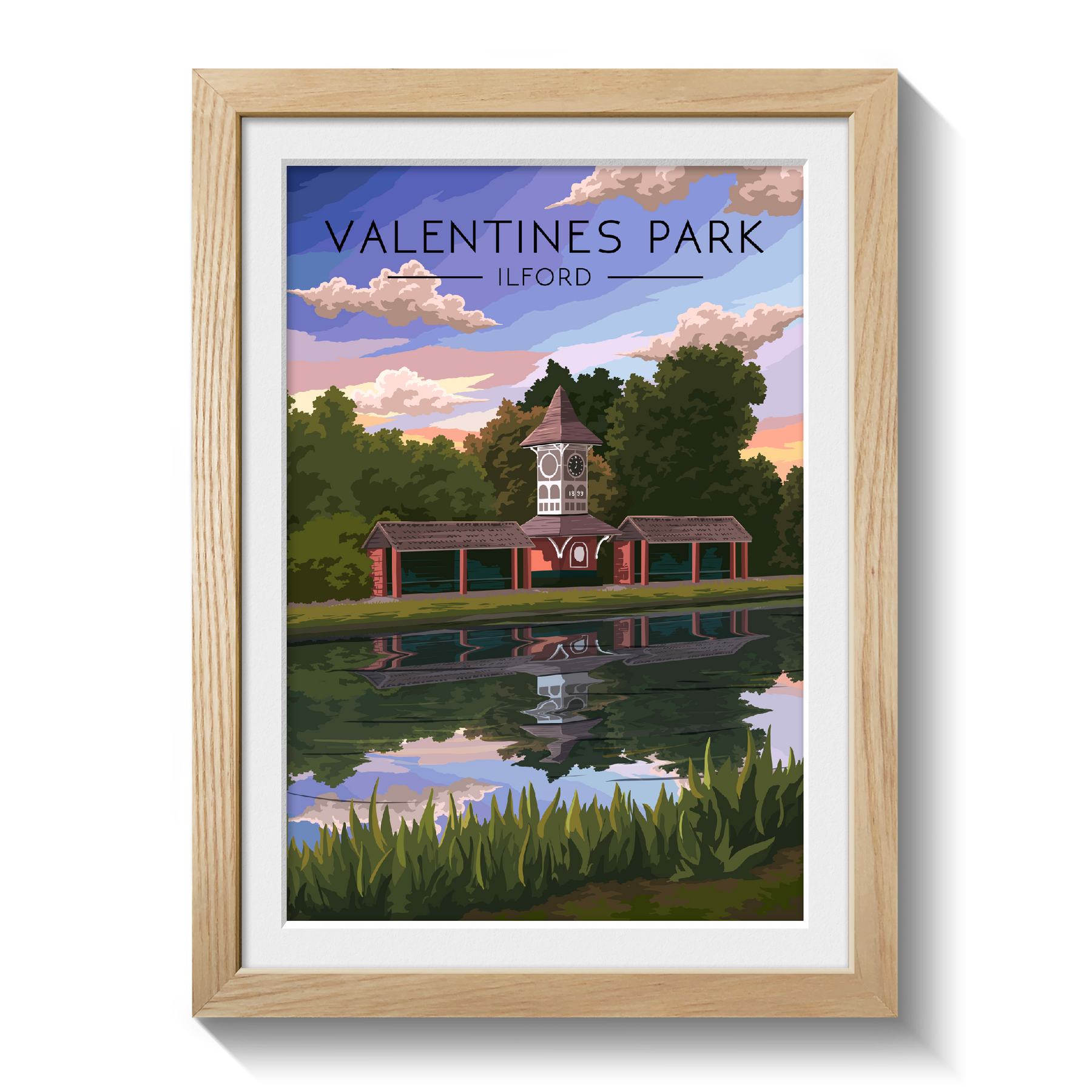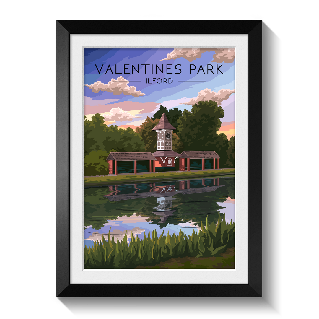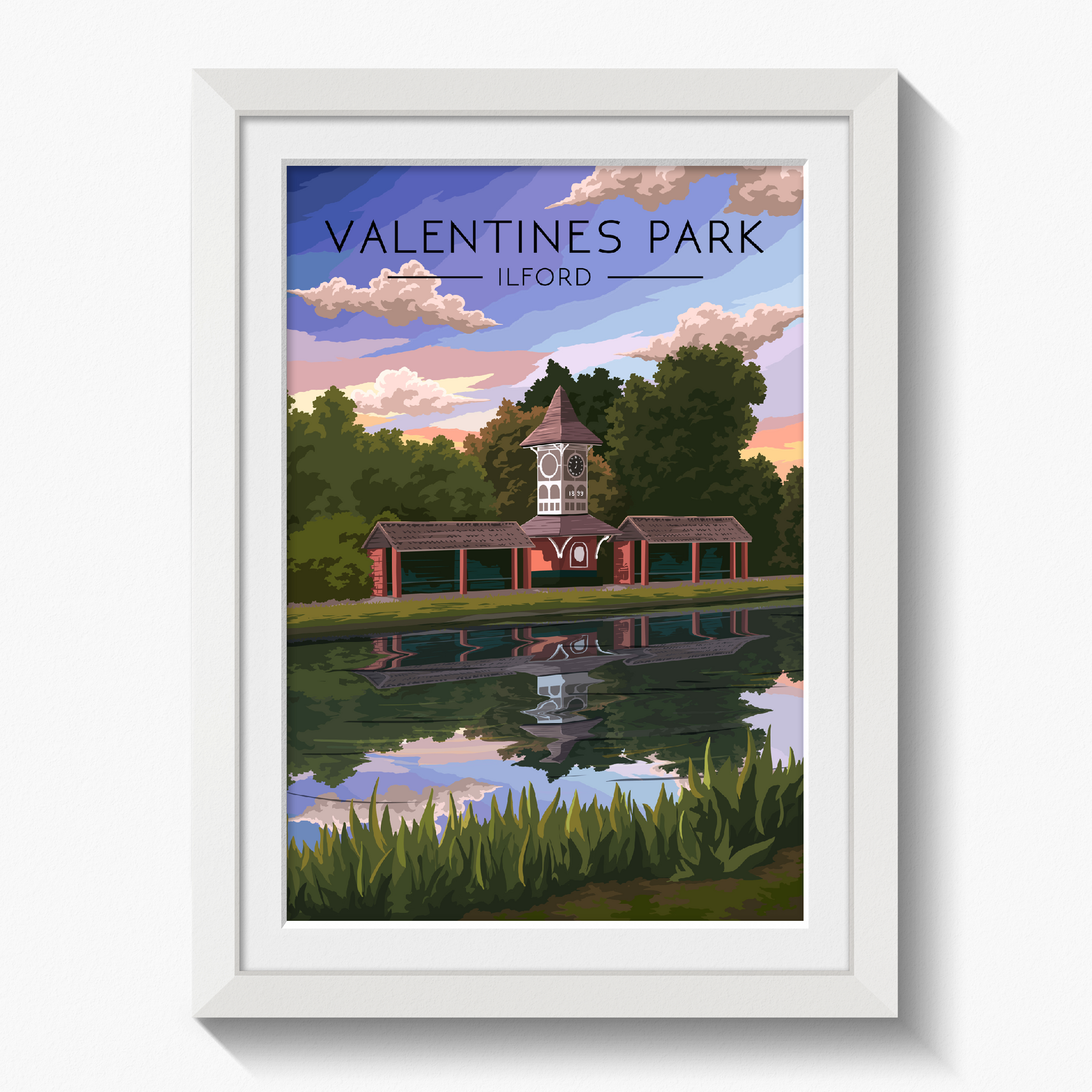 An original print featuring the boating lake and clocktower at Valentines Park in Ilford, Redbridge, just south of Gants Hill.