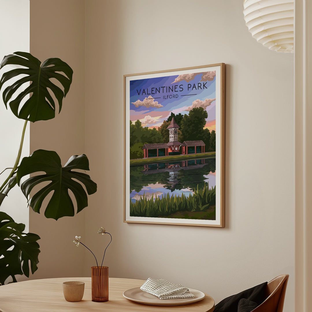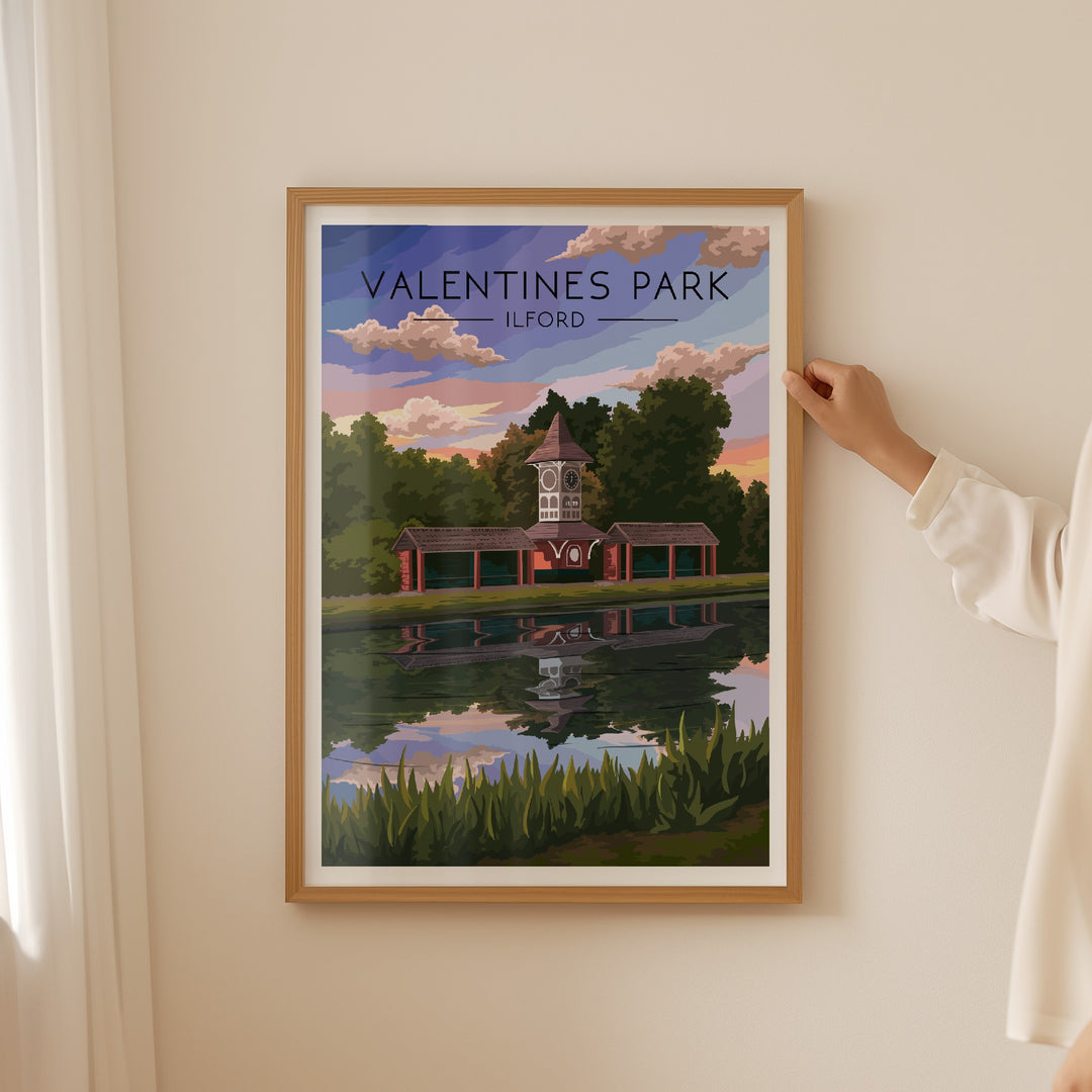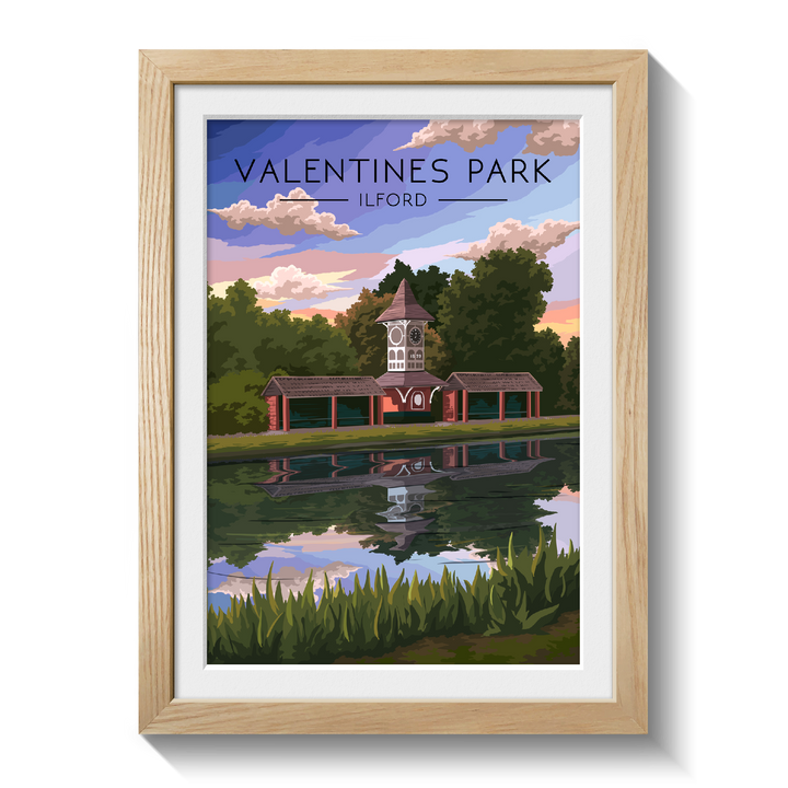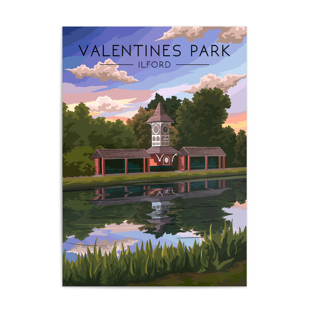 An original print featuring the boating lake and clocktower at Valentines Park in Ilford, Redbridge, just south of Gants Hill.