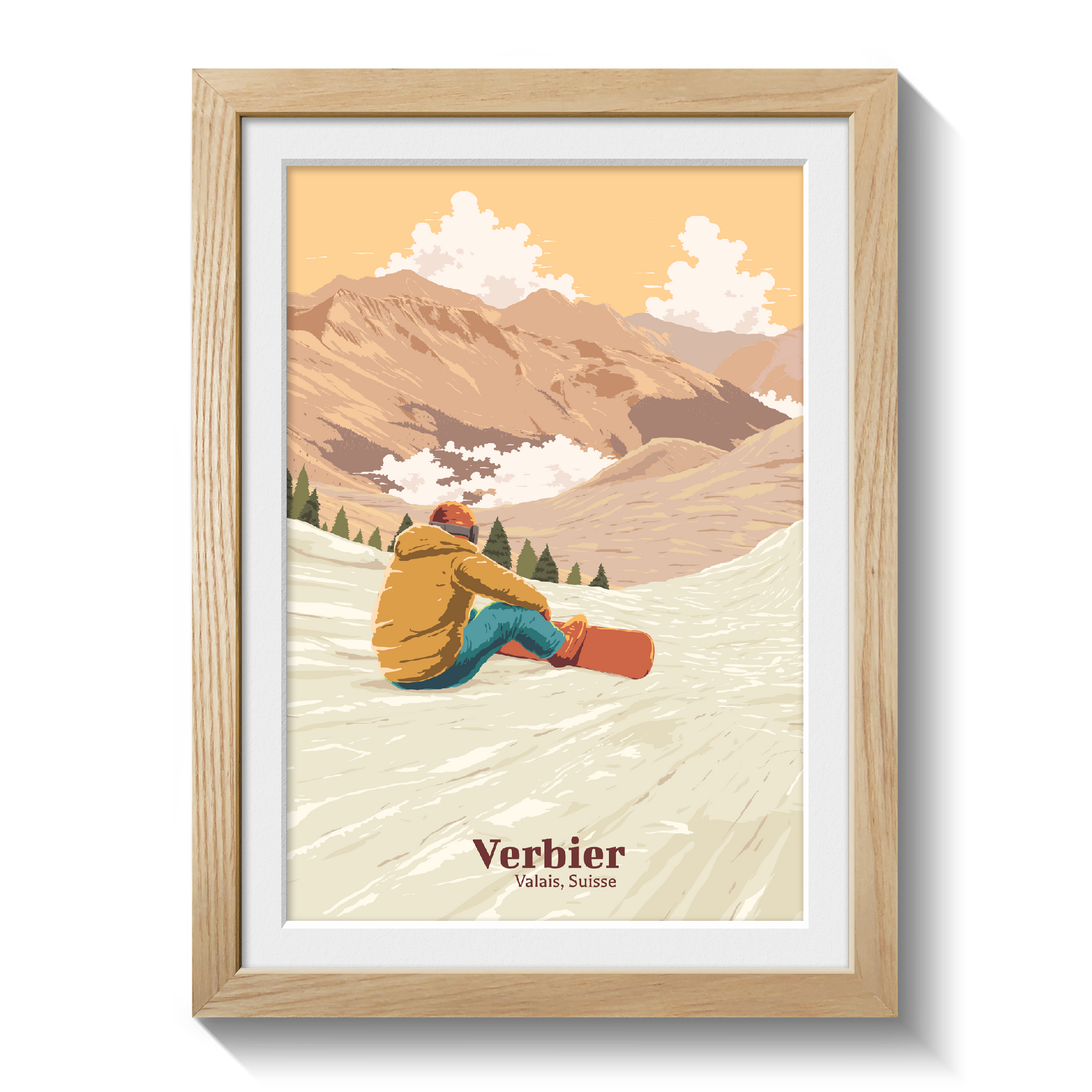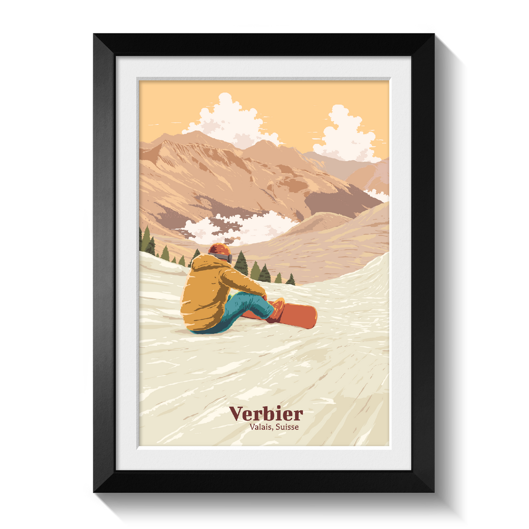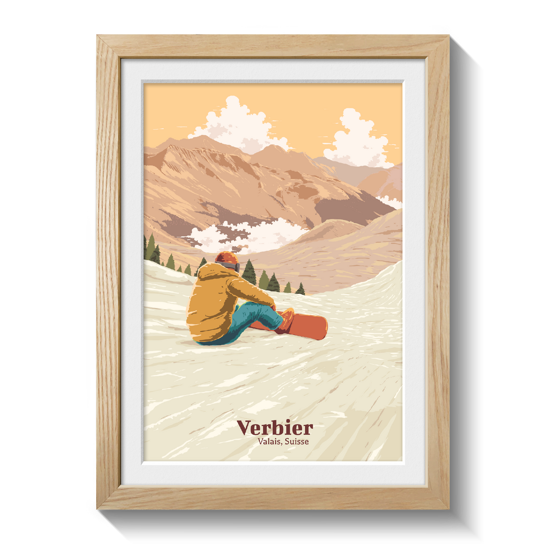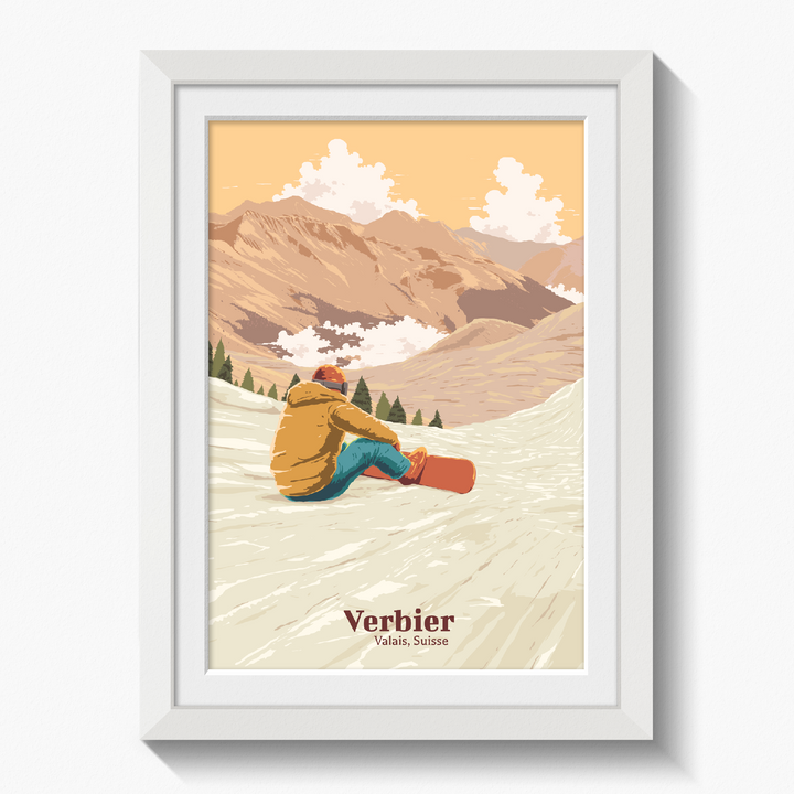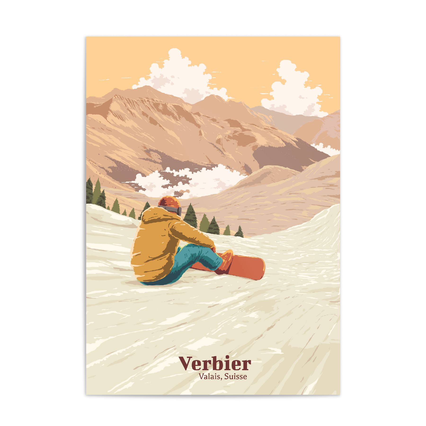 Original travel poster of the famous Swiss ski resort of Verbier. It features snowboarder relaxing on the slopes with the Swiss Alps as the dramatic backdrop.