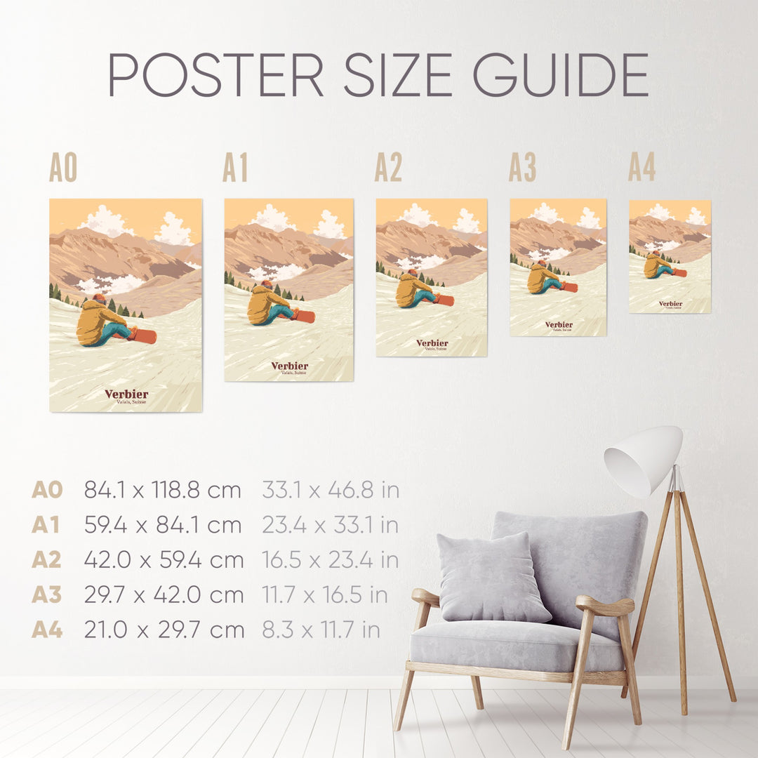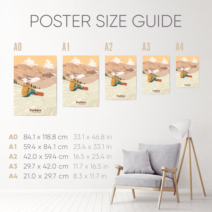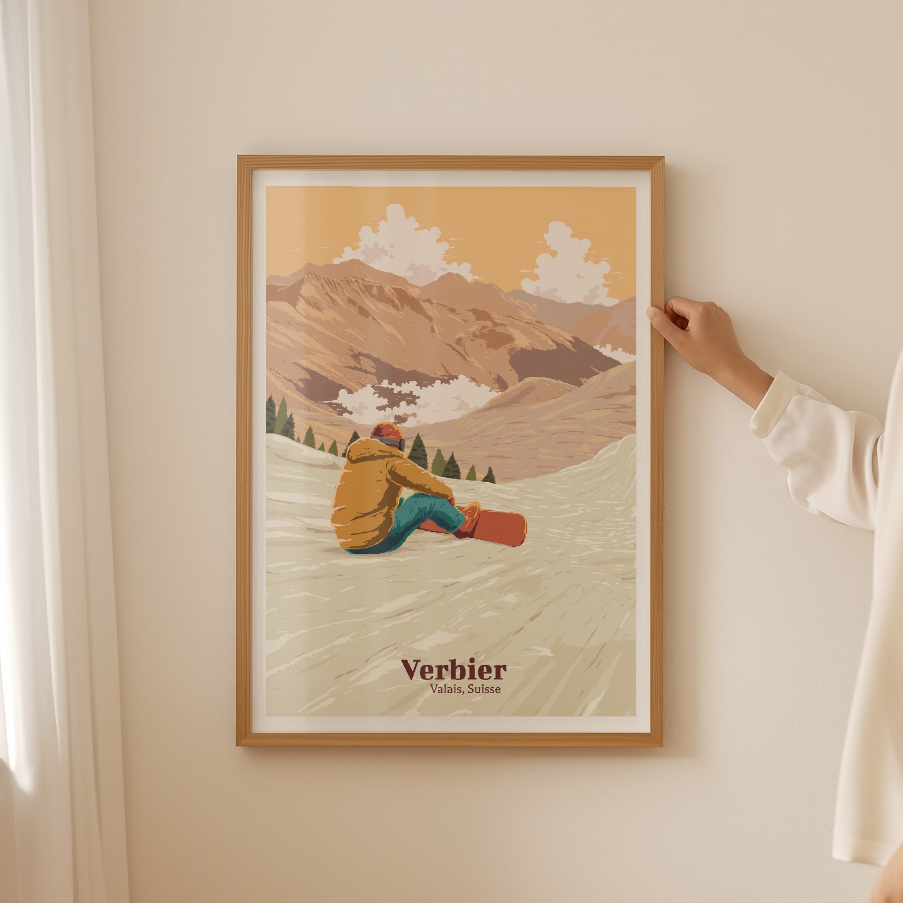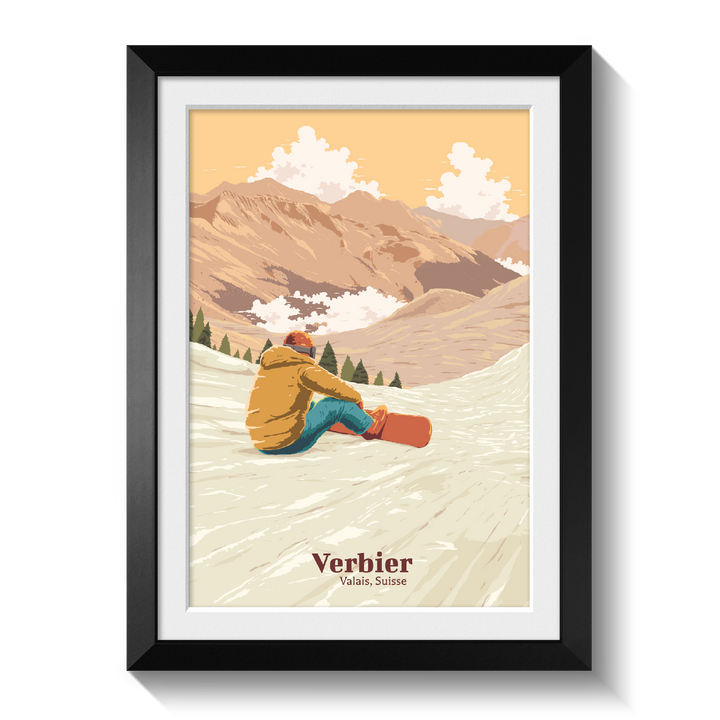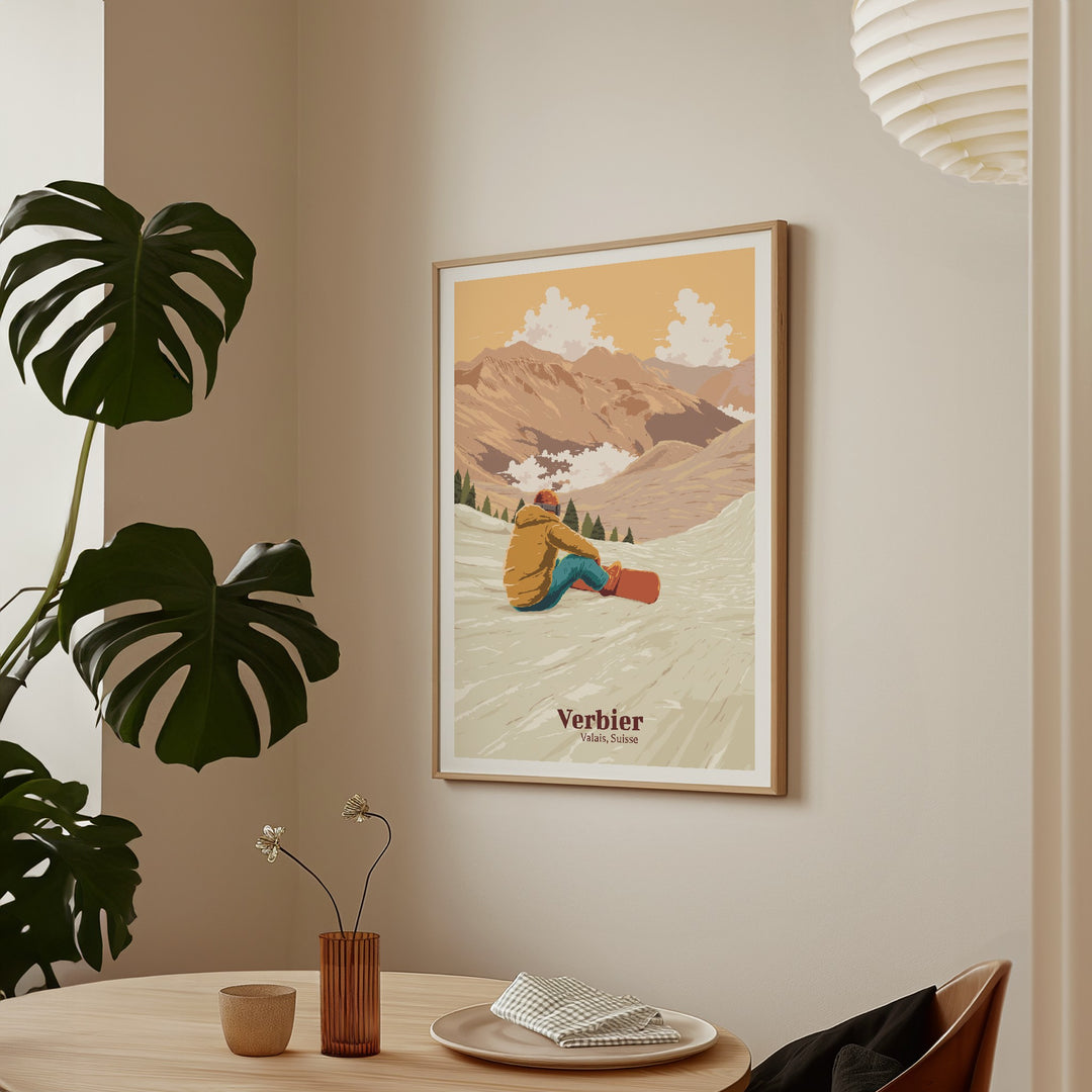 Original travel poster of the famous Swiss ski resort of Verbier. It features snowboarder relaxing on the slopes with the Swiss Alps as the dramatic backdrop.