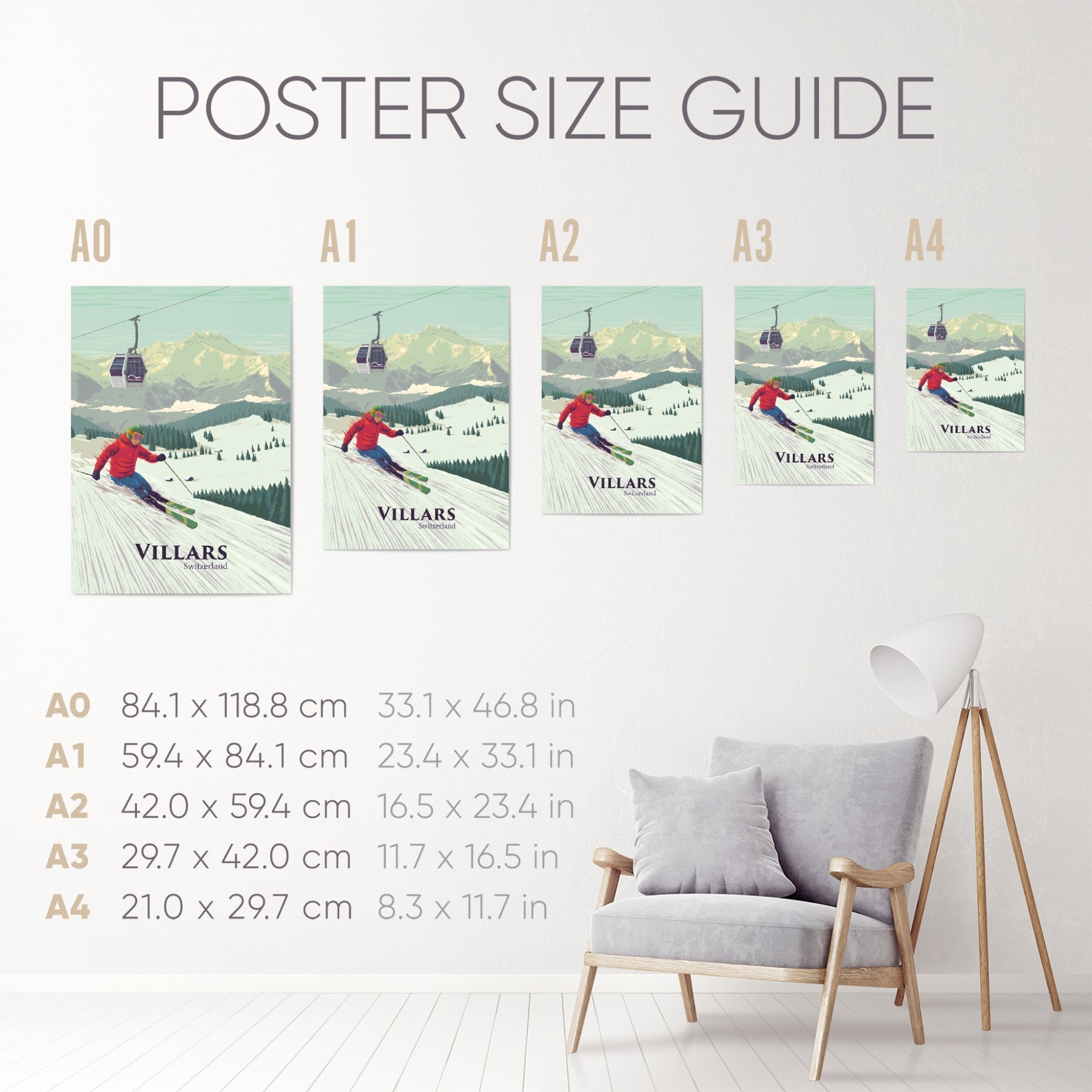 An original skiing travel poster of the Swiss ski resort of Villars.