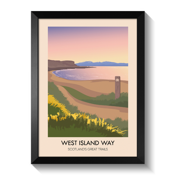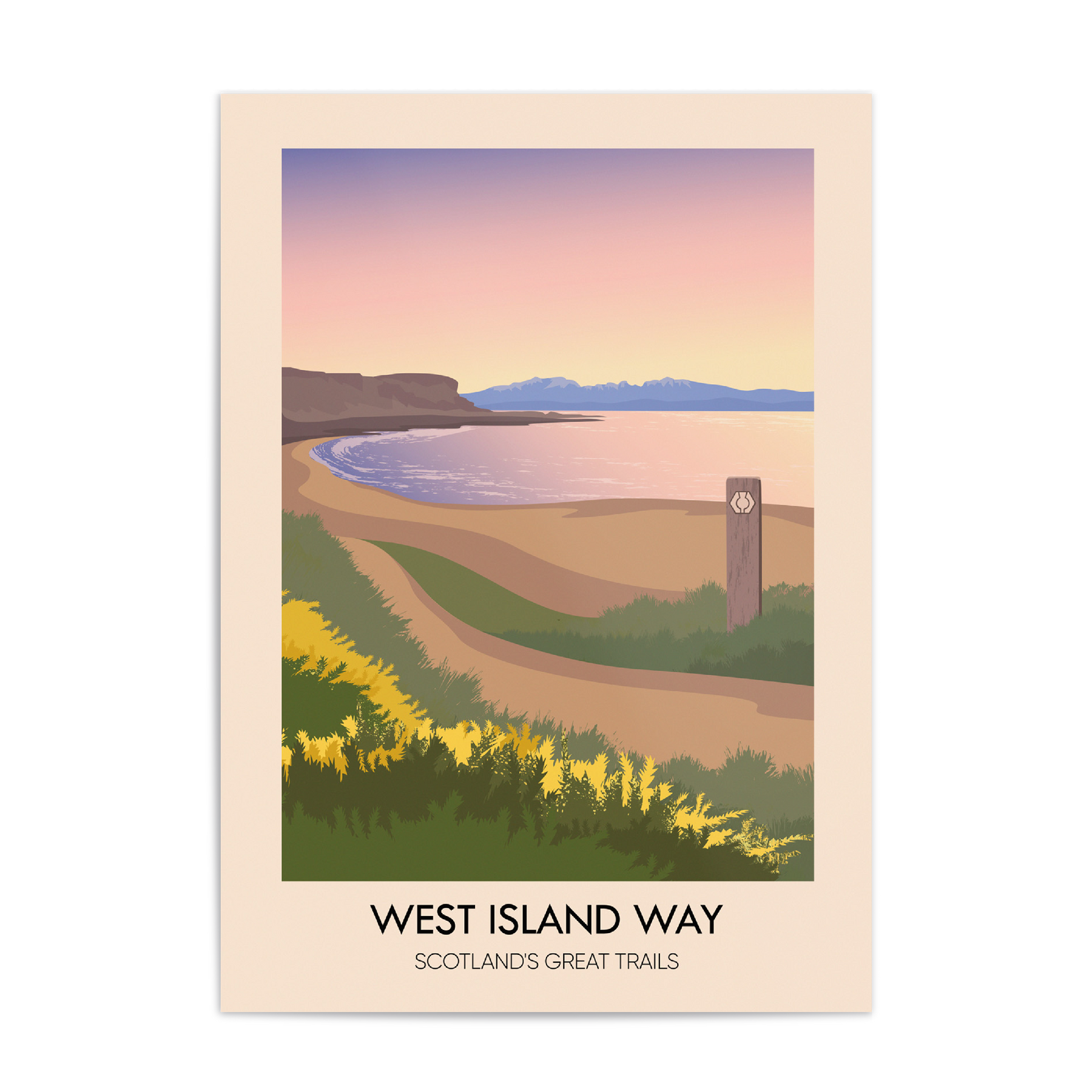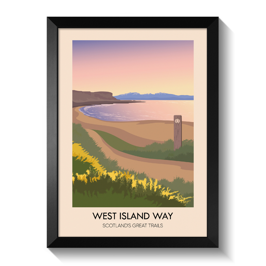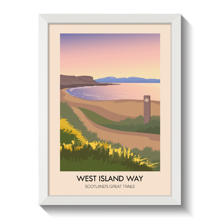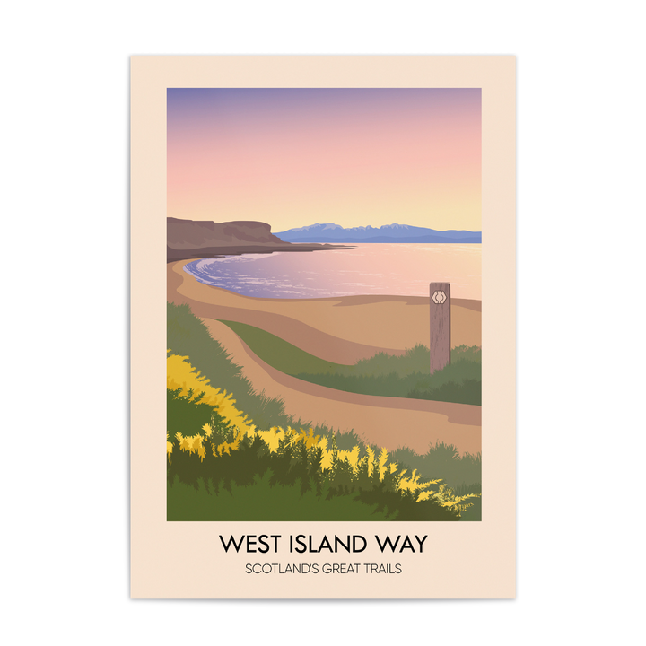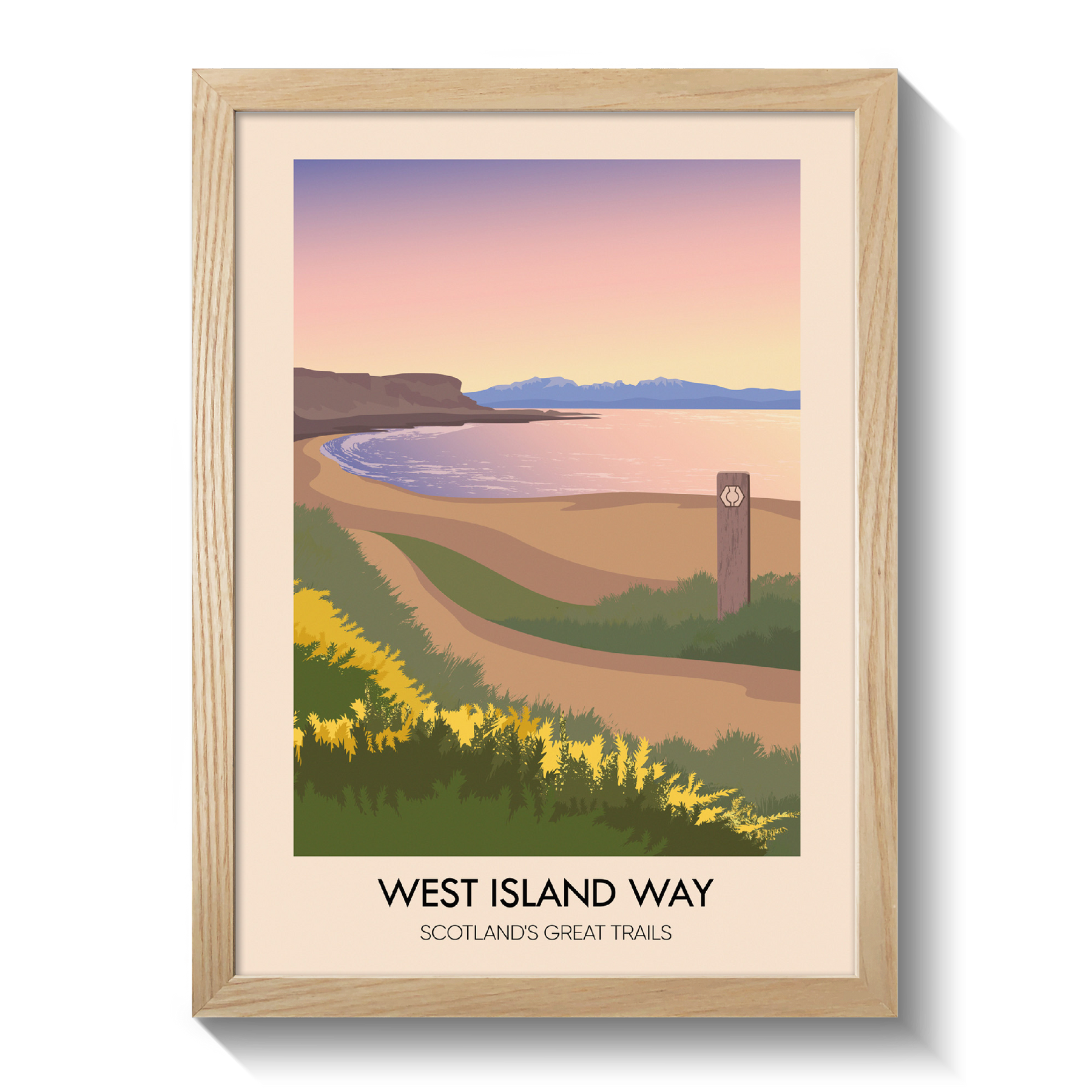 This original travel print features the West Island Way hiking route. West Island Way is a 30 mile trail around the Isle of Bute. This path is the first Scottish Island path, it was opened in 2000 to celebrate the millennium.