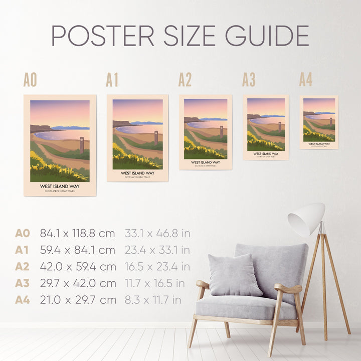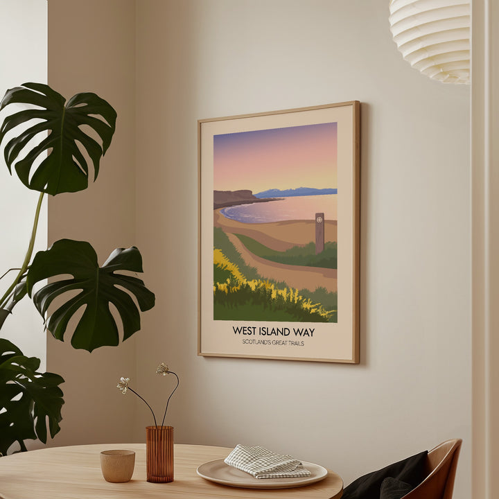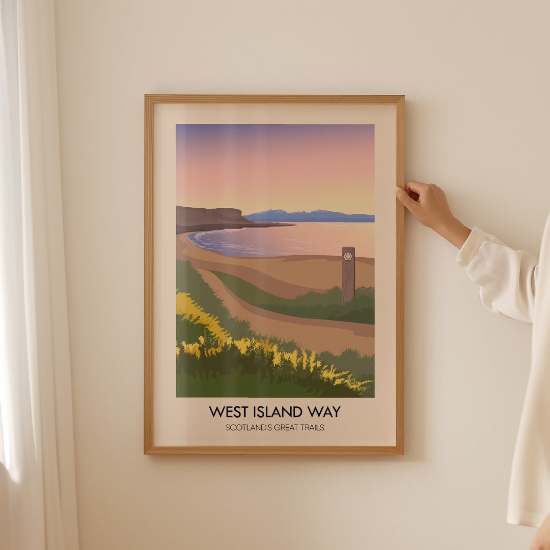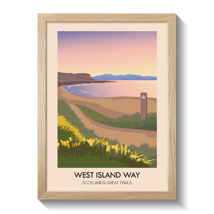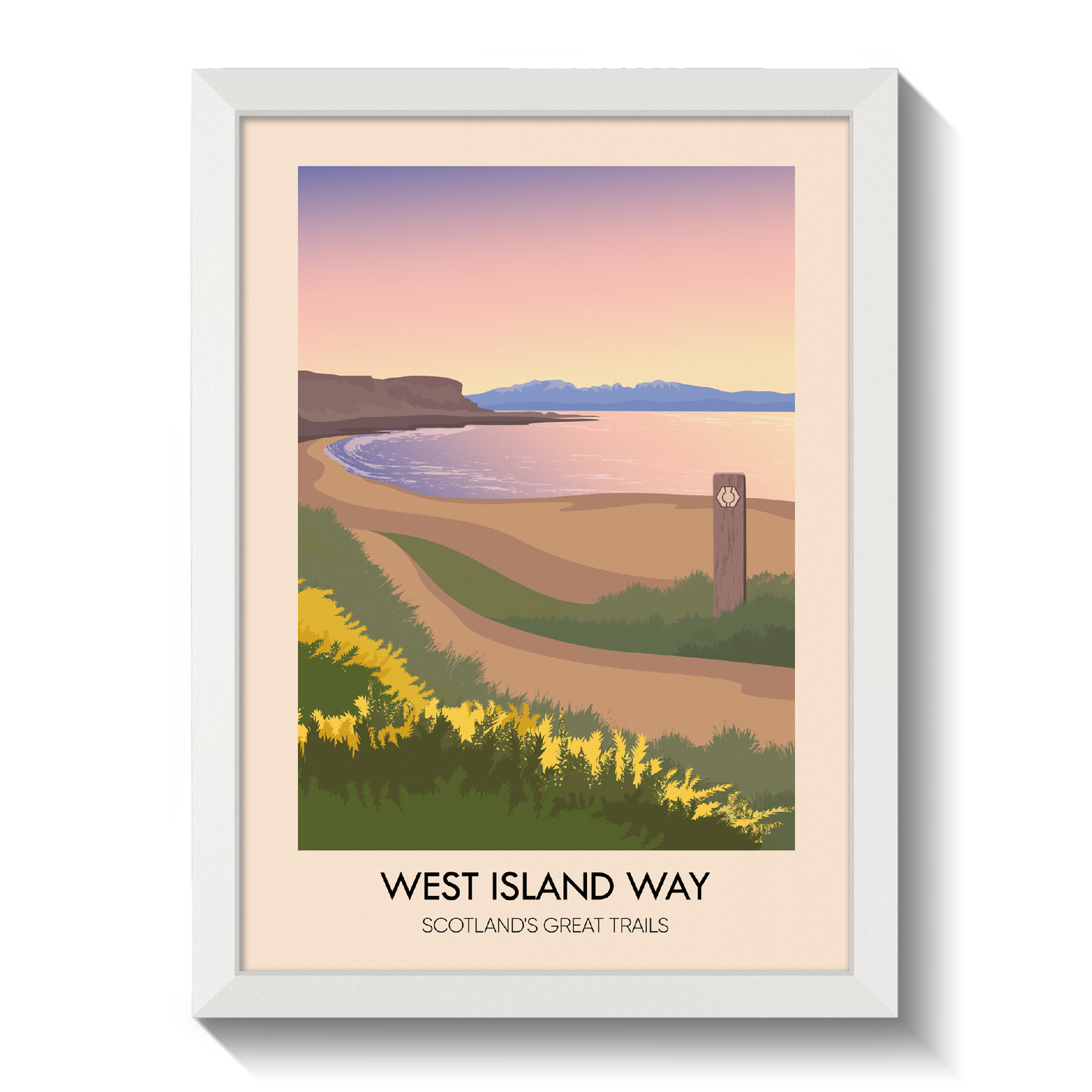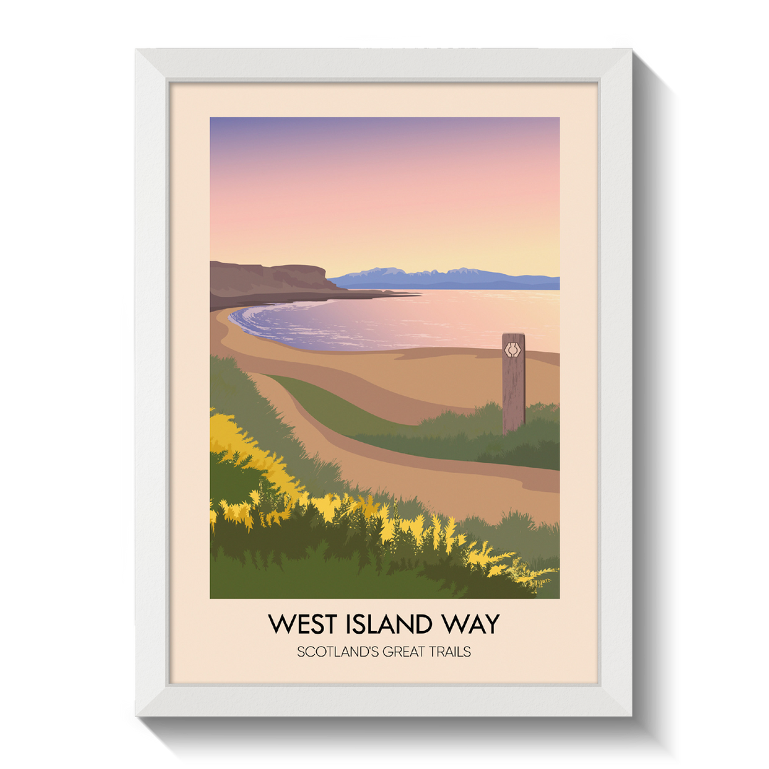 This original travel print features the West Island Way hiking route. West Island Way is a 30 mile trail around the Isle of Bute. This path is the first Scottish Island path, it was opened in 2000 to celebrate the millennium.
