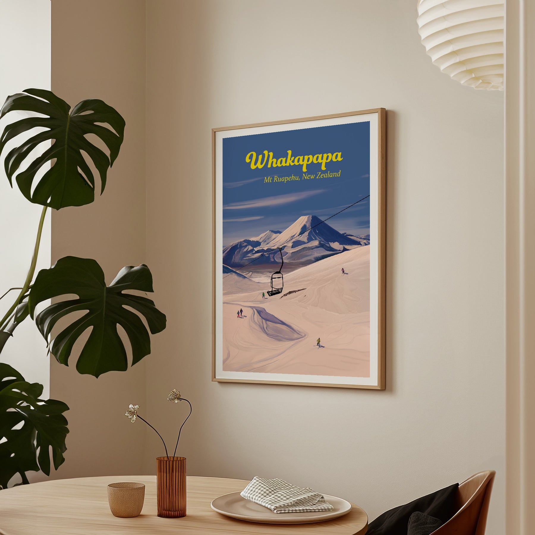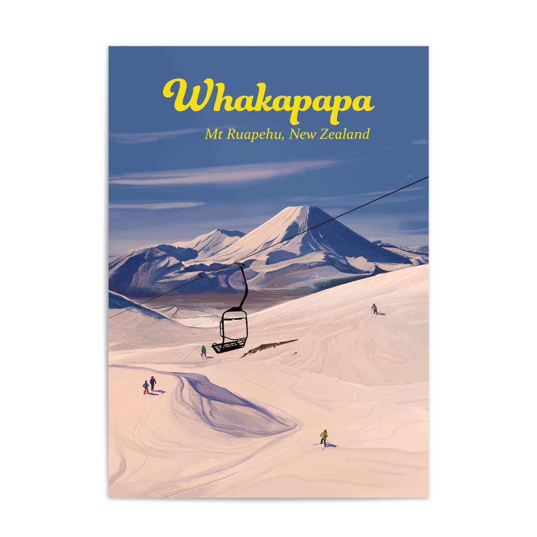 An original skiing travel poster featuring the popular resort of Whakapapa on New Zealand's North Island on Mount Ruapehu. Whakapapa ski resort is situated in the Tongariro National Park, along with Turoa and Tukino Ski Resorts.