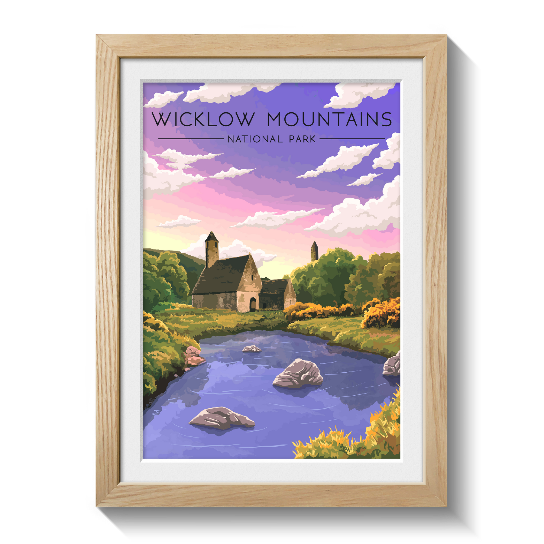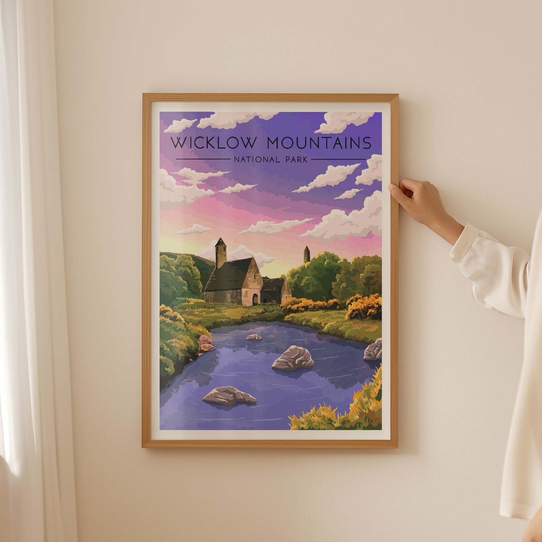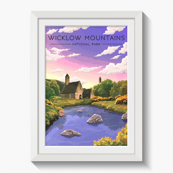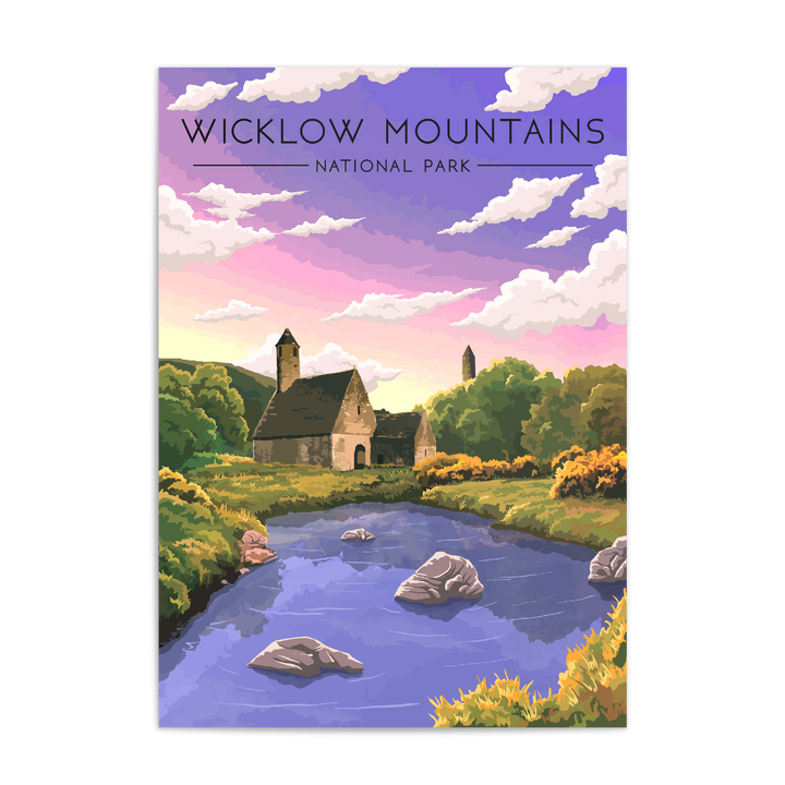 This is an original travel poster of Ireland's Wicklow Mountains National Park in County Wicklow. Featuring the famous Glendalough Valley with the historical Glendalough Monastery visible in the distance.