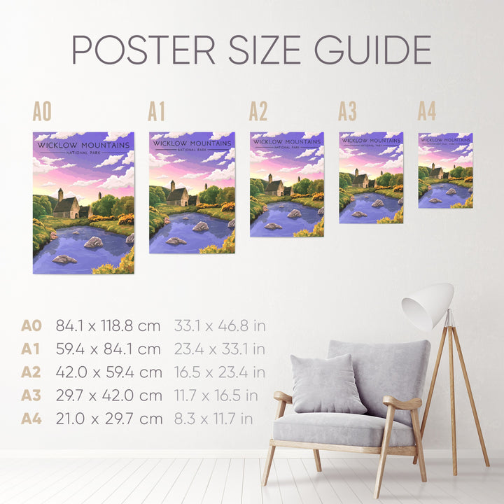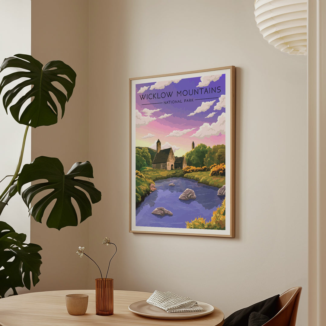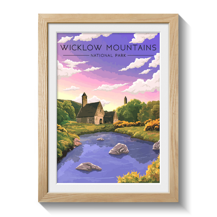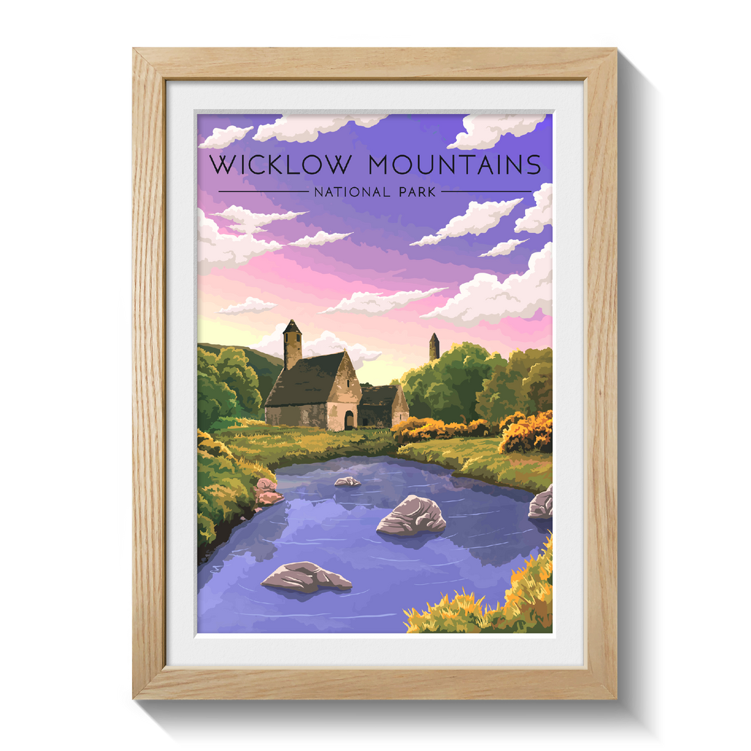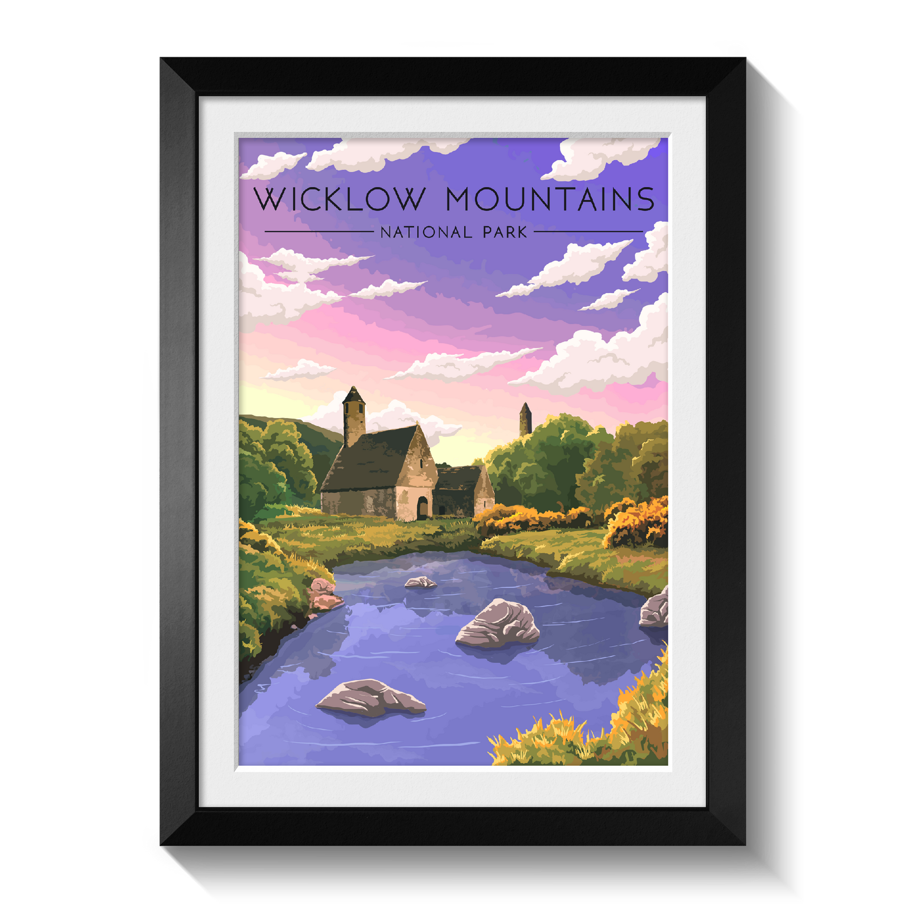 This is an original travel poster of Ireland's Wicklow Mountains National Park in County Wicklow. Featuring the famous Glendalough Valley with the historical Glendalough Monastery visible in the distance.