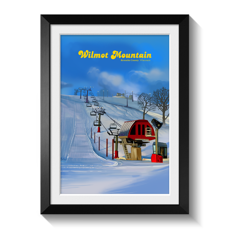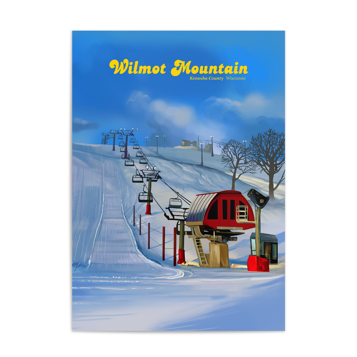 This is an original ski resort print featuring Wilmot Mountain Resort, Wisconsin USA. Wilmot ski resort is one of the 36 ski resorts in Wisconsin and is known as one of the best in the area. Located near the border of Illinois, it is a popular resort with people from Chicago.