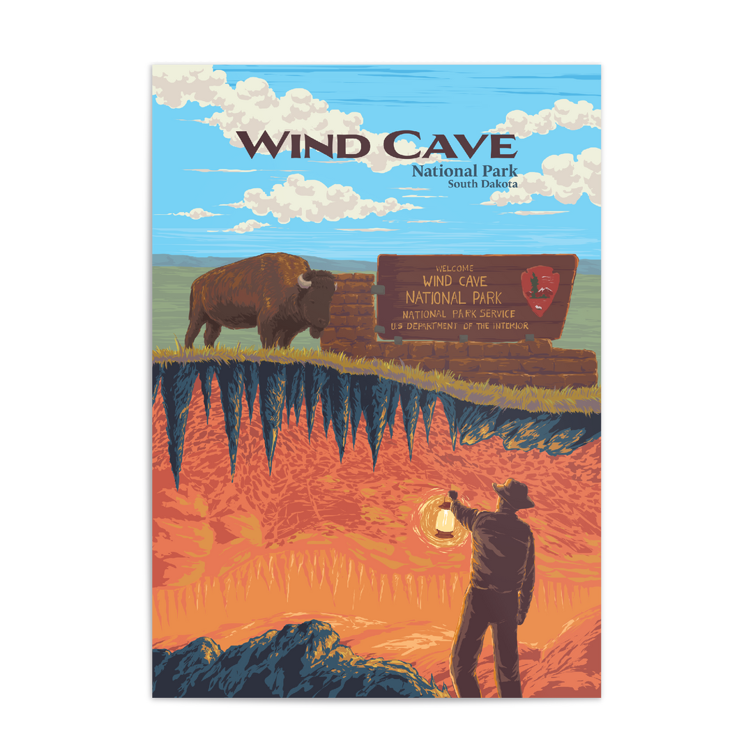An original travel poster featuring Wind Cave National Park in South Dakota, named for the vast, underground Wind Cave. Above ground, the park's prairie and pine forests are home to bison, elk and pronghorn antelopes.