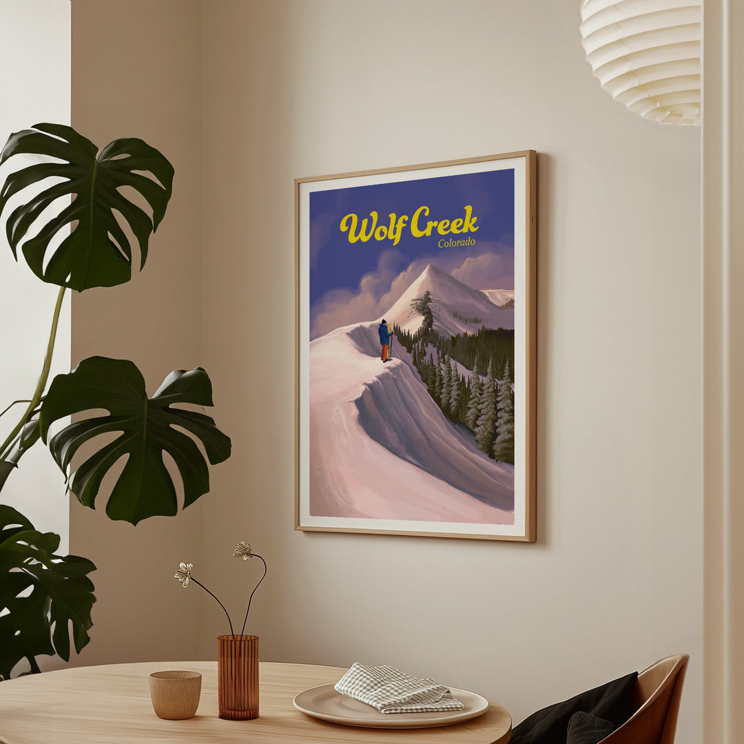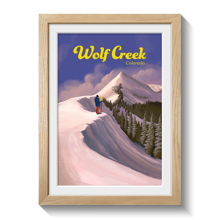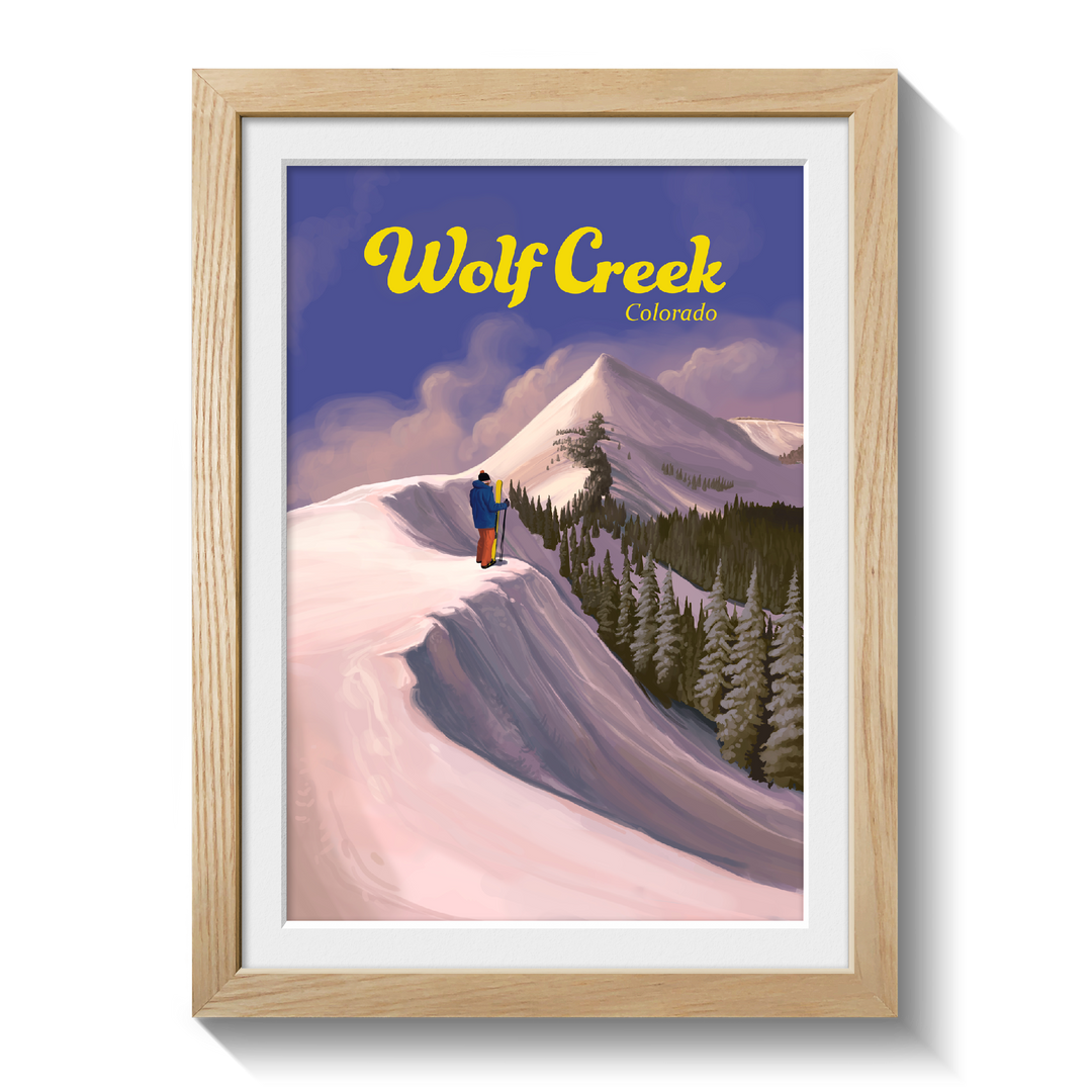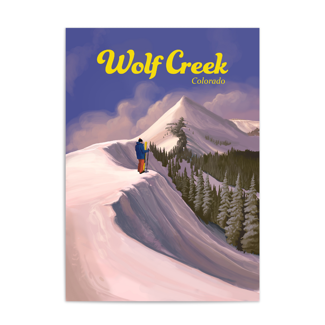 This is an original travel poster featuring the Wolf Creek Ski Area, located on the Wolf Creek Pass between the towns of Pagosa Springs and South Fork. Wolf Creek is a popular, snowboard friendly resort known to get the most snow in the whole state of Colorado.