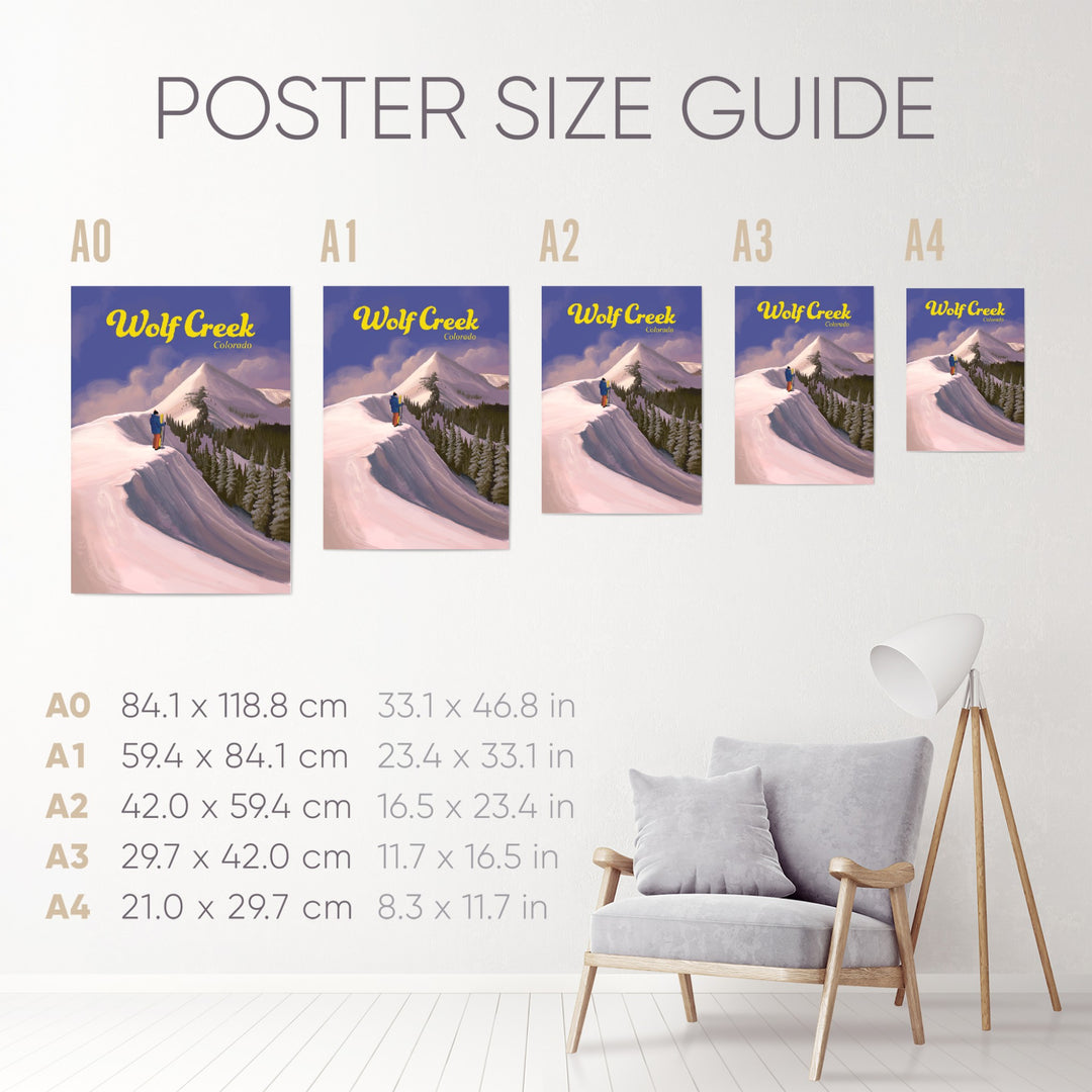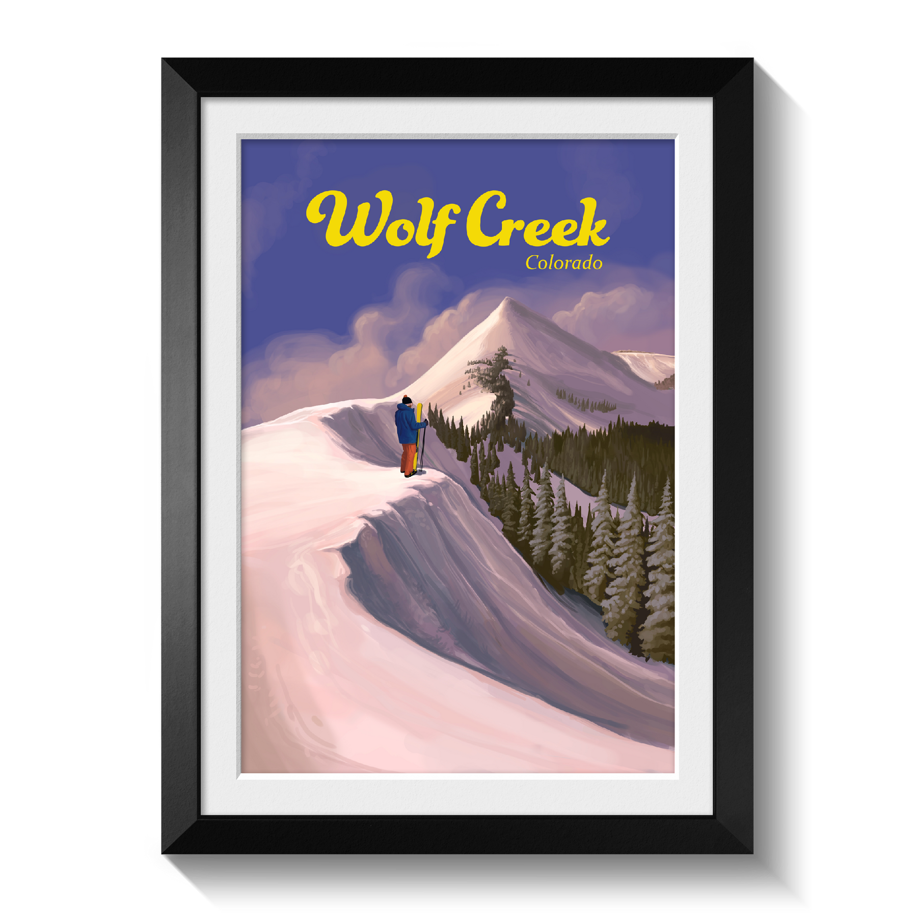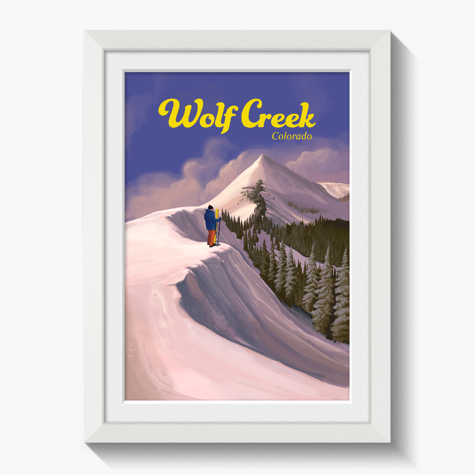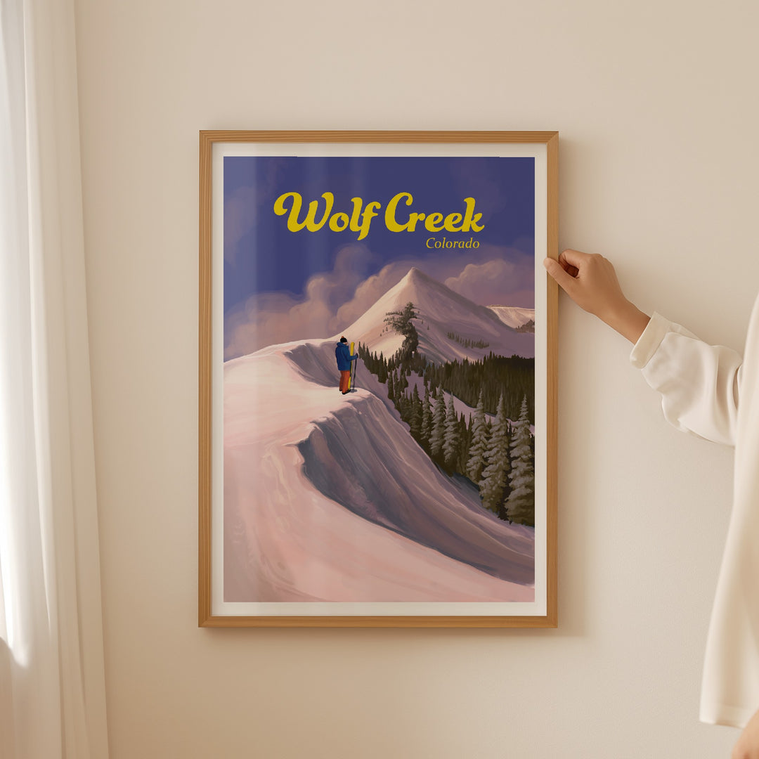 This is an original travel poster featuring the Wolf Creek Ski Area, located on the Wolf Creek Pass between the towns of Pagosa Springs and South Fork. Wolf Creek is a popular, snowboard friendly resort known to get the most snow in the whole state of Colorado.