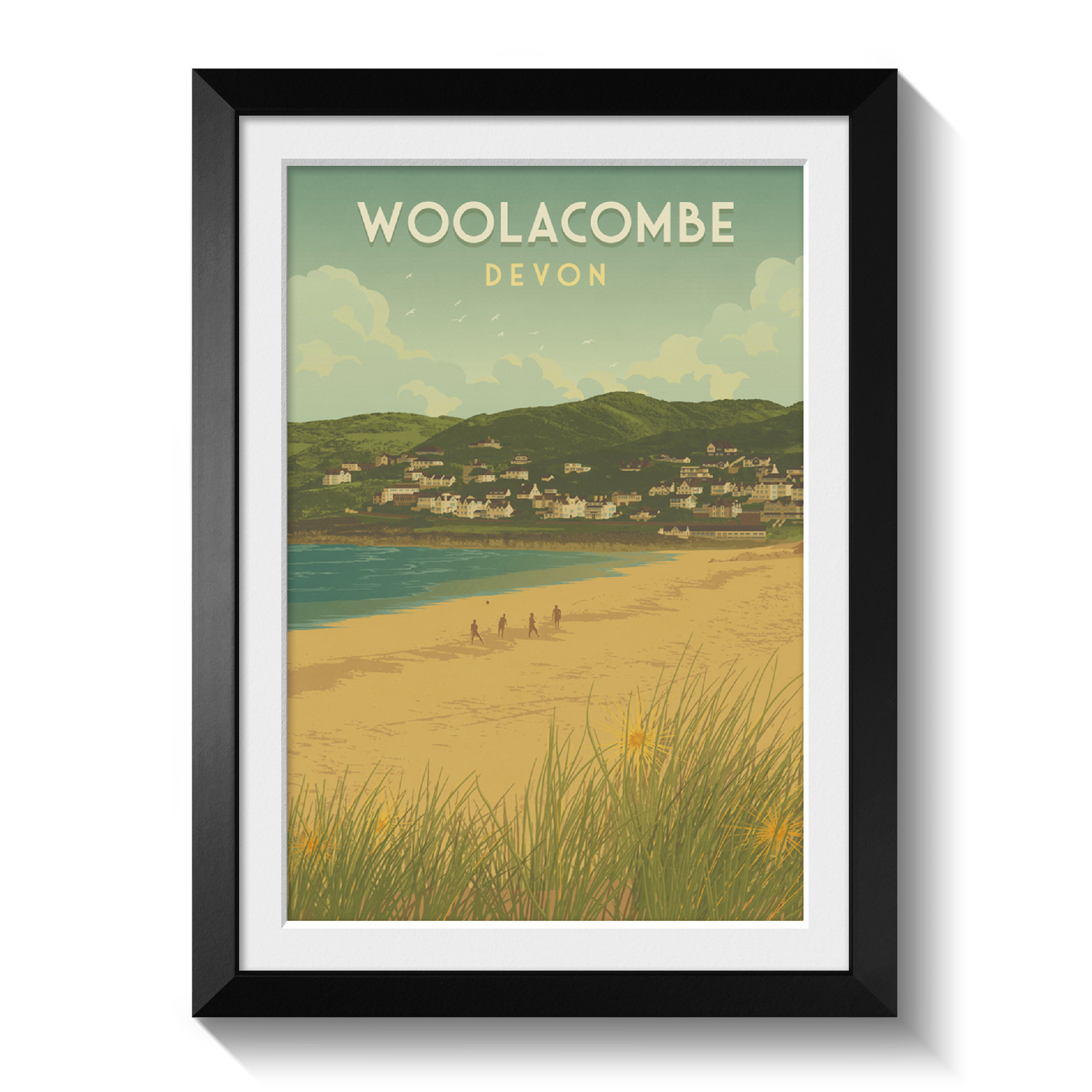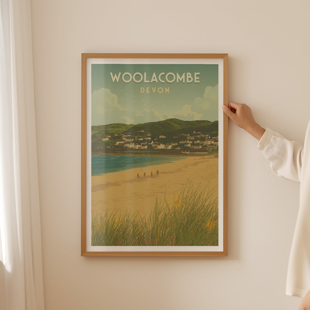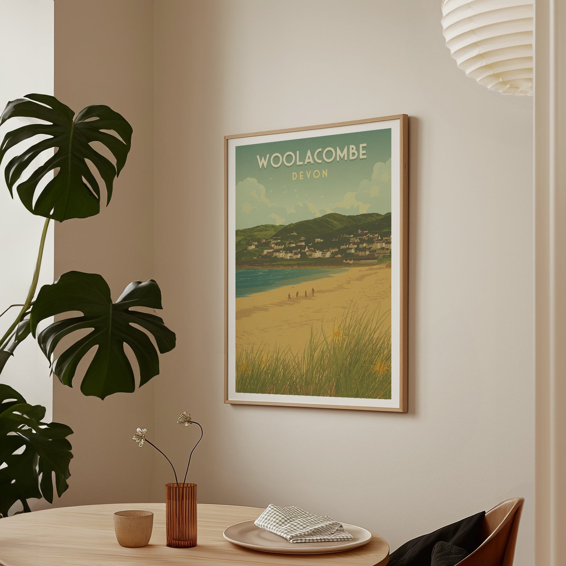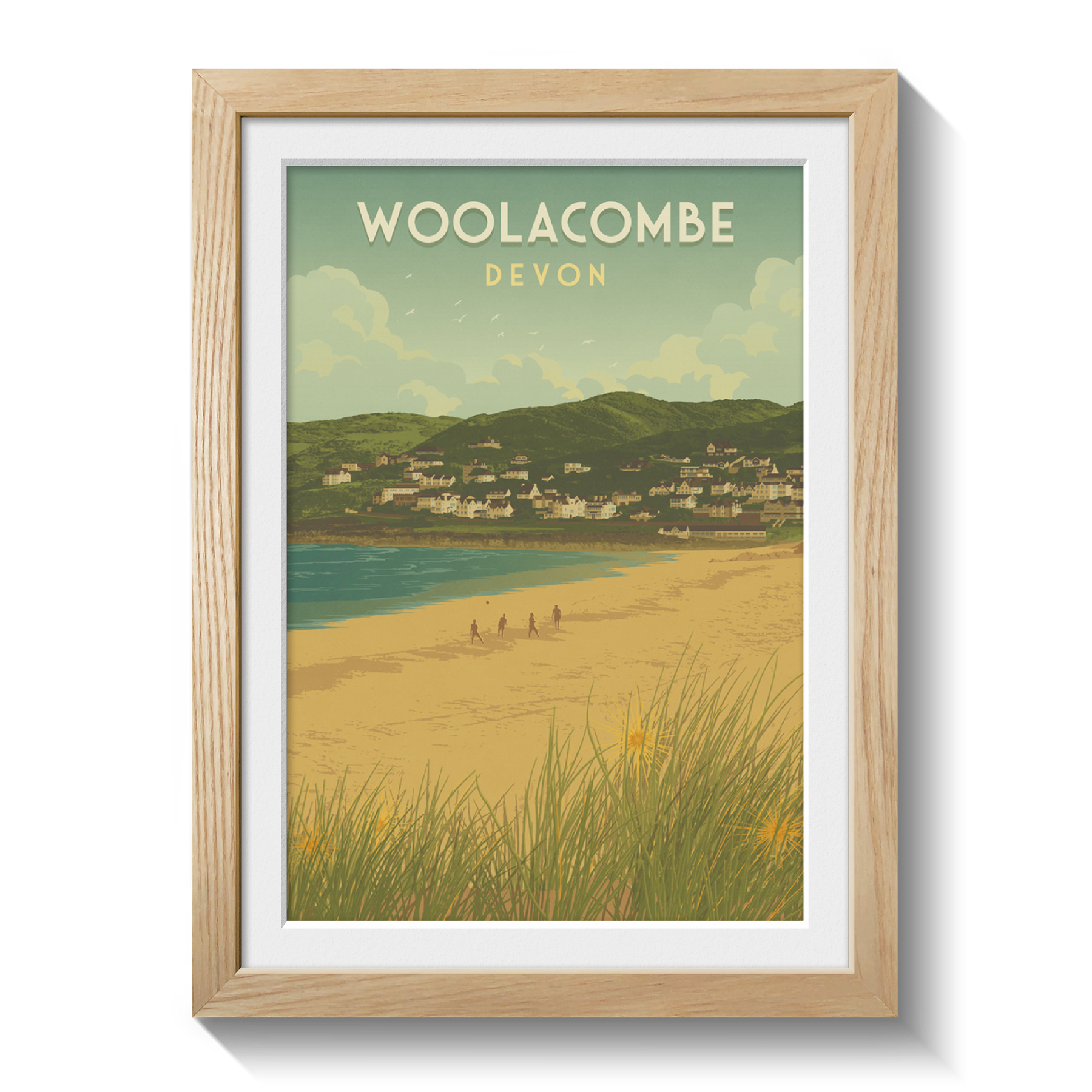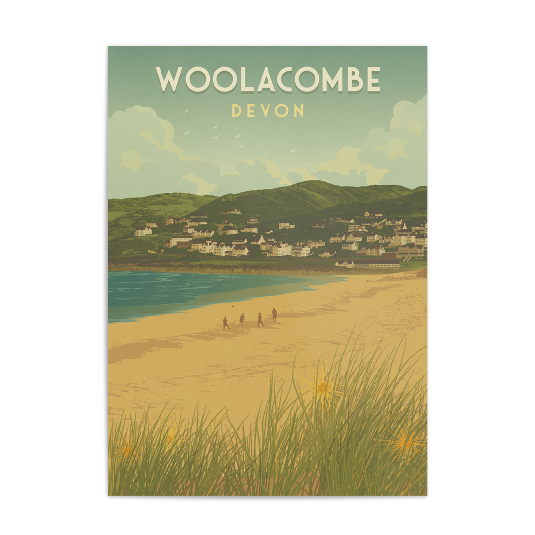 Original seaside travel poster of Woolacombe, Devon, situated on the Jurassic Coast, and famous for its sandy beach, surfing and picturesque village.