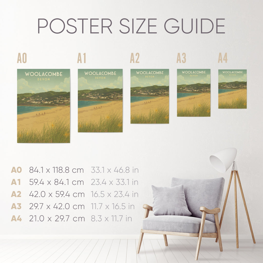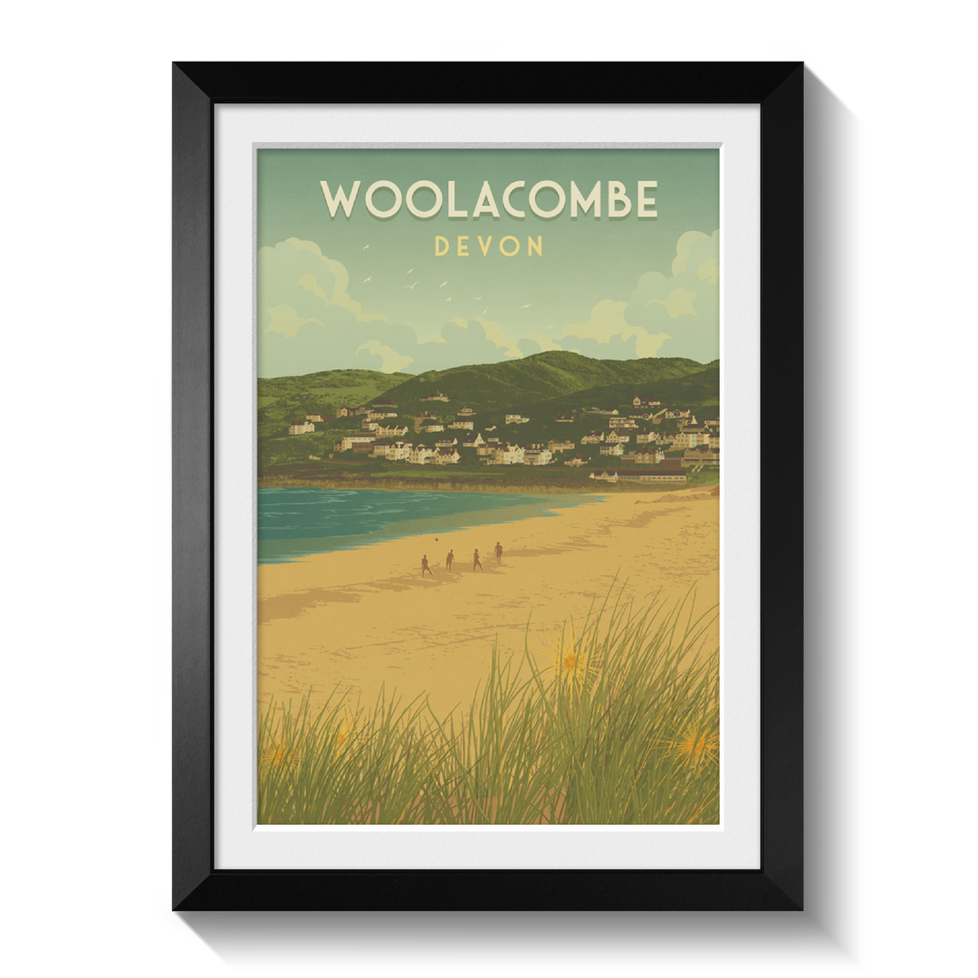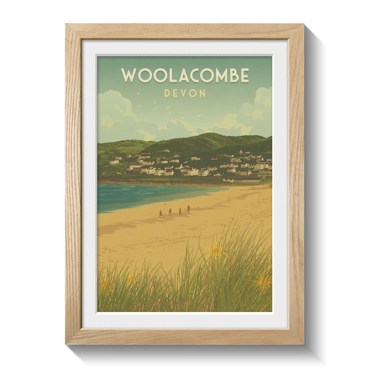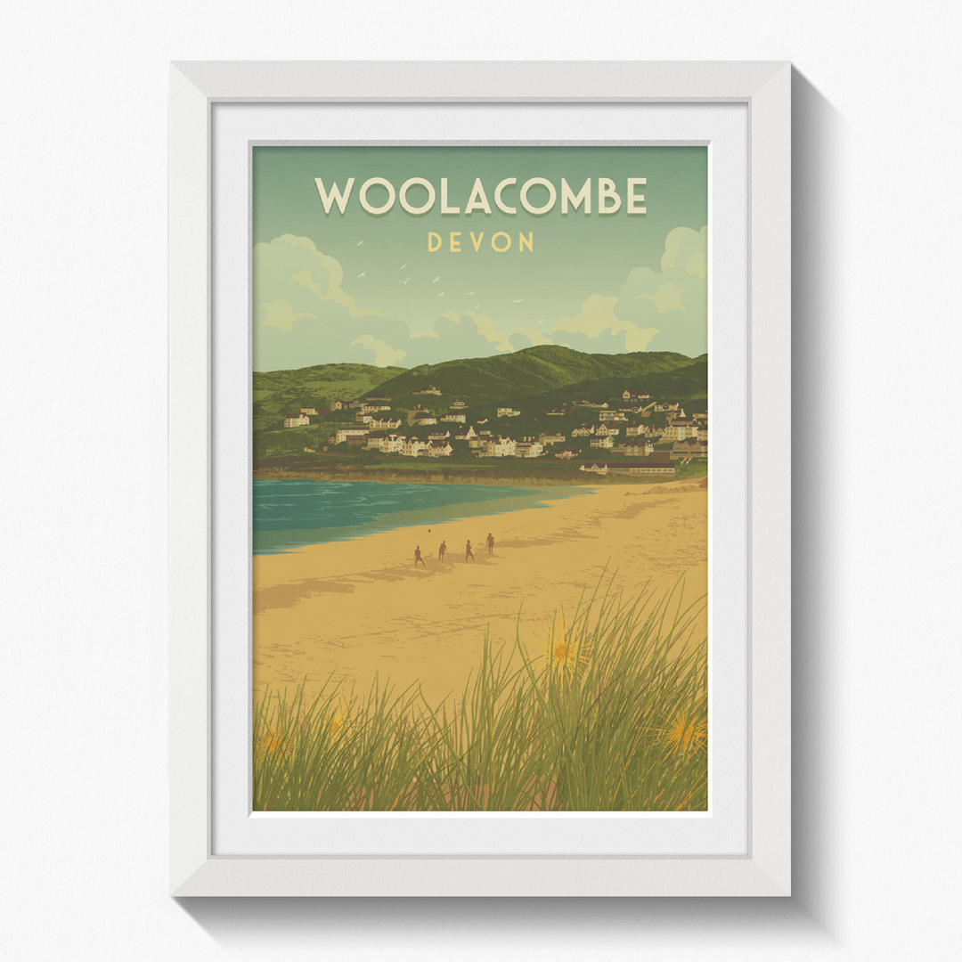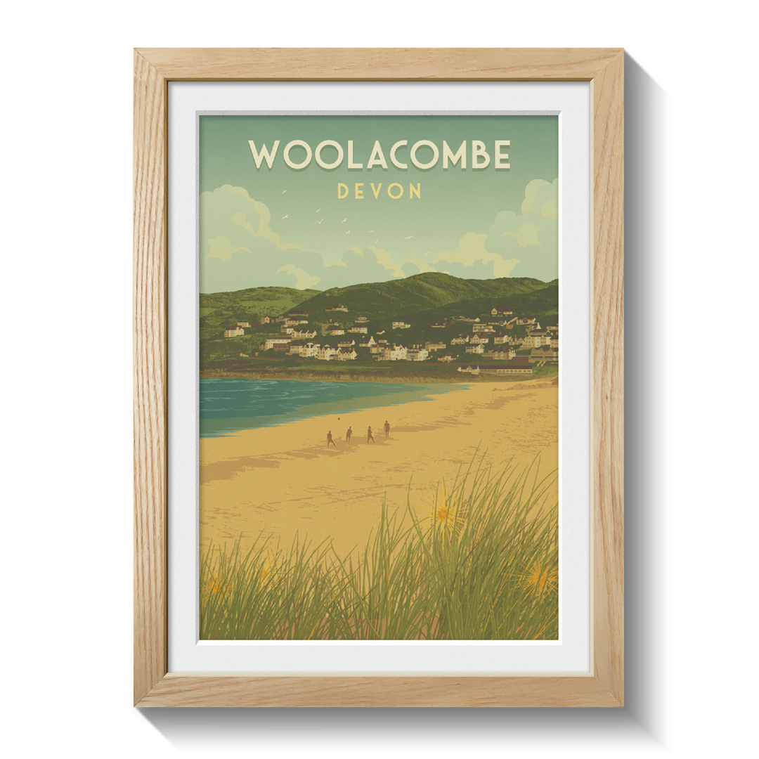 Original seaside travel poster of Woolacombe, Devon, situated on the Jurassic Coast, and famous for its sandy beach, surfing and picturesque village.